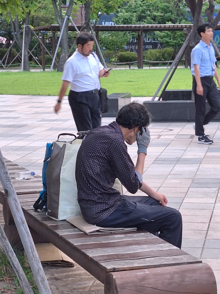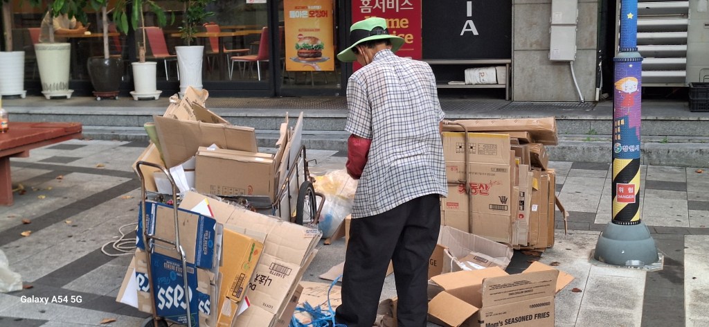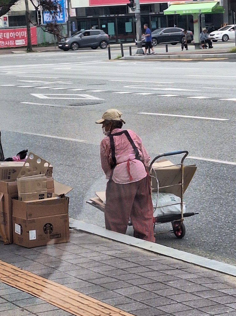 Il y a de l’argent en Corée mais pas pour les personnes âgées . Enfin, les premières retraites sont apparues seulement depuis les années 1990. Alors, depuis Séoul, on voit des petits vieux ramasser des cartons ou du plastique pour gagner quelques wons. La société ne les voit pas. Autrefois, les enfants s’occupaient des parents. C’est passé de mode et les parents ne veulent rien demander aux enfants dont certains connaissent le chômage. Pour les mamies, il y a aussi la prostitution aux abords de quelques parcs à Séoul. Incroyable. Et pourtant c’est cette génération qui a travaillé le plus dur avec seulement 3 jours de vacances dans l’année !!! On espère qu’ils avaient beau temps….