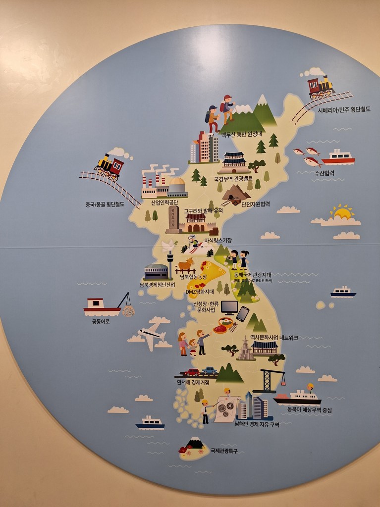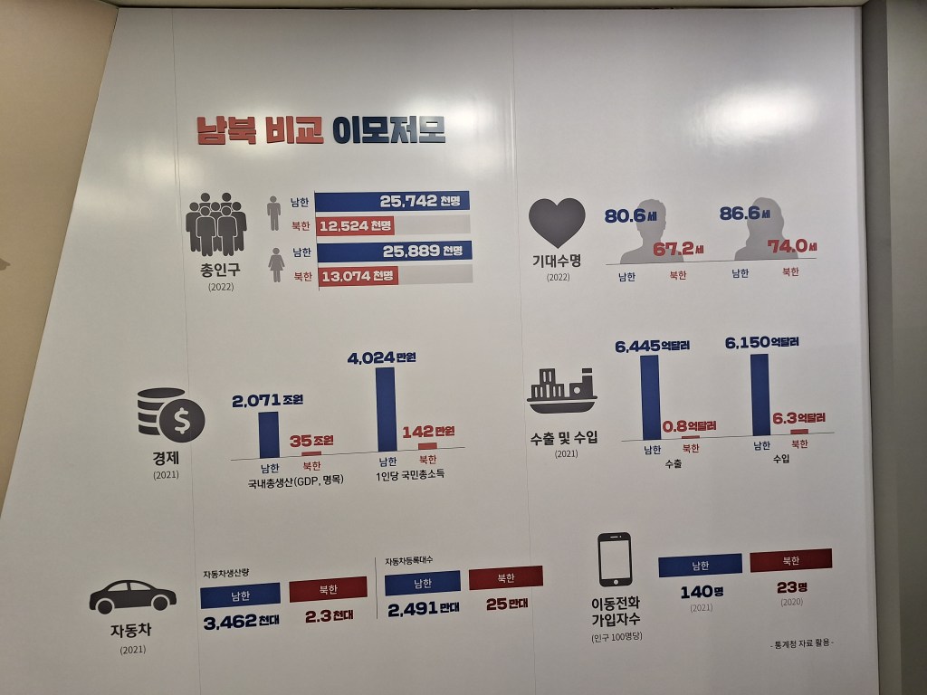La Corée réunifiée…l’observatoire de Dora est surmonté d’une colombe.Même si on ne lit pas le Coréen, cette carte est intéressante et facile à comprendre. En rouge, les chiffres de la Corée du Nord, en bleu ceux du Sud. De haut en bas, la population, l’espérance de vie (13 et 12 ans d’écart !), le PIB, les échanges commerciaux, l’industrie automobile et enfin celle du numérique. On se débrouille pas mal en coréen…Toujours les mêmes tragédies. Toujours la même Histoire.Et puis les artistes qui rêvent d’un même ciel, d’un même pays.