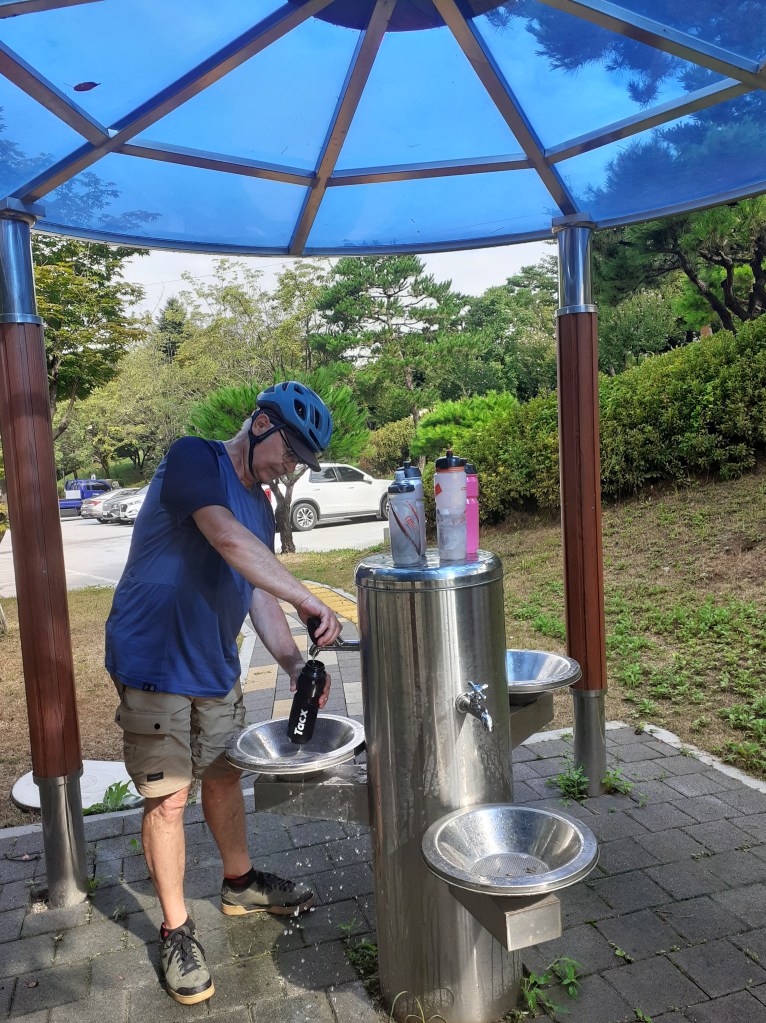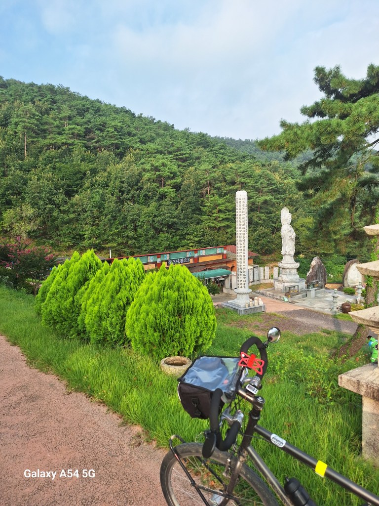 On traverse ensuite un parc national de toute beauté, le Worak San National Park. On avait presque oublié que la Corée c’est 70% de montagnes , et là, on est au cœur du sujet. Que de la grimpette. Même en partant tôt, on pédale jusqu’à environ 15 h pour une cinquantaine de kilomètres. On a remarqué qu’on met beaucoup plus de temps que celui prévu par notre GPS. S’il nous indique 4h pour 45 kms, on mettra facilement deux heures de plus.