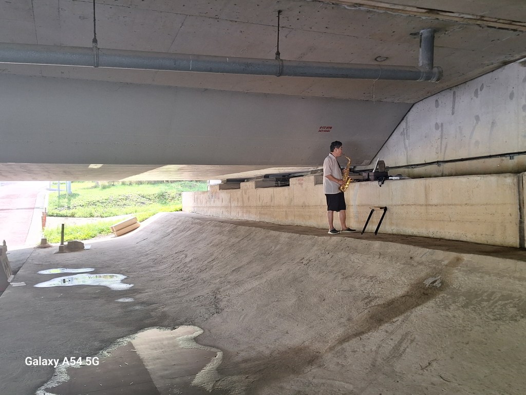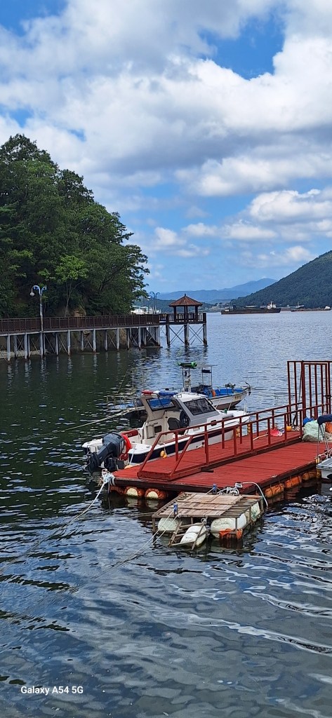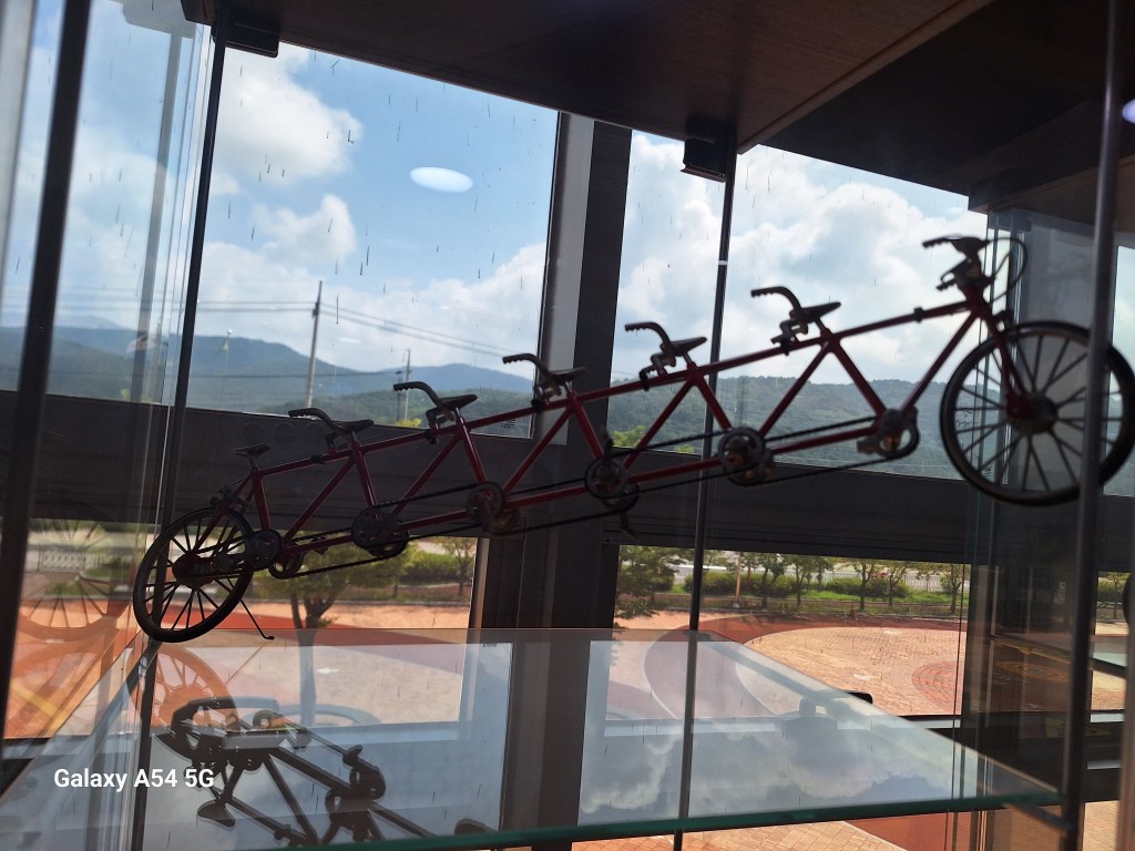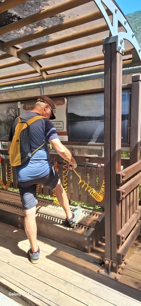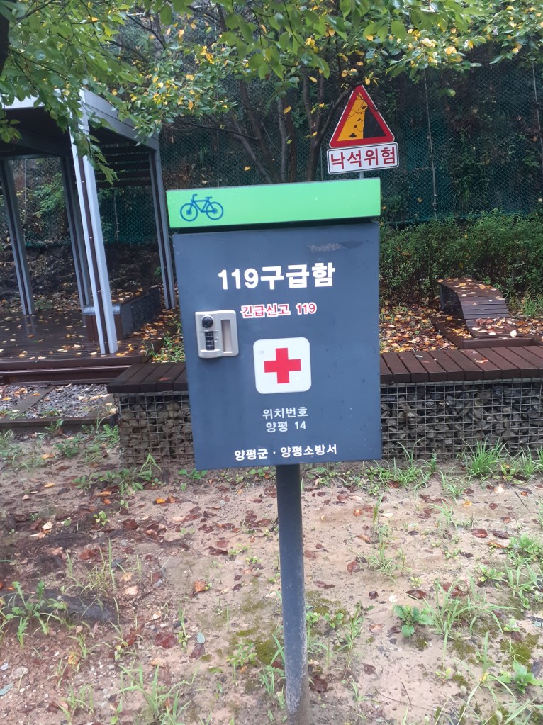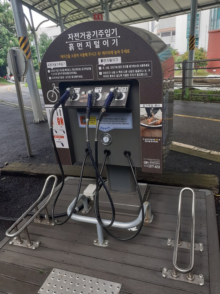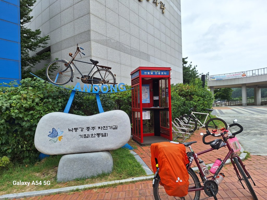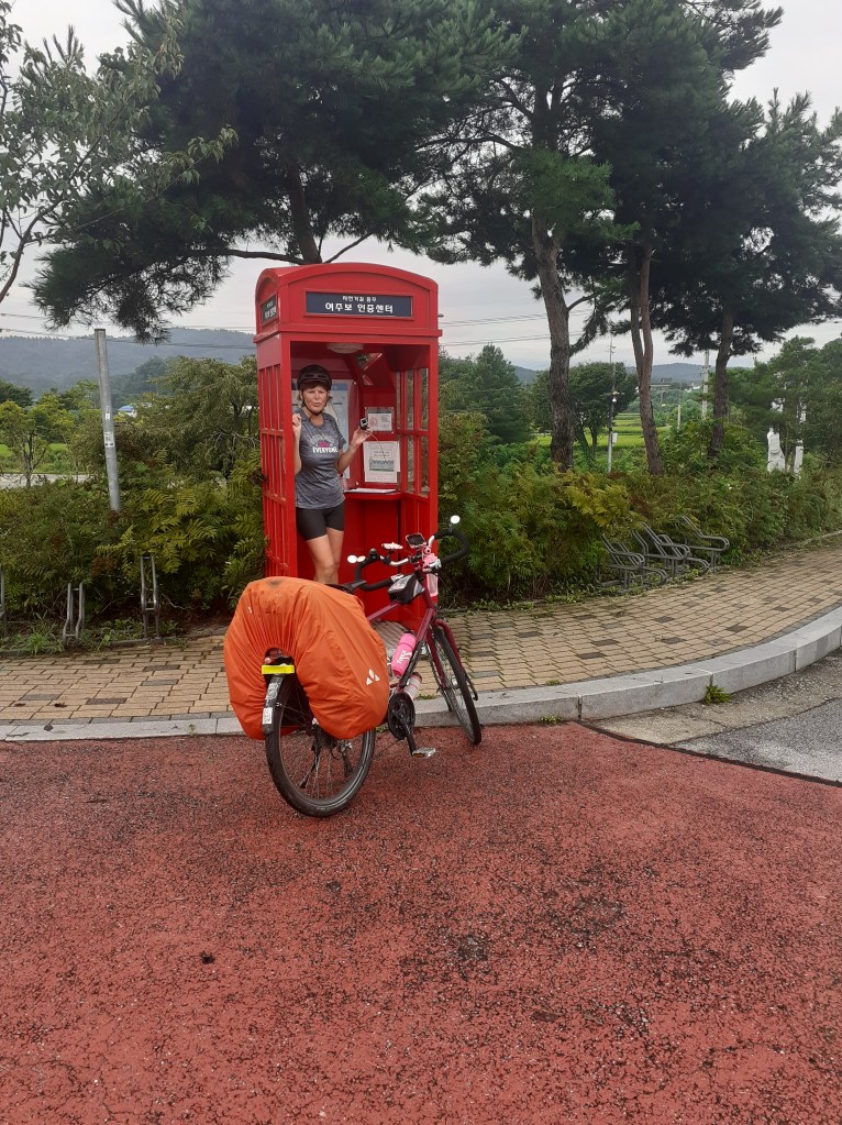 Quand on lit que la Corée est une destination pour le vélo, c’est vrai. De belles pistes cyclables, des tunnels uniquement pour nous , des aires de repos, des petites pharmacies de secours, des toilettes propres, des points d’eau, du matériel de réparation….de nombreuses gargotes où manger. Une sorte de passeport des 4 rivières s’achète au départ de la route, à composter de coups de tampon, tampons situés dans des cabines téléphoniques anglaises réparties tout au long des voies. L’idée est de certifier que la voie a bien été parcourue…un peu comme la credentiale des pèlerins. On n’a pas le carnet mais quand on voit une cabine, on y va de notre petit coup de tampon sur un bloc-notes. On s’amuse.