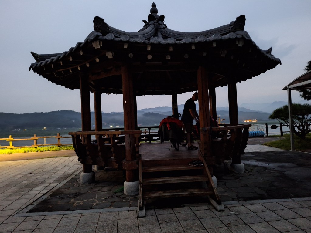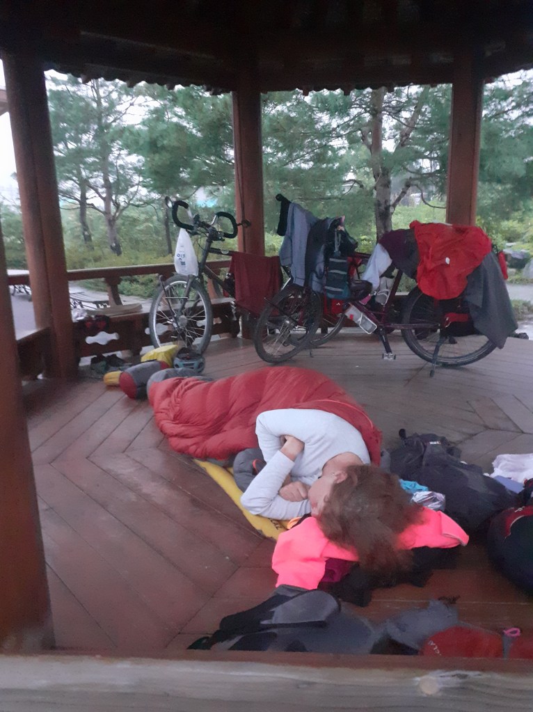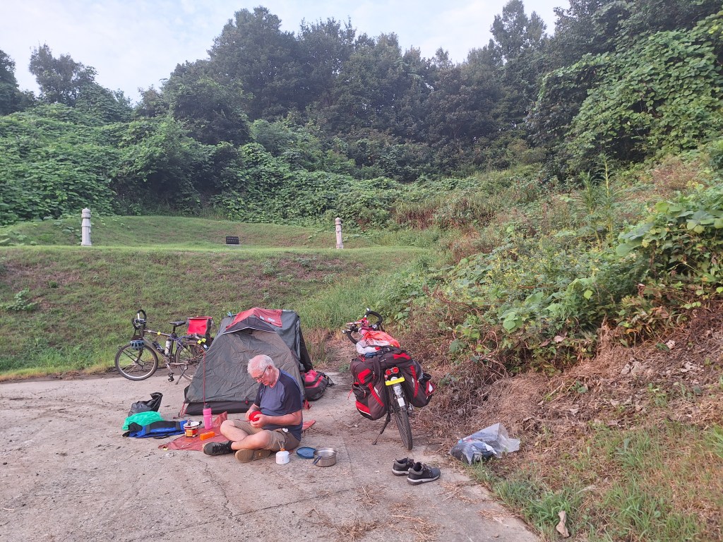 Notre chambre d’un soir. Il faisait tellement chaud qu’on n‘avait pas monté la tente. À côté, des équipements de sports qu’on trouve un peu partout dans le pays.Vue du bivouac.Pierre a déjà ramassé ses affaires. Les moustiques n’aiment pas les manches longues. Il est 6 h00. On va remballer. Les premiers Coréens viennent faire leur sport. Un autre bivouac. On se dit: c’est moche. Ils auraient pu se mettre sur l’herbe. Mais on pense que ce sont des stèles funéraires et on ne veut froisser ni les gens d’ici-bas, ni les gens de l’au-delà. Mieux vaut garder de bons rapports avec tout le monde. On s’est mis là pour la vue !