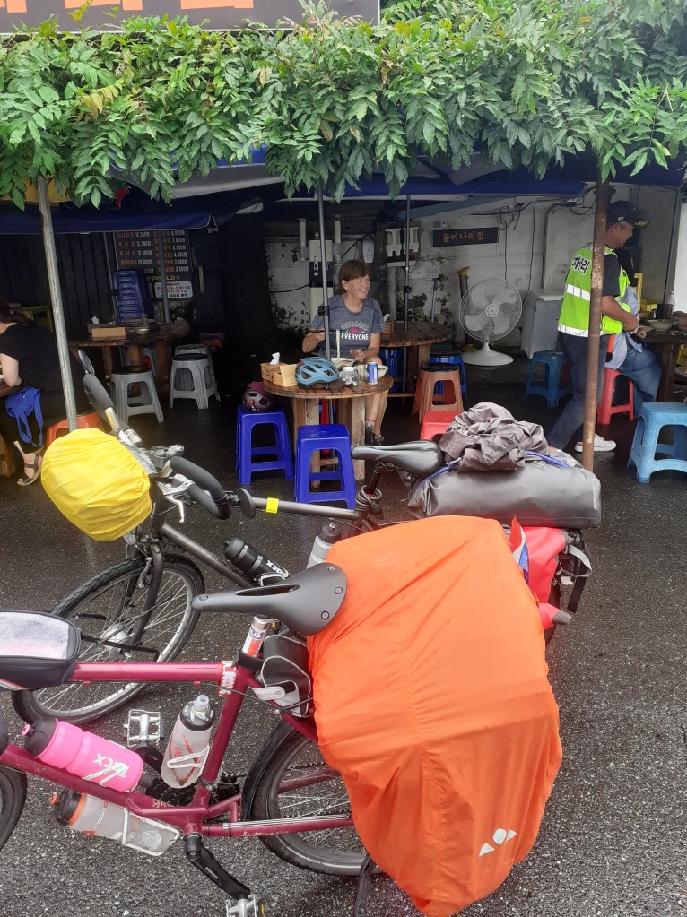 Les premiers coups de pédale dans les grandes villes sont toujours source de stress et d’agression pour nos sens. On quitte le calme, la lenteur, le silence, la sécurité pour se retrouver dans des embouteillages, le bruit, les gens, les pots d’échappement, des routes à plusieurs voies dont parfois on peine à comprendre par où on va bien pouvoir passer, les chaussées à partager avec les automobilistes, des feux, des directions qu’on ne peut pas prendre parce que c’est interdit aux vélos ou bien parce qu’on est gênés pour tourner . Mais jamais en Corée, il n’y a eu le moindre souci avec un conducteur. Très respectueux. Mais dès qu’on a trouvé l’hébergement, on range les vélos, on est heureux de marcher, de prendre le bus ou le métro si besoin.