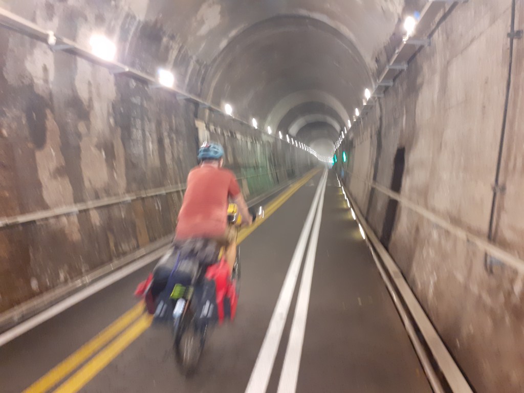 Je ne peux pas du tout conduire mon vélo car, comme on n’a avec nous qu’une sacoche puisque les autres nous attendent à Busan, je n’ai pas la grande sacoche transversale sur laquelle m’asseoir. Et puis en pleine côte, l’exercice aurait été difficile. Le long d’une voie rapide à deux fois trois voies, sous la pluie bien sûr – sinon ce serait moins drôle – avec des voitures qui foncent à toute allure….la fête.