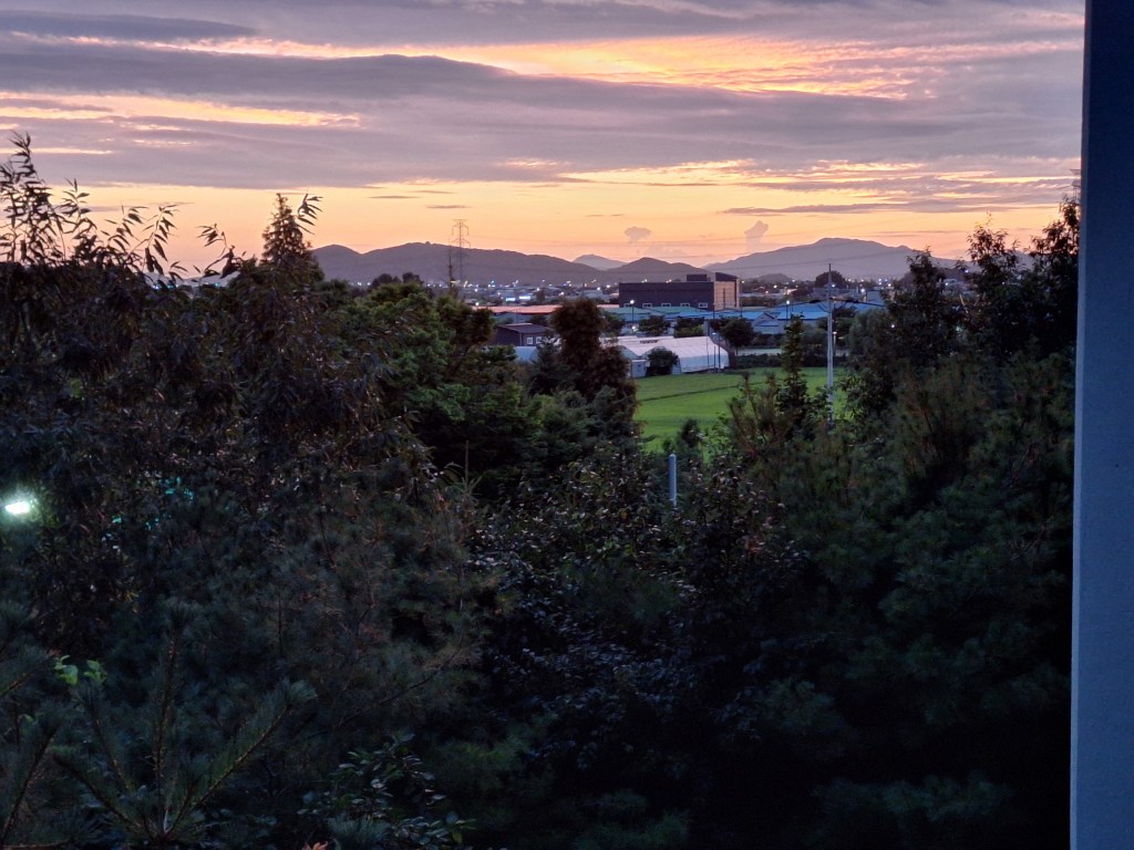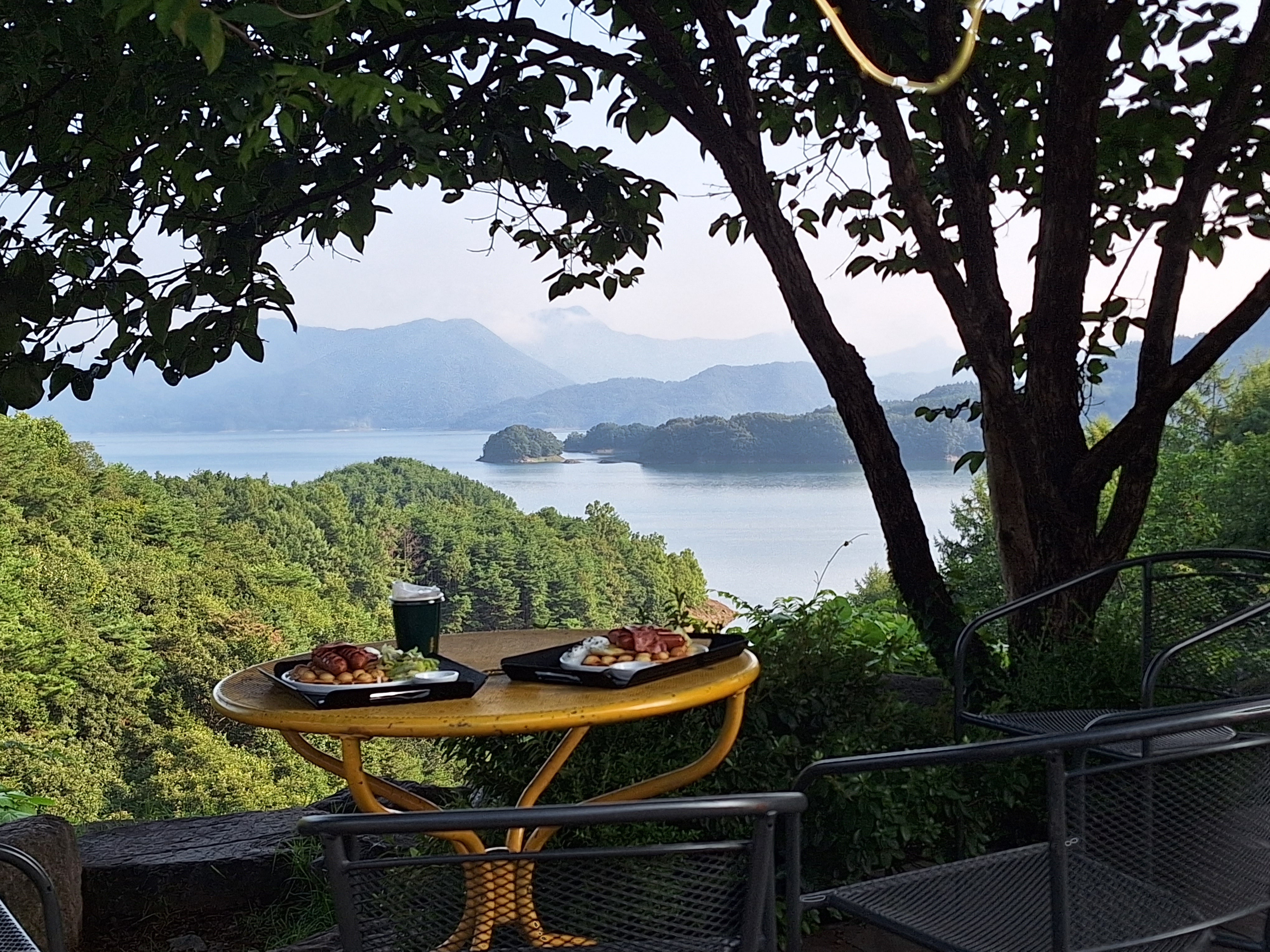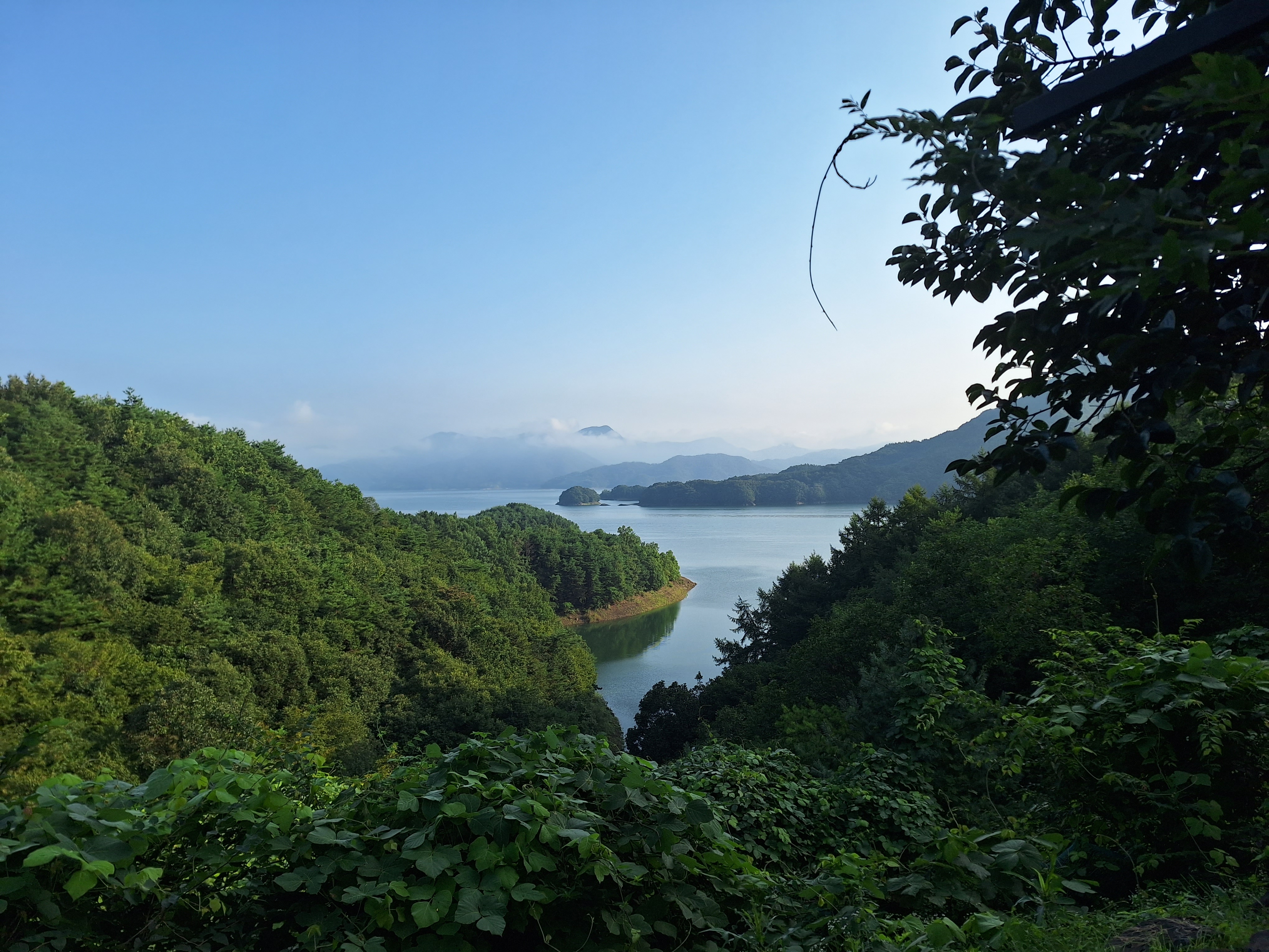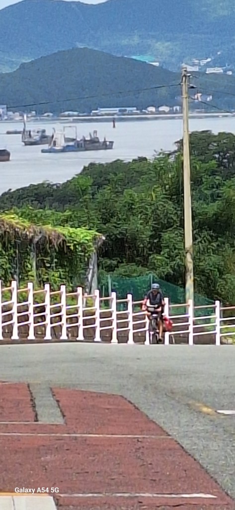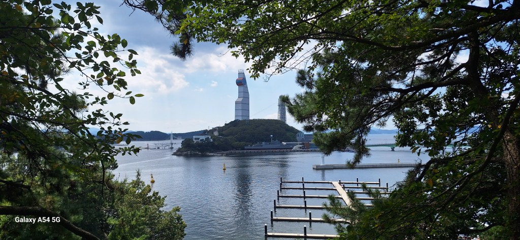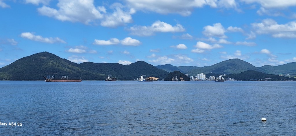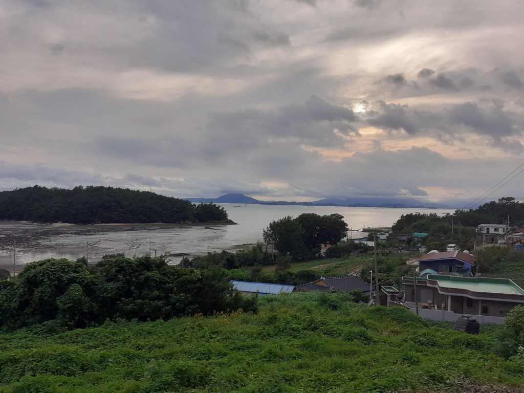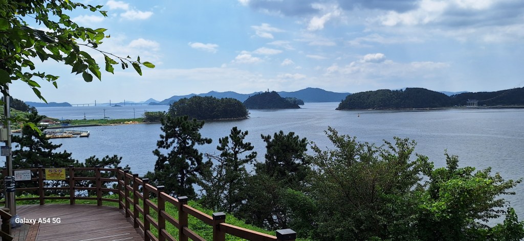 Bon, allez, depuis le jour de la selle cassée, deux très belles journées auprès de la baie de Jinhae avec vue sur des îles.