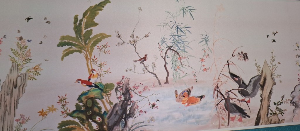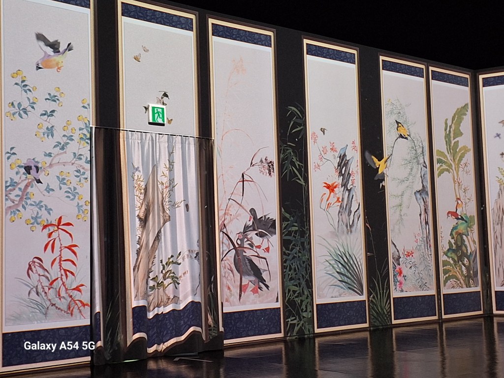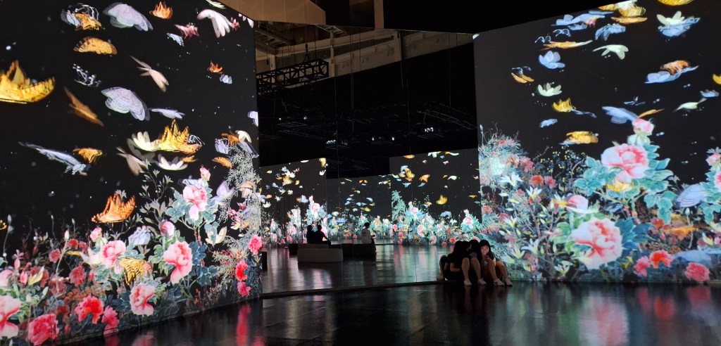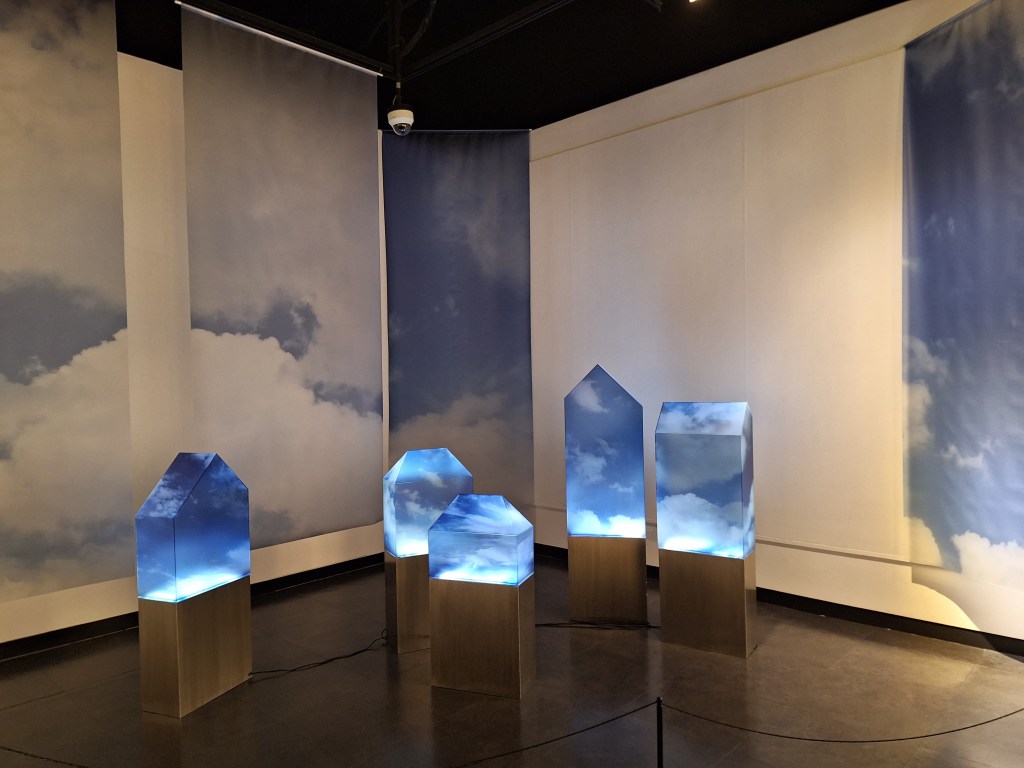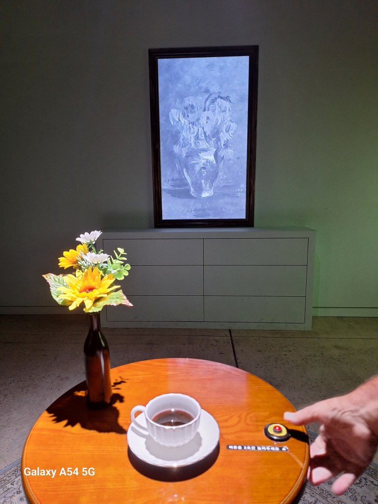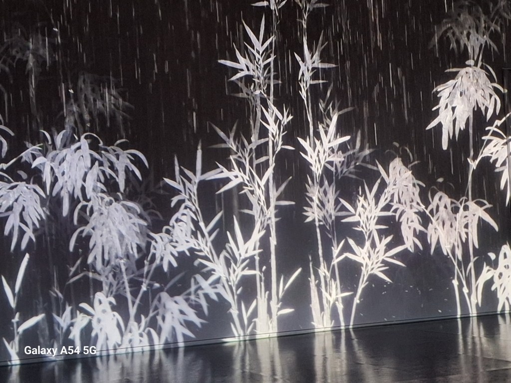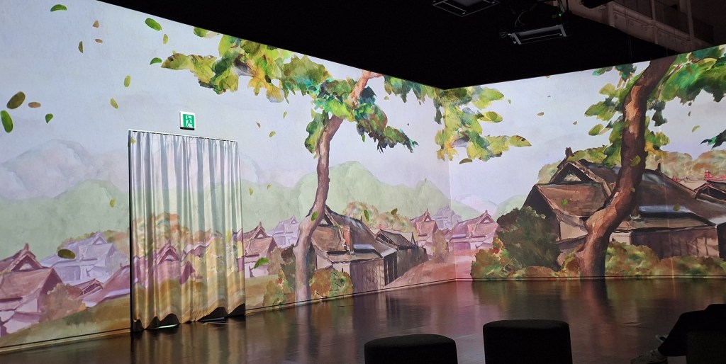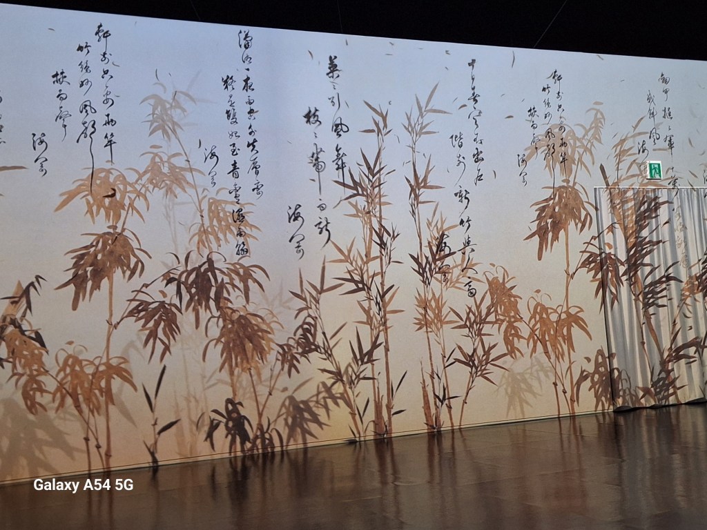 Dans l’une des immenses salles, une musique envoûtante accompagne les changements de tableaux sur tous les murs.