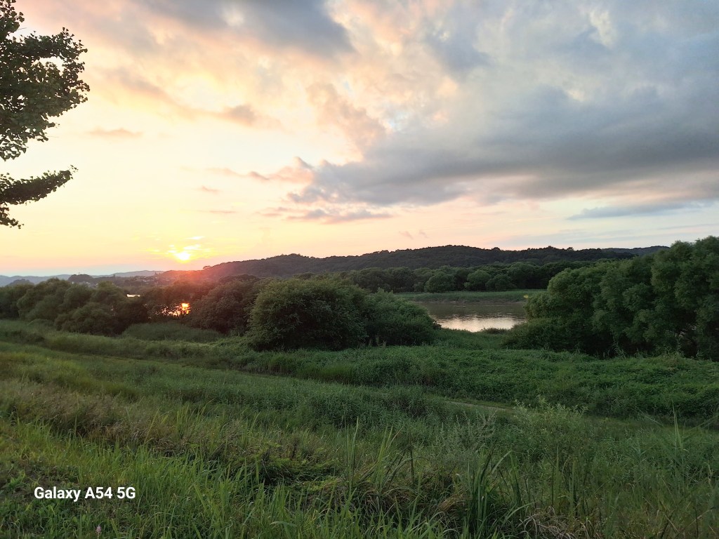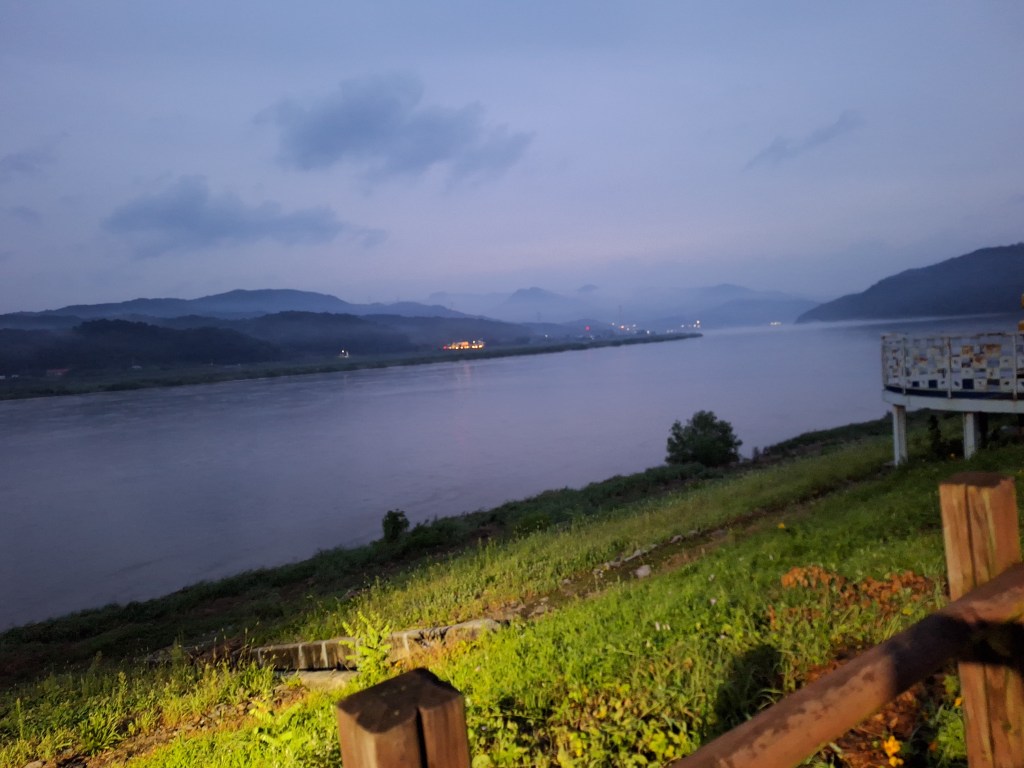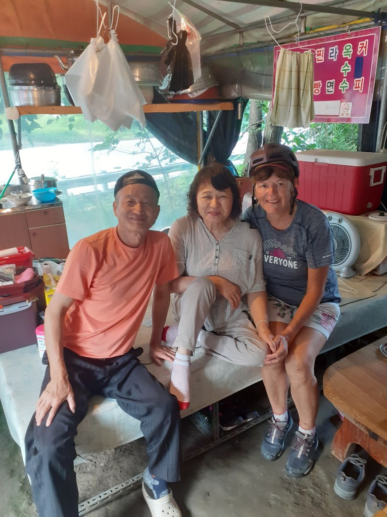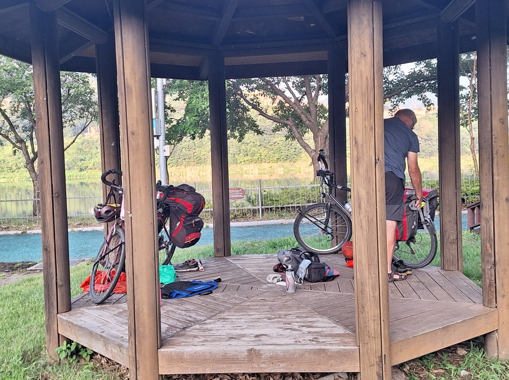 Quand on a quitté la route principale pour trouver un coin tranquille, on suivait une rivière depuis un moment mais on ne s’attendait pas à trouver des maisons de pêcheurs sur une boucle de cette rivière. Ils y ont passé la nuit et nous voyaient sûrement.Au menu : soupe bien épicée….on transpire encore un peu plus..Et le lendemain. Il est 5h30. On préfère rouler avant les fortes chaleurs.Autre bivouac. À côté des sanitaires, dans un parc aux nombreux points d’eau, la lessive sèche sur l’herbe. Les gens qui passent nous disent bonjour.Et toujours de très belles vues sur la rivière Han.Ça sent le départ.Un dernier coup d’œil avant le départ.