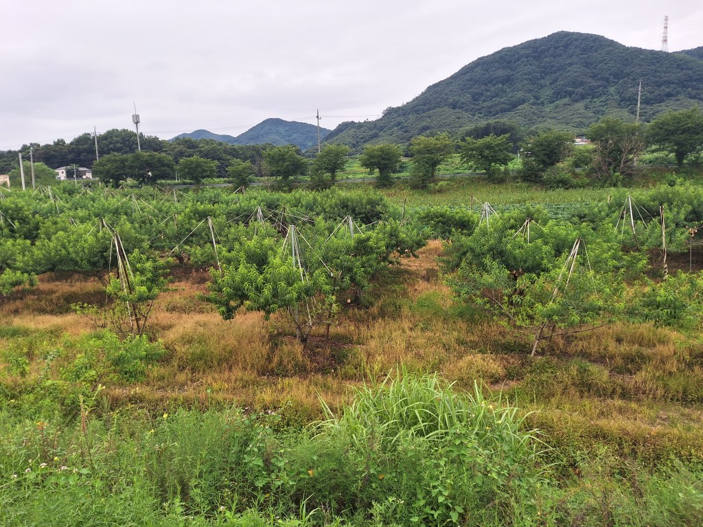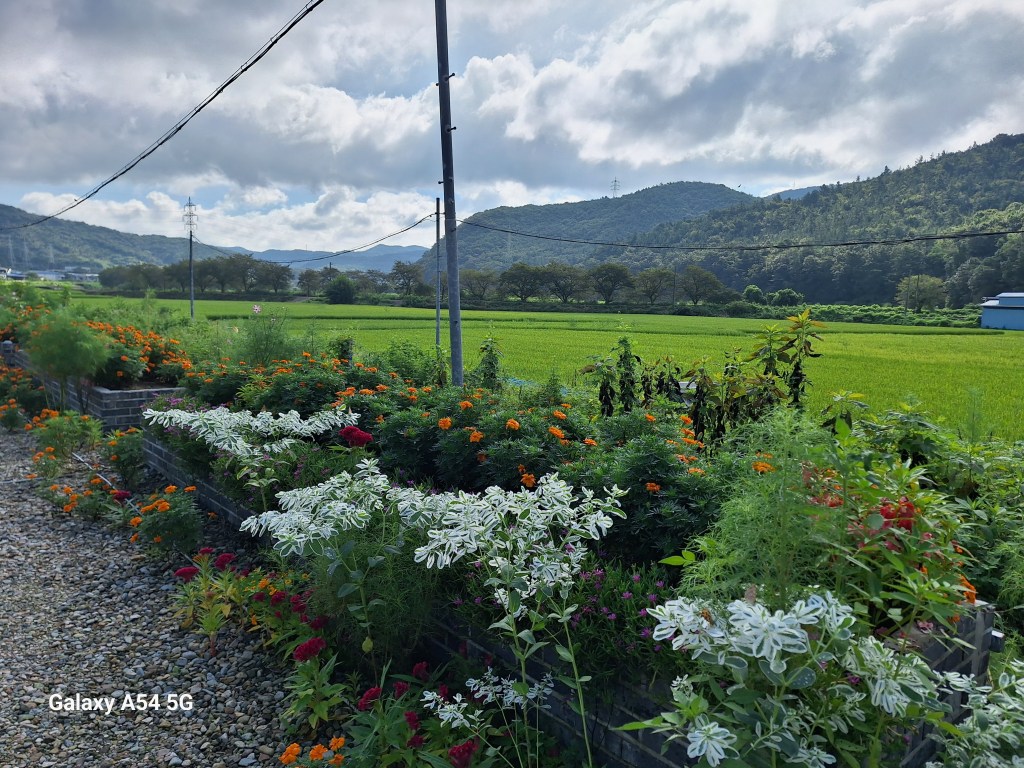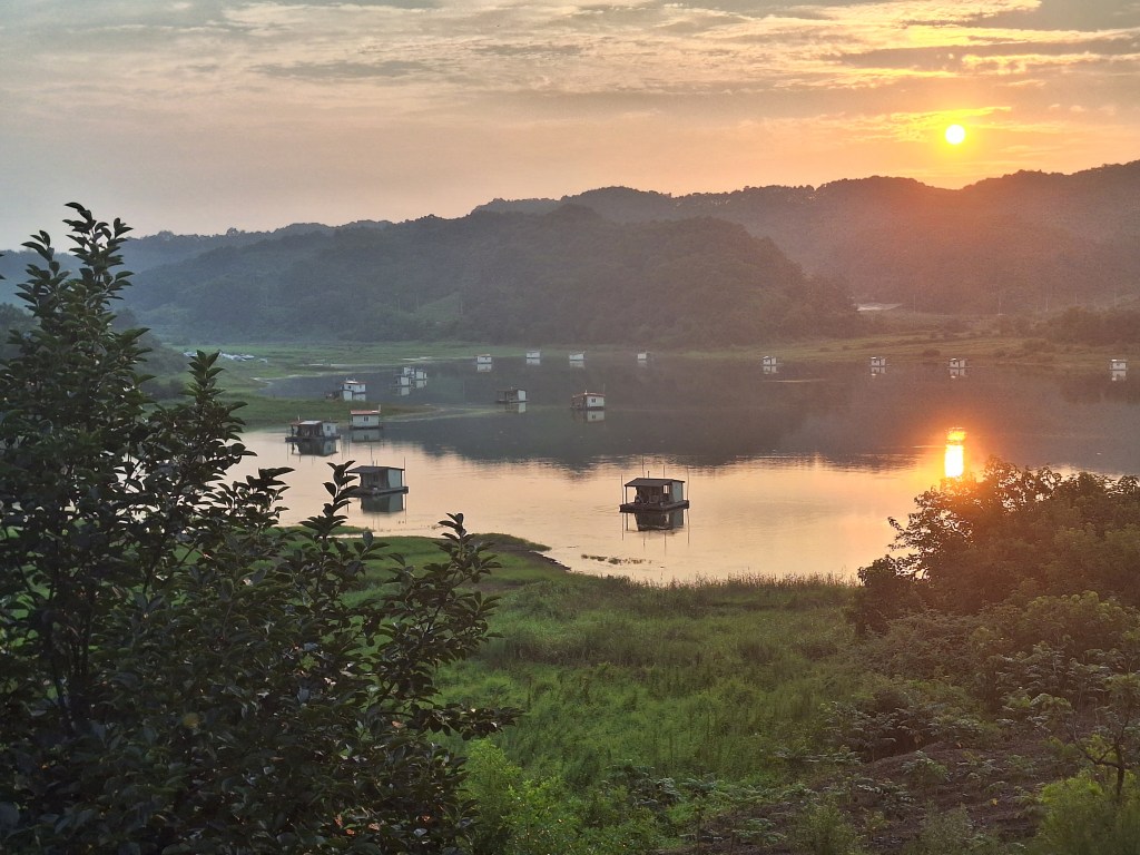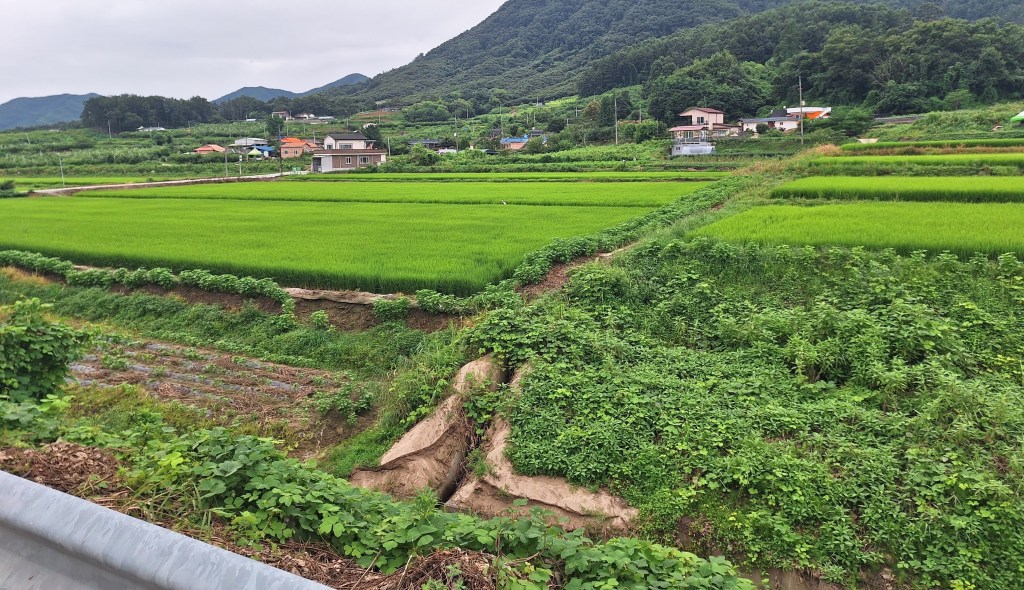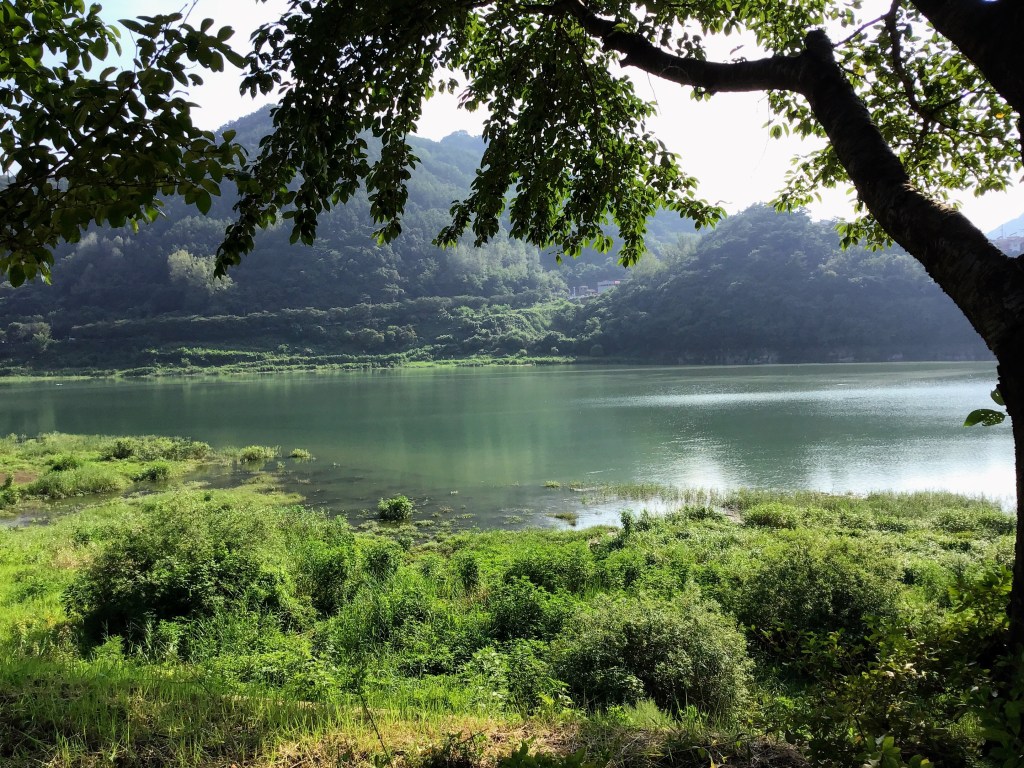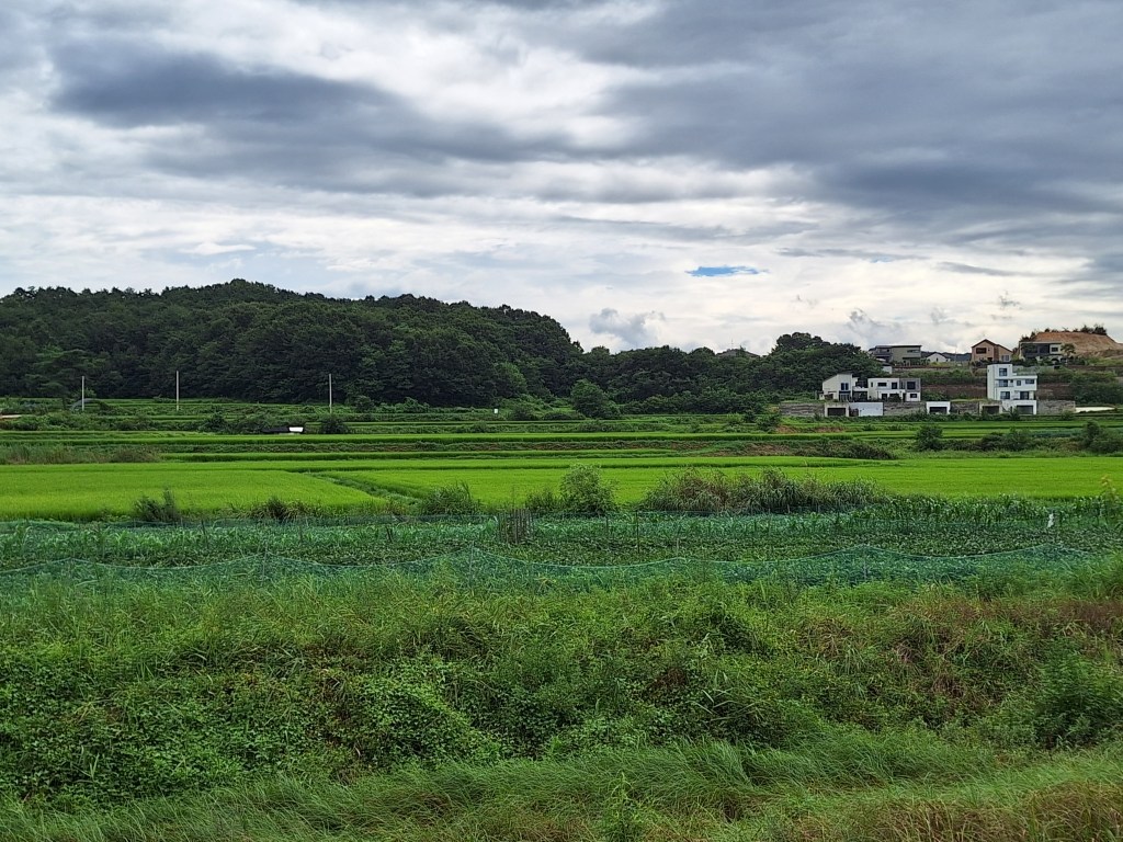 Les paysages sont de plus en plus beaux : toujours la rivière Han, ses pêcheurs, ses ponts. De l’autre côté, des champs de maïs, de piment, des oignons et de l’ail, des vergers, des plantes qui ressemblent à des haricots mais qui n’en sont pas, et maintenant des rizières.