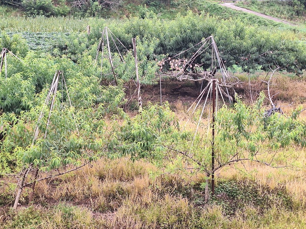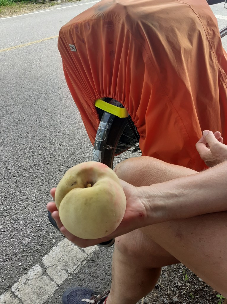 On s’est arrêtés pour comprendre. Ce sont bien des pêchers ……avec un tuteur au centre d’où partent des bandes qui relèvent les branches.Et chaque fruit est enveloppé pour le protéger peut-être du soleil ? Des insectes ? Et les pêches sont énormes. Pas très bonnes.Scène de la vie quotidienne.