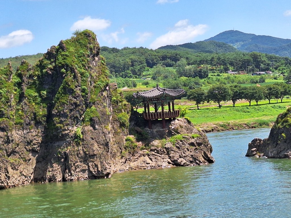 Voilà. On n’a jamais trouvé mieux comme carte ! Mais on se débrouille…Aujourd’hui on est arrivés au-dessus de l’étiquette en rouge : Saejae Bike Path. On est à Danyang, point rouge au départ de la rivière qui forme de grands méandres. En fait, on a fait un petit écart pour venir à Danyang car la région est magnifique et beaucoup de sites à visiter .