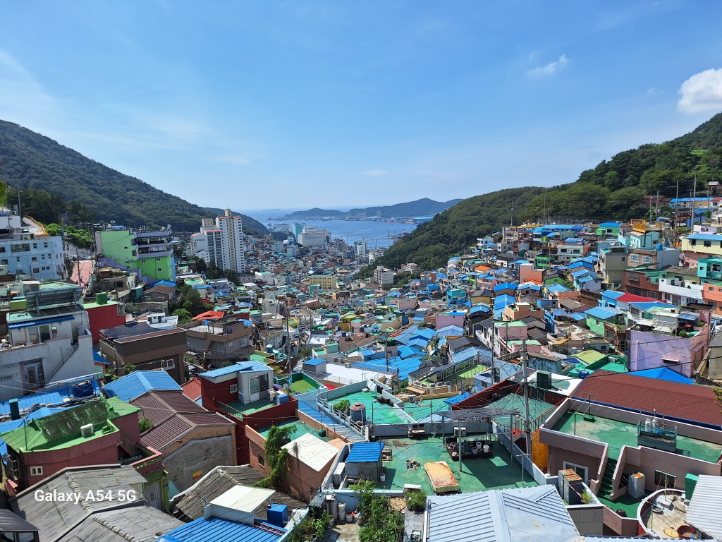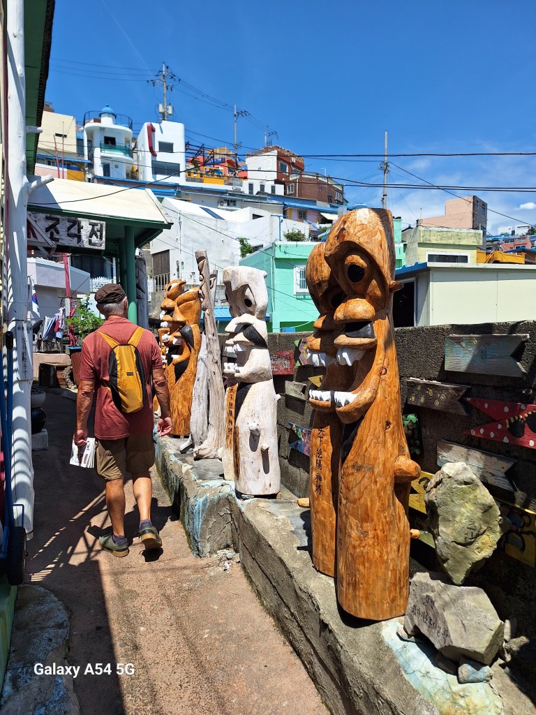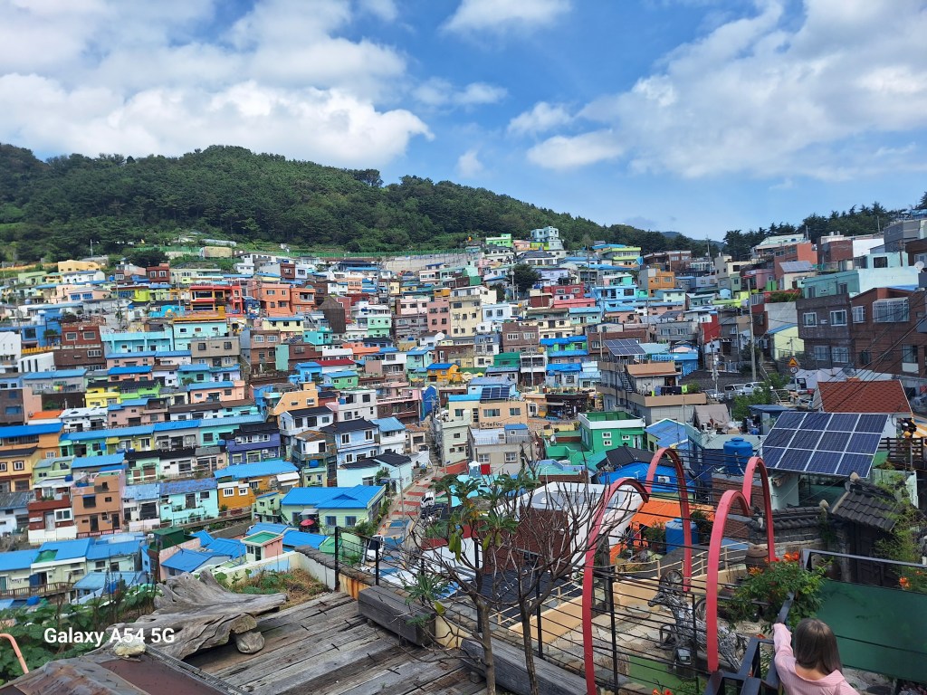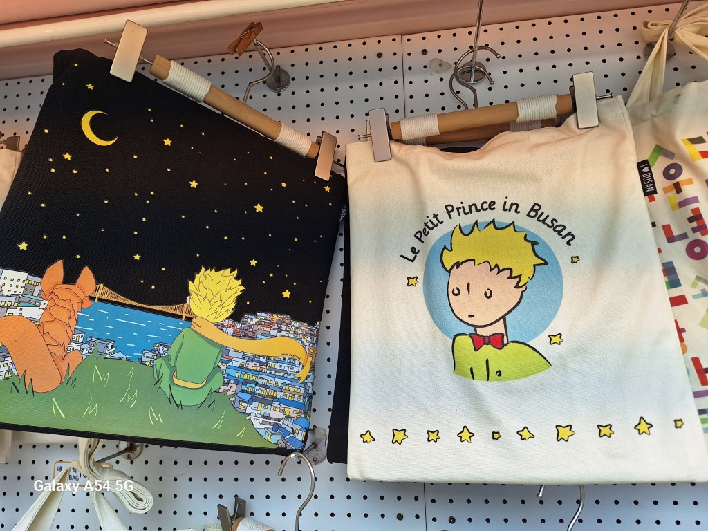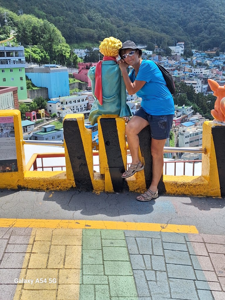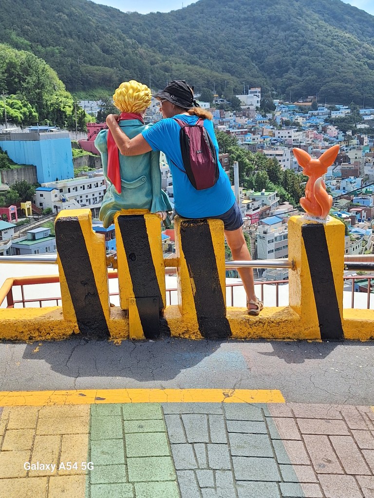 Ville incroyable. D’un côté de grands axes de circulation où les grosses voitures coréennes règnent en maître, des arrondissements hyper modernes avec néons et immeubles futuristes, puis des quartiers populaires aux petites rues avec très peu de voitures, pleins de vie comme le nôtre , et un quartier célèbre, Gamcheon, tout en couleurs où habitaient autrefois les réfugiés de la guerre de Corée dans des bidonvilles réhabilités en 2009 par les villageois eux-mêmes ainsi que des artistes. Aujourd’hui c’est un incontournable pour les touristes où on retrouve avec surprise un personnage que le monde entier lit et nous envie…
