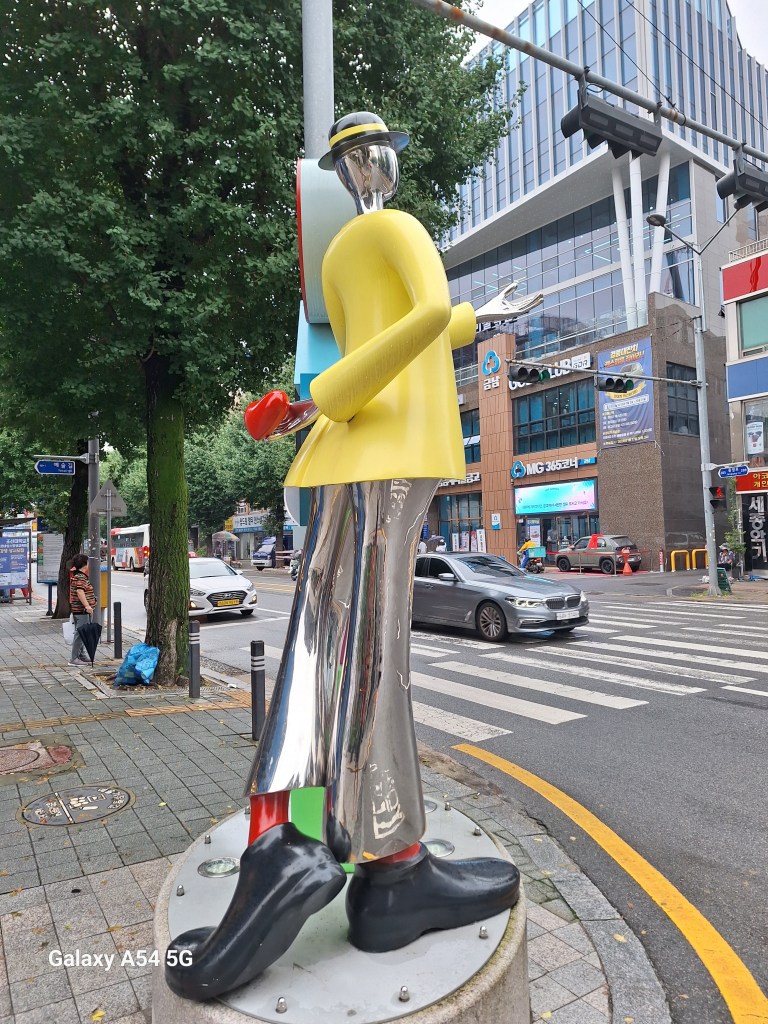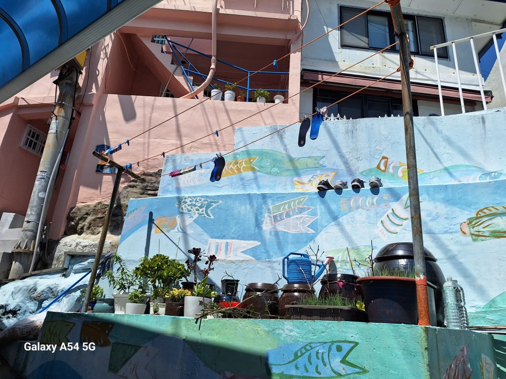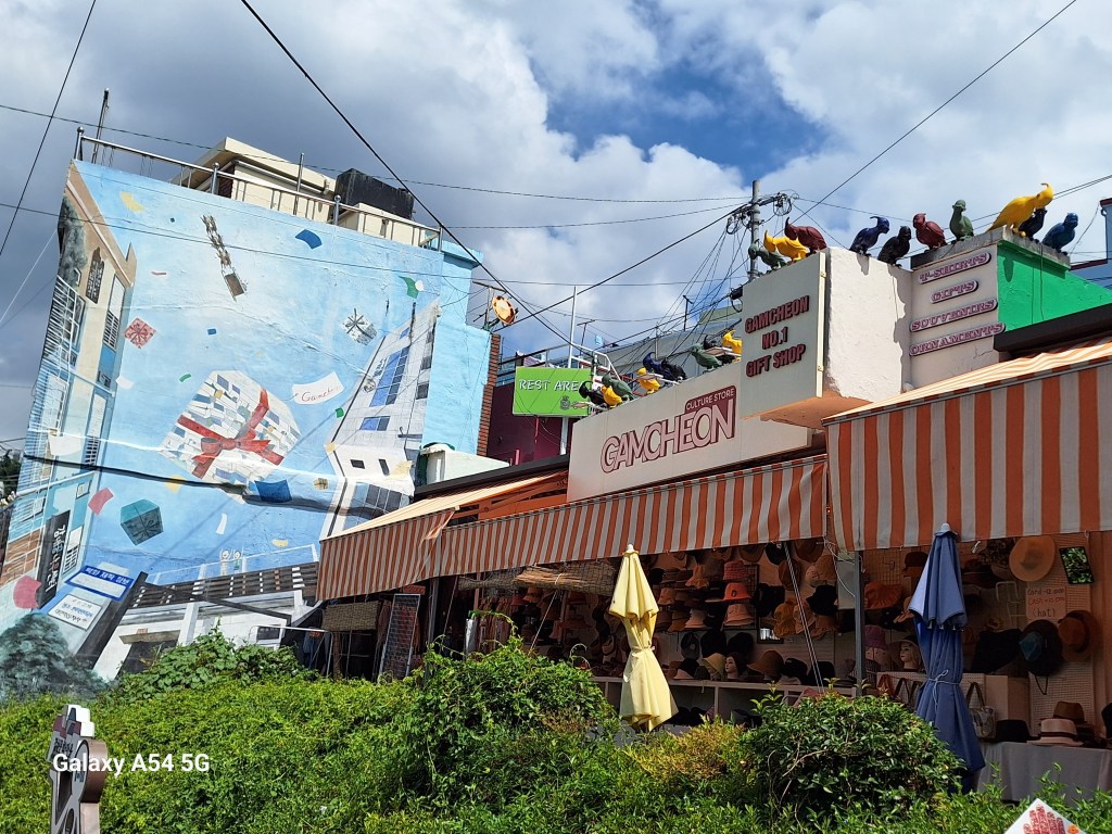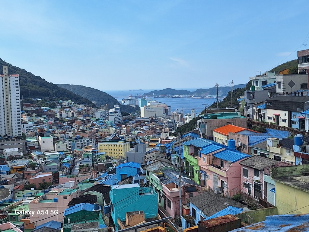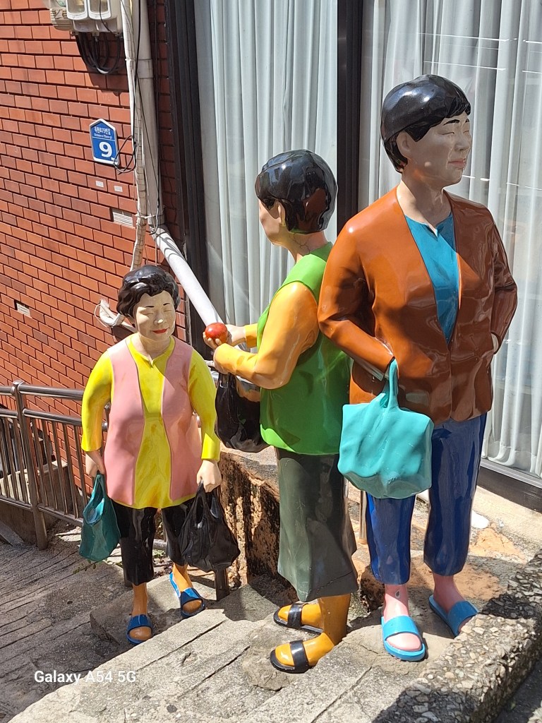 Ville incroyable. D’un côté de grands axes de circulation où les grosses voitures coréennes règnent en maître, des arrondissements hyper modernes avec néons et immeubles futuristes, puis des quartiers populaires aux petites rues avec très peu de voitures, pleins de vie comme le nôtre , et un quartier célèbre, Gamcheon, tout en couleurs où habitaient autrefois les réfugiés de la guerre de Corée dans des bidonvilles réhabilités en 2009 par les villageois eux-mêmes ainsi que des artistes. Aujourd’hui c’est un incontournable pour les touristes où on retrouve avec surprise un personnage que le monde entier lit et nous envie…