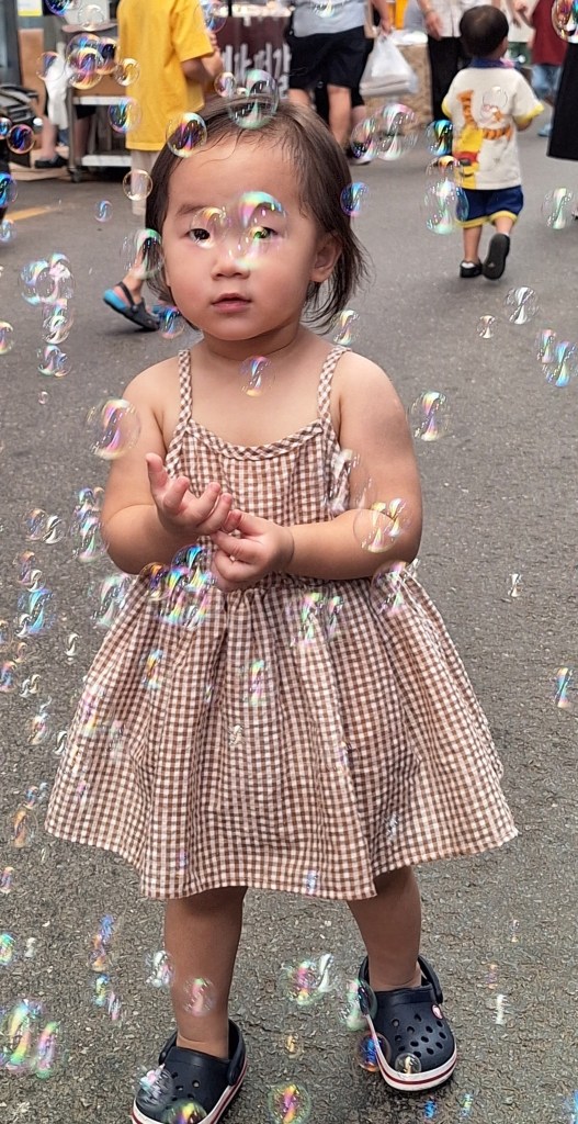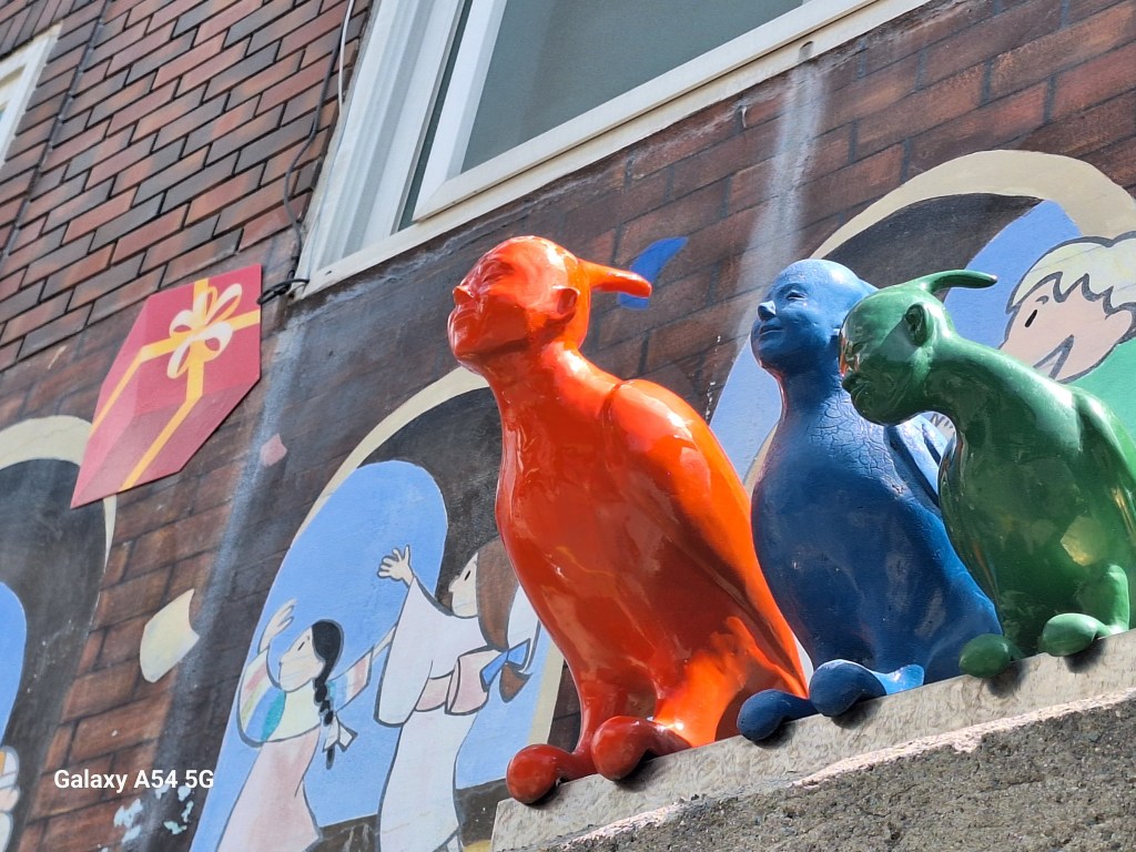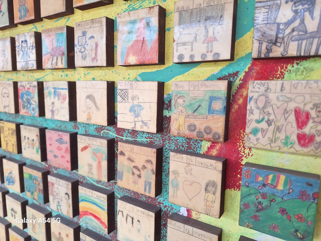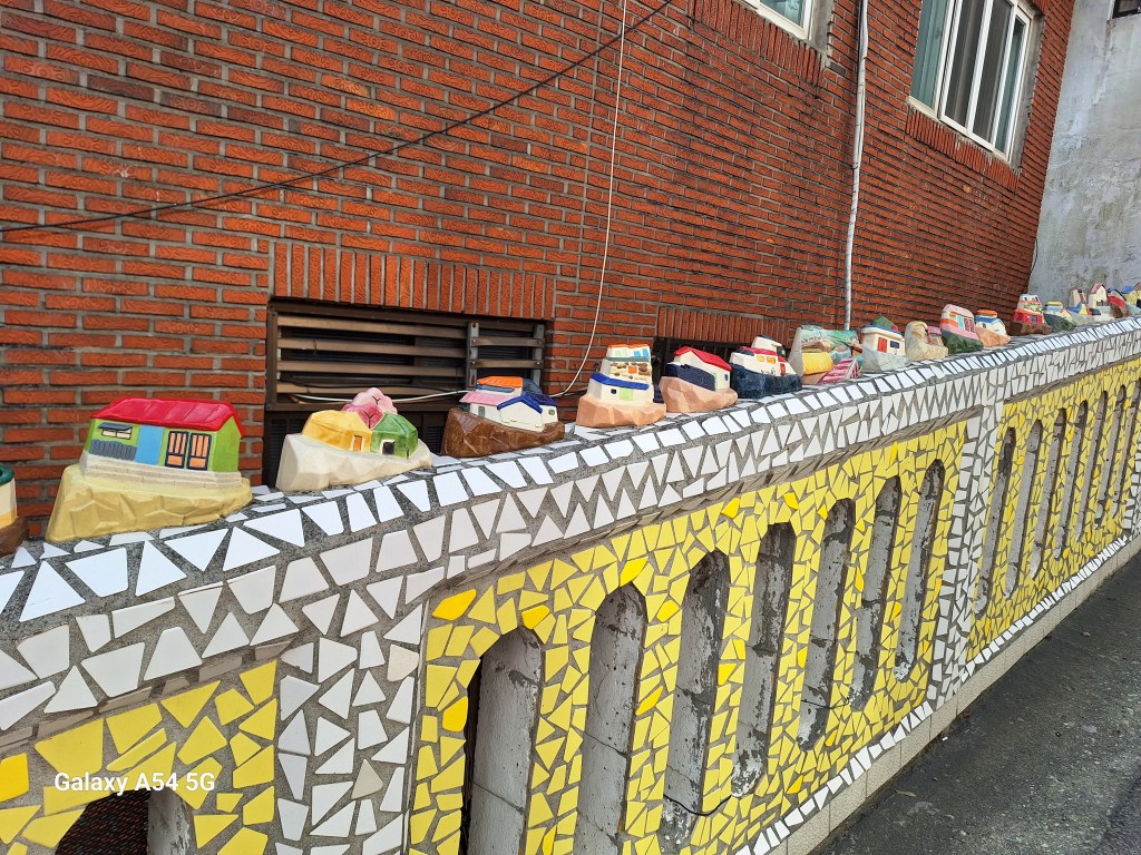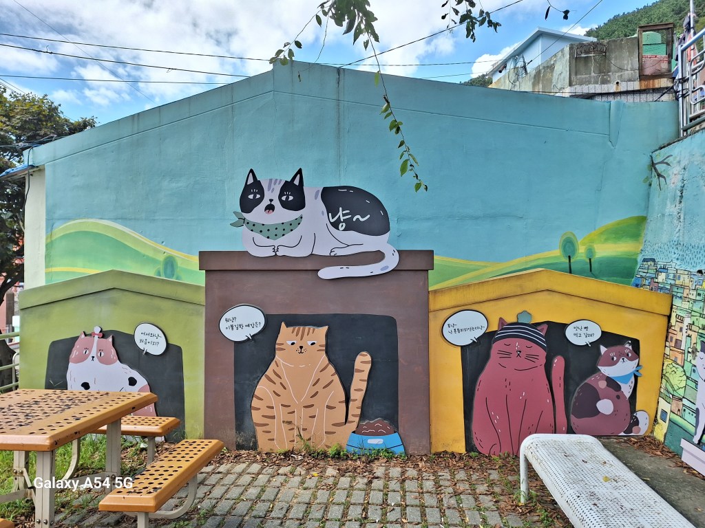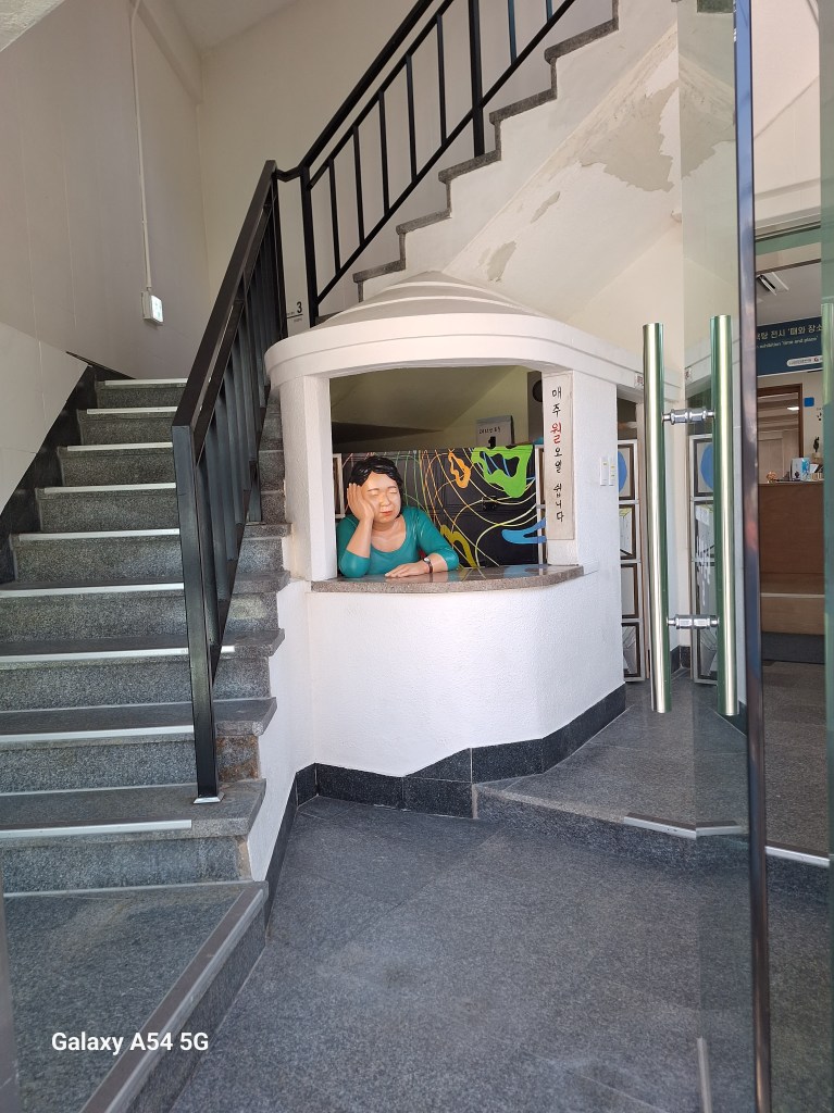 Ville incroyable. D’un côté de grands axes de circulation où les grosses voitures coréennes règnent en maître, des arrondissements hyper modernes avec néons et immeubles futuristes, puis des quartiers populaires aux petites rues avec très peu de voitures, pleins de vie comme le nôtre , et un quartier célèbre, Gamcheon, tout en couleurs où habitaient autrefois les réfugiés de la guerre de Corée dans des bidonvilles réhabilités en 2009 par les villageois eux-mêmes ainsi que des artistes. Aujourd’hui c’est un incontournable pour les touristes où on retrouve avec surprise un personnage que le monde entier lit et nous envie…