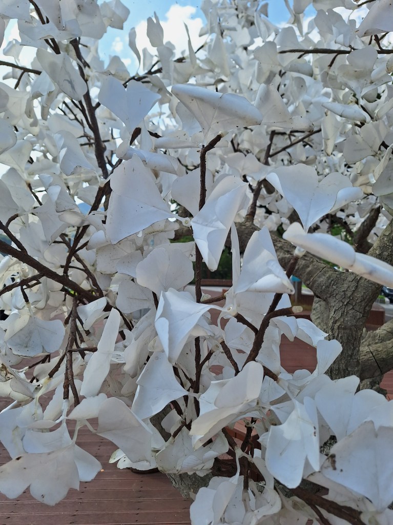 De loin on trouvait cet arbre étrange.Les feuilles sont en papier. On trouvait ça surprenant…