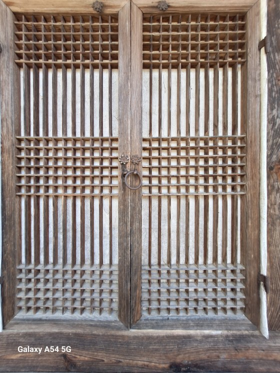 Portes faites de lattes de bois derrière lesquelles sont collées des feuilles de papier de Corée. On se casse moins la tête pour l’arrière de la maison.