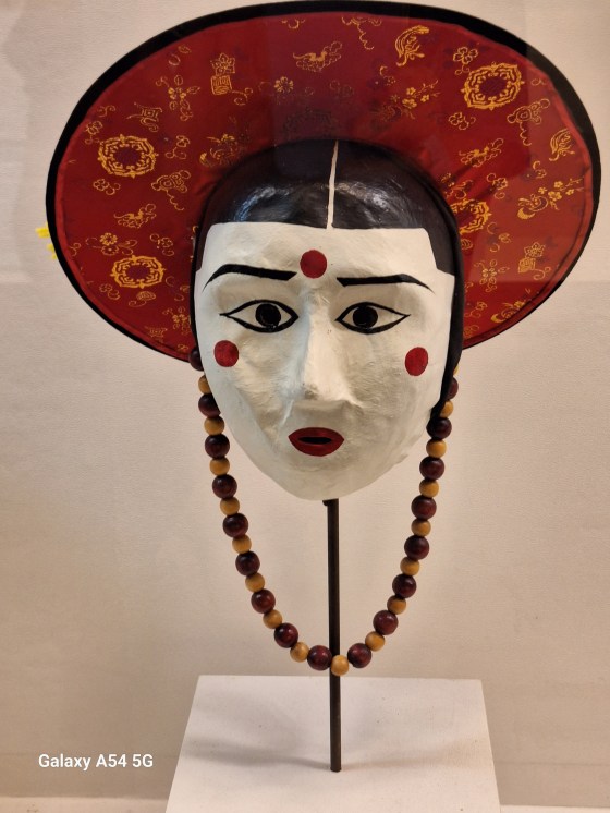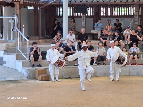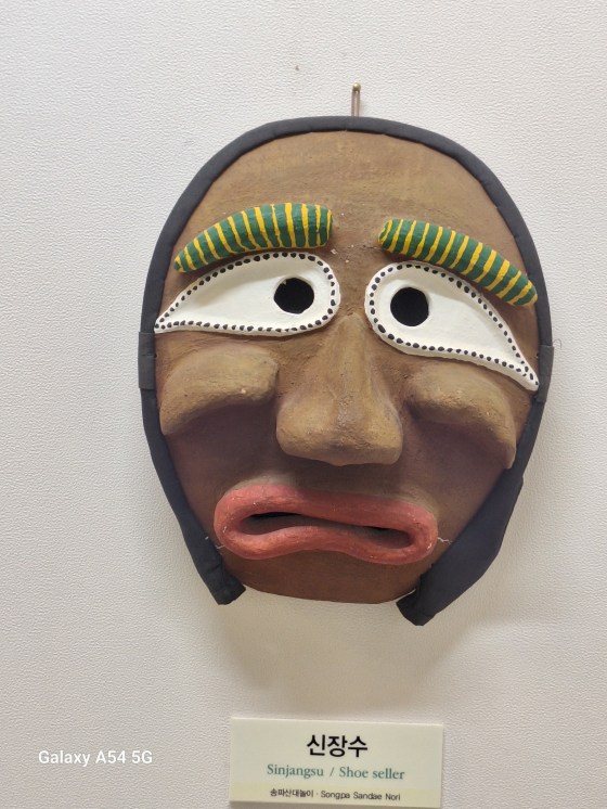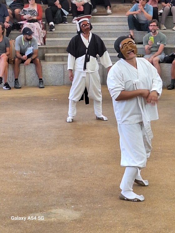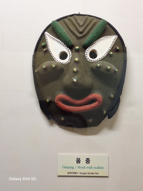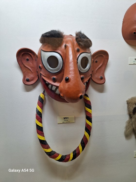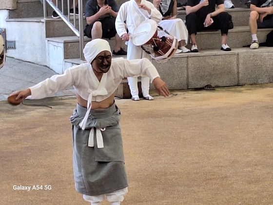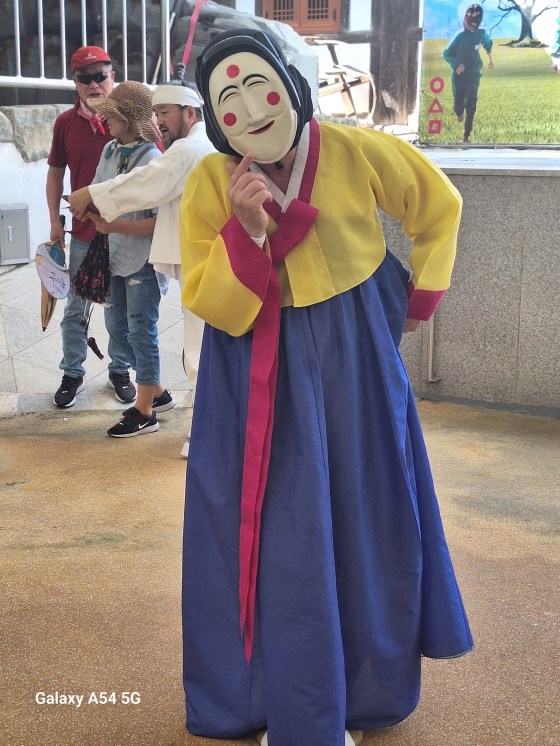 Ce qui amène principalement le touriste à Andong est son village traditionnel classé par L’UNESCO depuis 2010 comme patrimoine mondial dont les maisons sont très bien conservées, son histoire avec la famille Ryu dont les membres ont vécu ici pendant 600 ans, dont deux célèbres, l’un étant un grand savant confucéen et l’autre premier ministre pendant l’occupation japonaise fin du XVI e siècle. On vient pour le village mais on vient également pour ses masques. Un musée ( c’est bien, il y fait frais !) à l’entrée du village présente plus de 250 masques coréens et étrangers. Chaque jour à 14 h, un spectacle met en scène quelques personnages masqués. Certains disent qu’on peut s’en passer, que c’est uniquement pour les touristes. C’est vrai mais le spectacle nous a plu, même si on n’a pas tout compris.