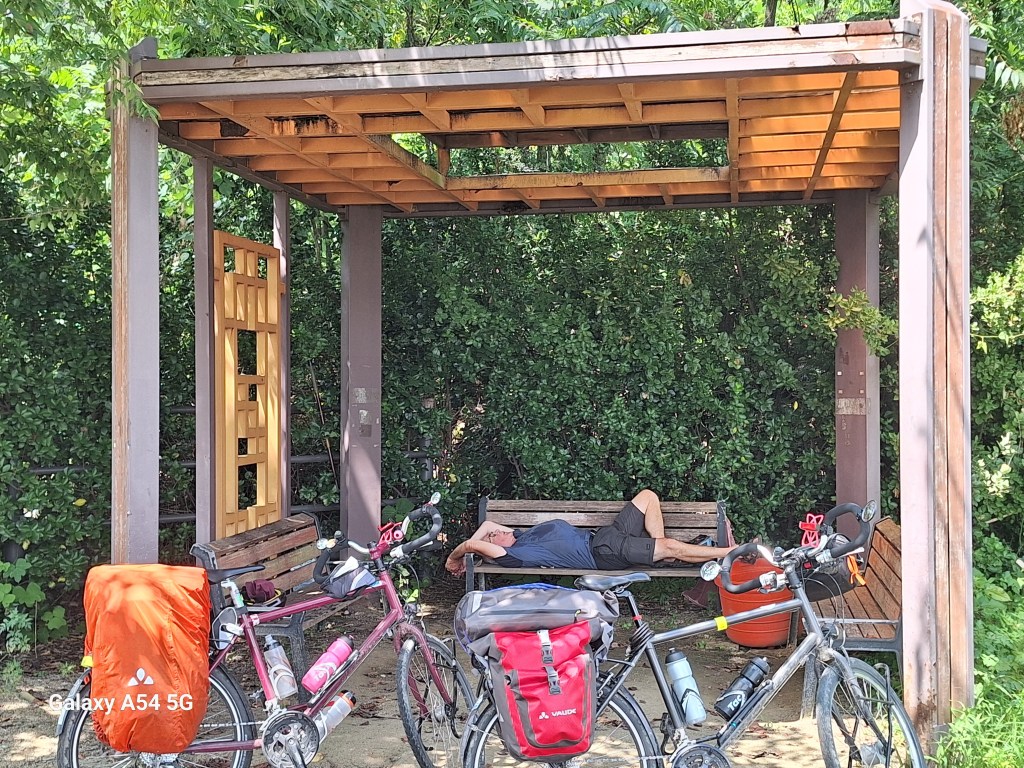 ….et vite fui ! Il fait autour de 38° à l’ombre et l’ombre, il n’y en a pas. Pas un arbre ni une salle commune. En fait le camping est juste à côté du port maritime d’où partent les ferrys pour le Japon. Les gens n’y passent qu’une nuit s’ils ne peuvent pas faire autrement. Nous on peut faire autrement !