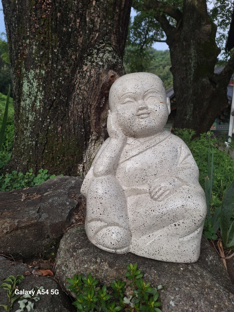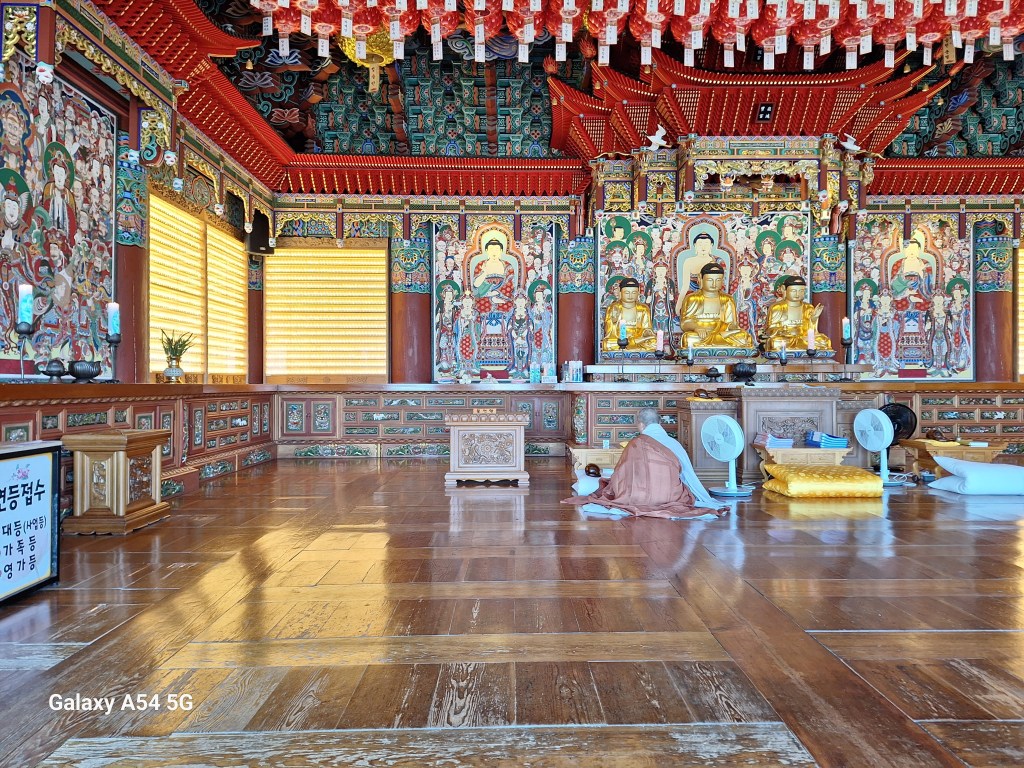 Le site est magnifique.Enfin un moine, un vrai, qui psalmodie tout seul.Bling bling BouddhaLes Coréens écrivent souvent des vœux sur des cœurs, des feuilles. Ici les feuilles de figuier sont le symbole du Bouddha puisque c’est sous un figuier qu’il a eu le satori en Inde près de Bénarès.