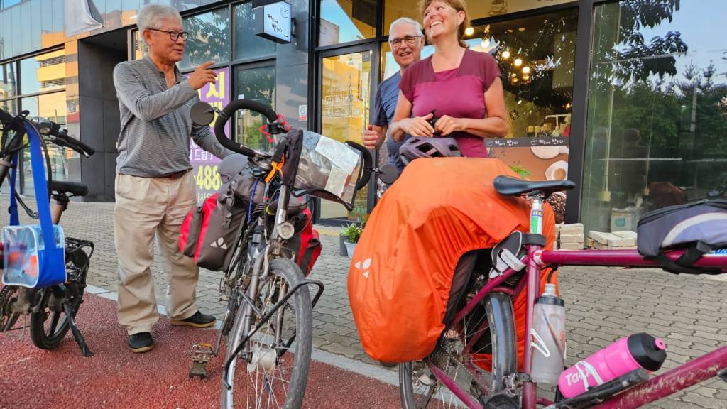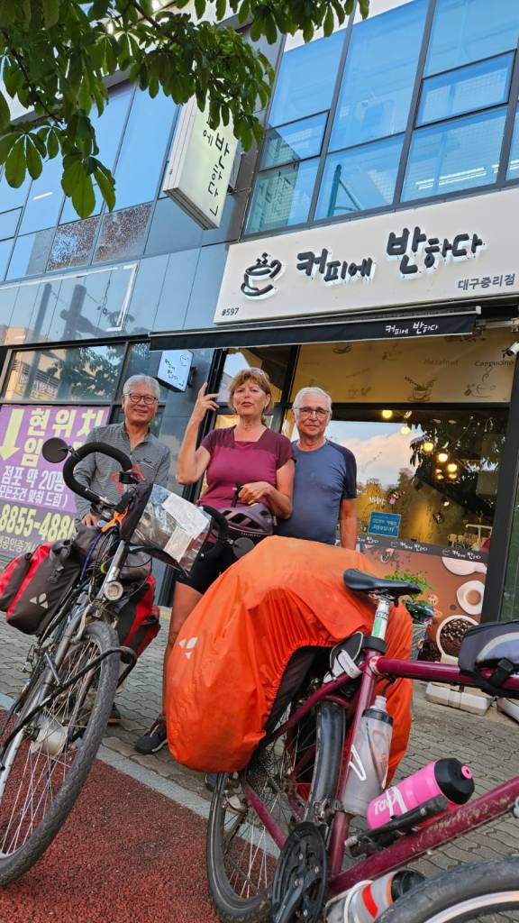 A Yeosu, nous dormons chez Eungwang, 27 ans, via le site Warmshowers. Un super accueil et ce matin petit déjeuner coréen : soupe de poissons et bol de riz. Délicieux. Eungwang qui travaillait aujourd’hui samedi, a pris le temps de nous accompagner sur les premiers kilomètres de cette nouvelle journée pour bien nous aiguiller. Hier soir, échanges autour de la Corée et de la France qu’il a parcourue lors d’un tour d’Europe à vélo il y a quelques années. On apprend que le service militaire dure 18 mois, qu’il est officier, que les Coréens ont deux semaines de vacances par an mais qu’ils peuvent réussir à avoir parfois un jour par mois de plus de congé. Ils travaillent cinq ou six jours par semaine, selon le métier. Eungwang nous a expliqué, que question pistes cyclables, la Corée a développé plusieurs axes nord-sud, dont celui des quatre rivières mais que traverser dans la largeur est, pour le moment, plus difficile. Le lendemain, on n’a pas été déçus!