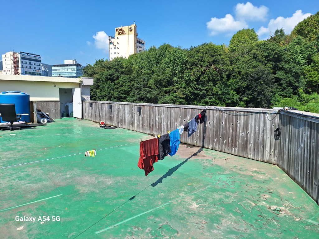 Notre sèche linge. Le toit de la guesthouse.Pour 28€ la chambre, on a en plus de la chambre cet espace avec dosettes de café, bouilloire, micro ondes et lave linge gratuit à gauche avec lessive fournie. Toutes les chambres des motels ont la clim et un trousseau dans lequel on a tous les accessoires de toilette. C’est un peu plus cher le week-end mais le gérant nous a laissé les quatre nuits au même prix. On commence à s’habituer à toutes ces marques de gentillesse….on va être très exigeant de retour en France…