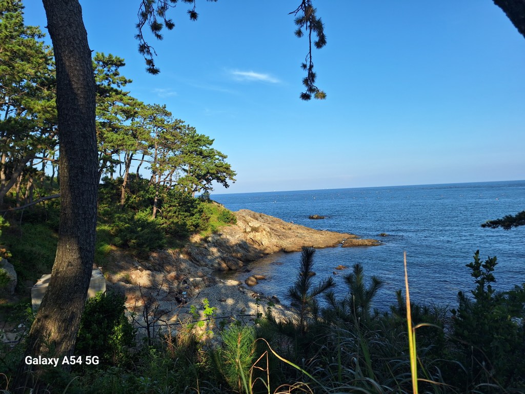 Très beau mais pour nous, trop de dorures, trop de touristes, trop de pacotilles, trop de trop. On va vite trouver un chemin côtier et partir au hasard le long de la mer et je ne résisterai pas à piquer une tête toute habillée, c’était trop tentant ! Mais au fait….dans quelle mer ? L’affaire est politique. Pour les Coréens, il s’agit de la East sea, la mer orientale ou mer de l’est mais pour les Japonais, c’est la mer du Japon.