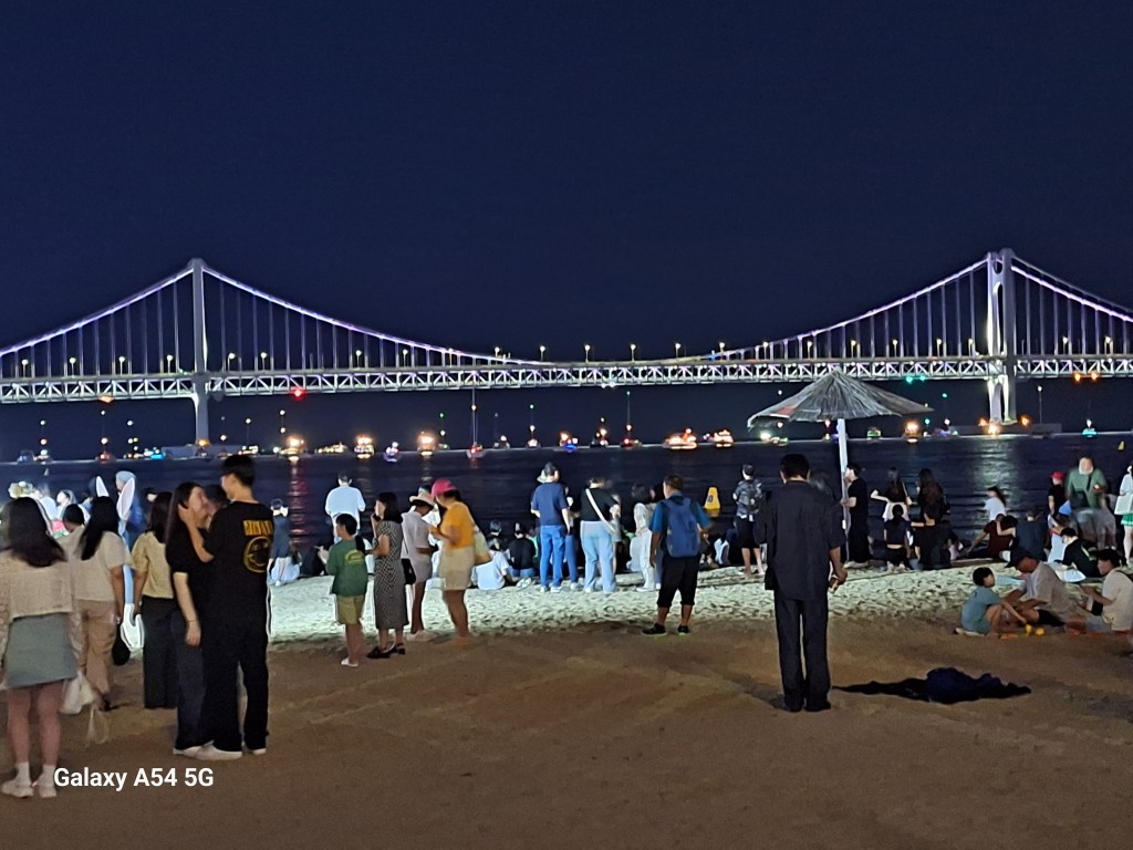 Busan. Deuxième ville du pays après Séoul. Le plus grand port de Corée. Cinquième port mondial pour le trafic de conteneurs. Une ville démesurée et 3 660 000 habitants. Quand on est arrivés à la borne des 4 rivières, on a programmé une guesthouse assez centrale, pas chère et le GPS indiquait 12 kms pour la rejoindre. Du port au terminal de bus, 20 kms ! Certains quartiers sont à flanc de colline. Une immense toile d’araignée.