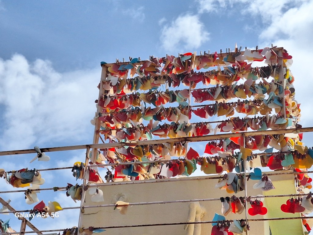 La mer n’est jamais loin.Des allées étroites où vivent toujours les habitants.Du linge qui sèche, c’est la vie qui est là.Cœurs de vœux. Vœux de cœur.En céramique.On a fatigué la dame.