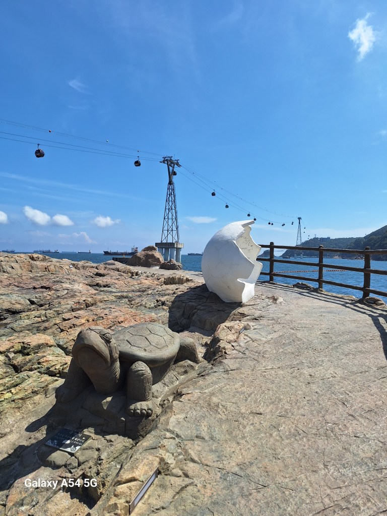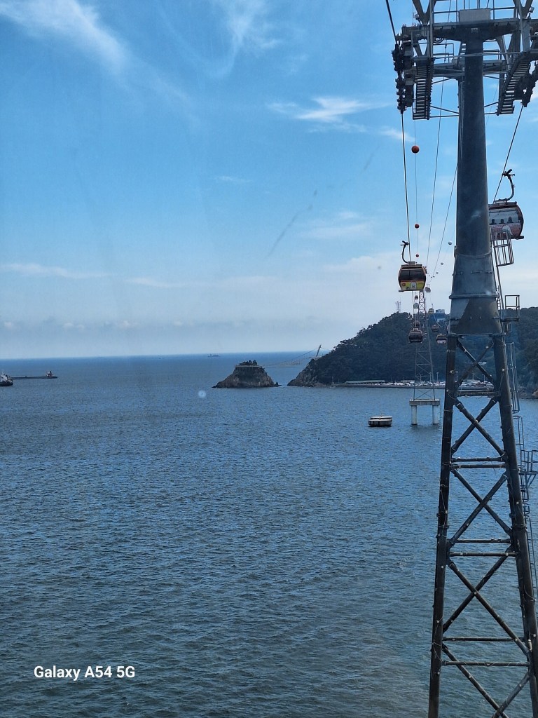 Photo antérieure à Busan.Balade en téléphérique au-dessus de l’eau. Les œufs sans la Bastille (là il faut être Isérois…). Pierre , comme tous les passagers, a eu le droit à une sucette. Plaisir fugace.