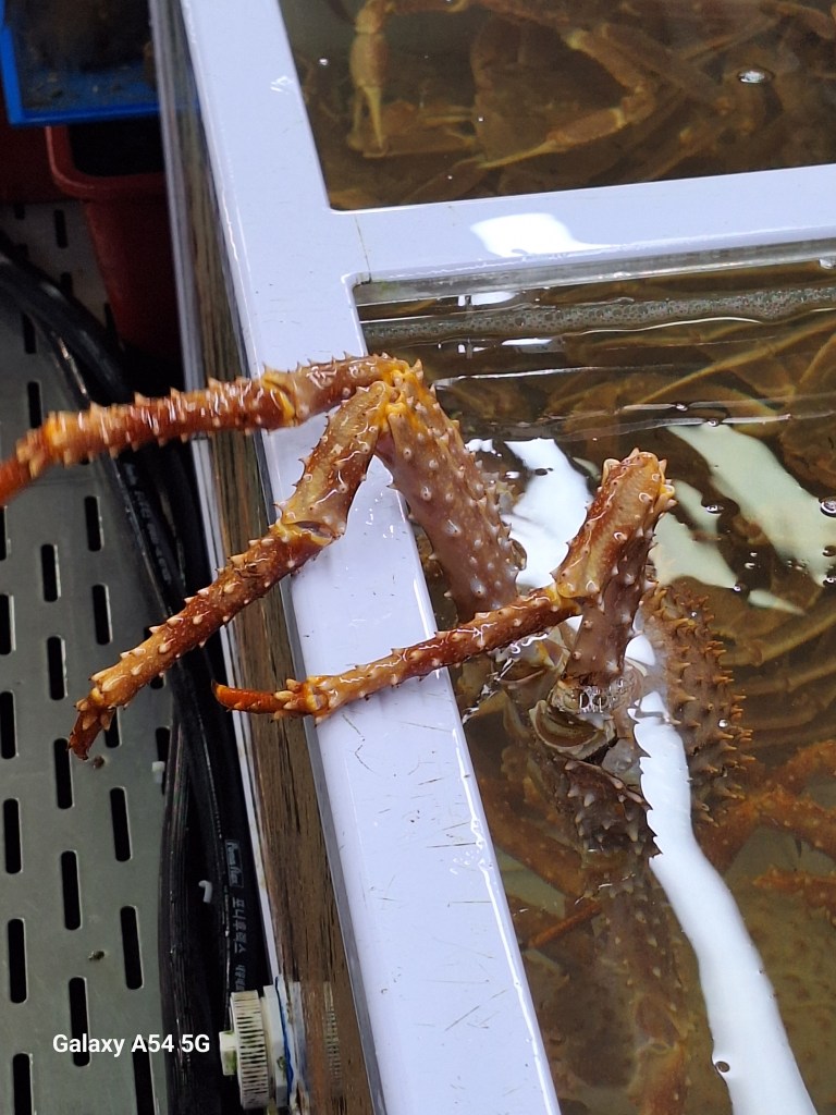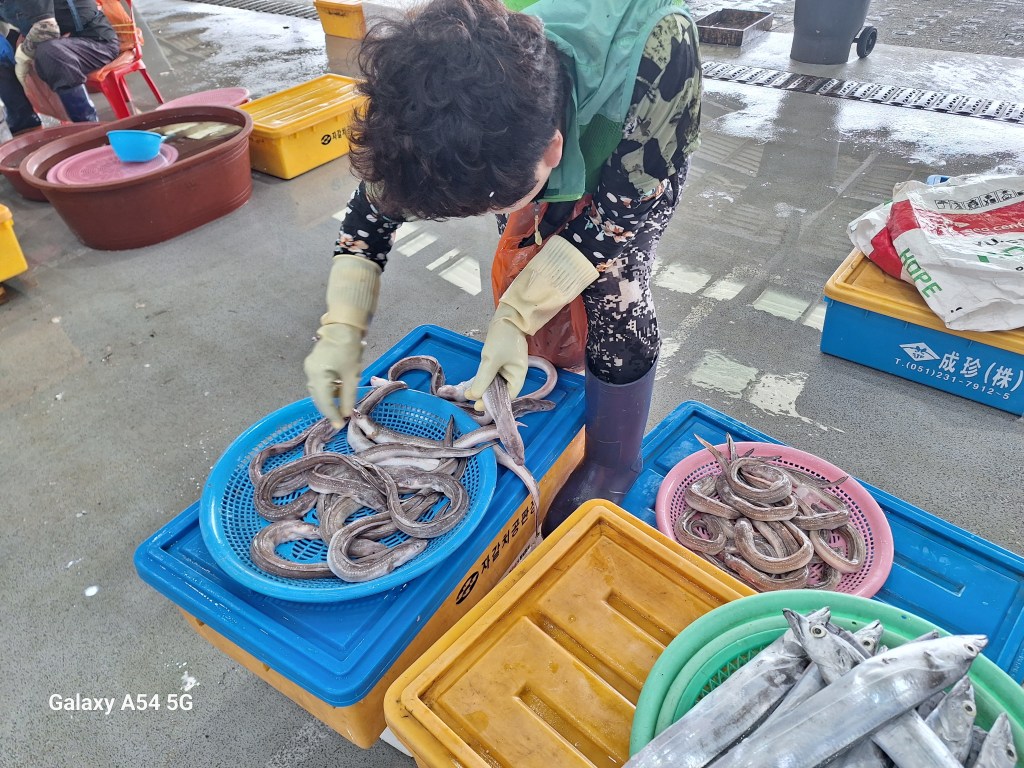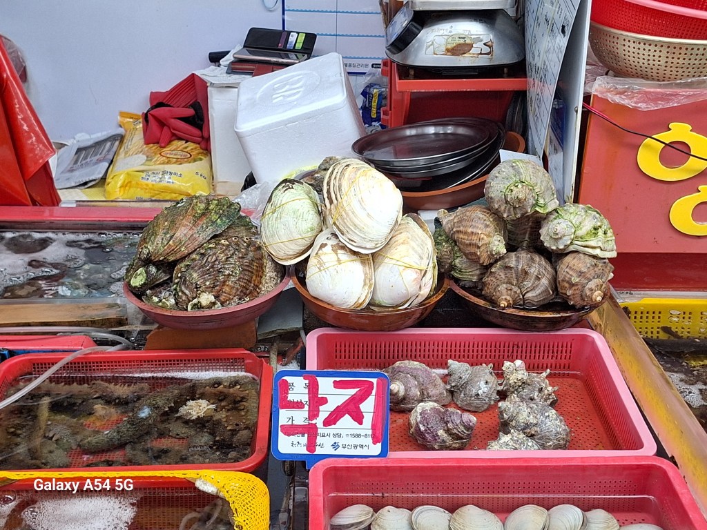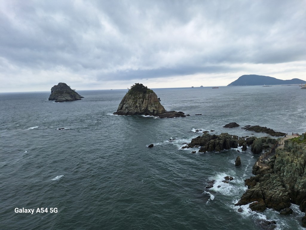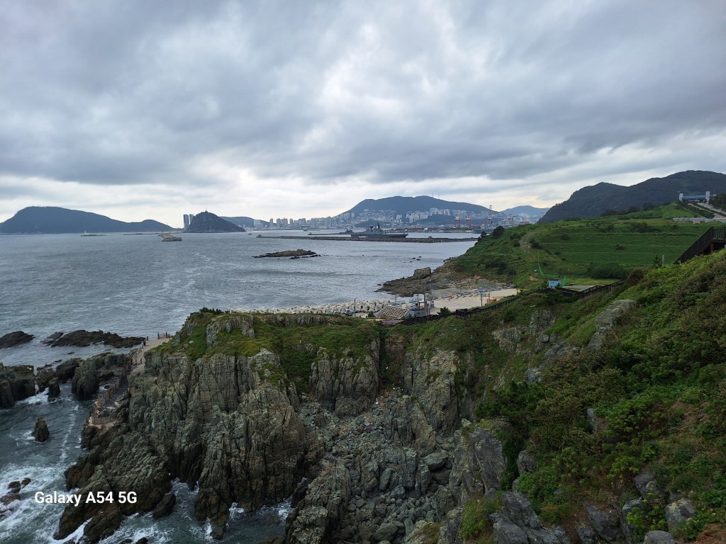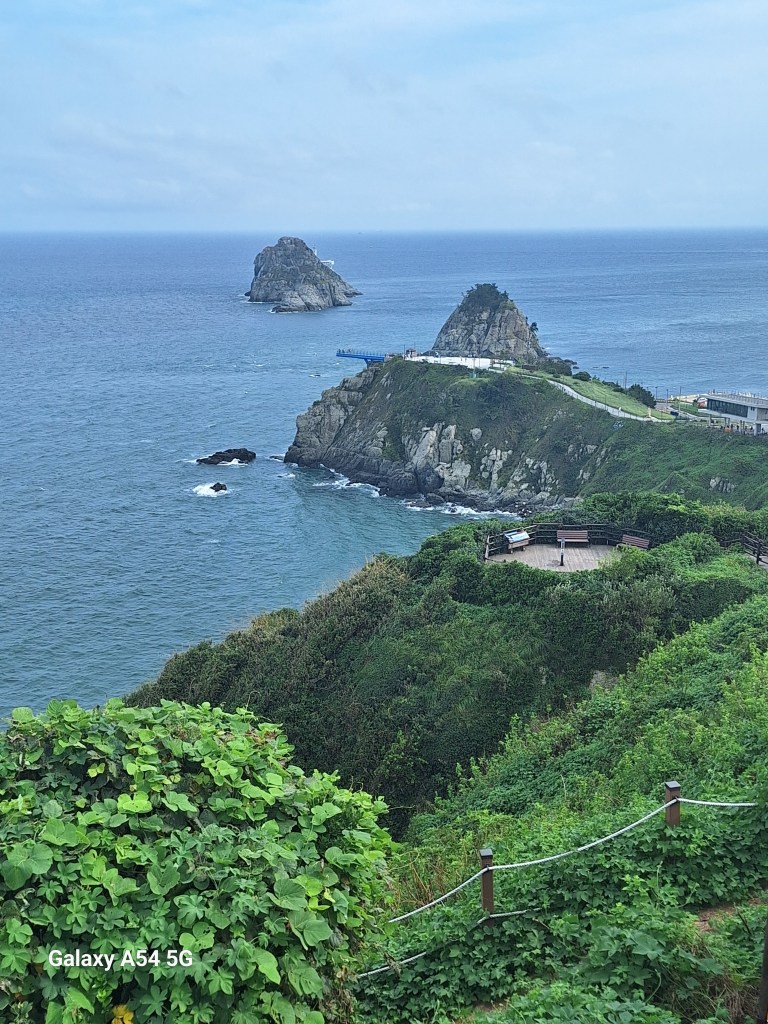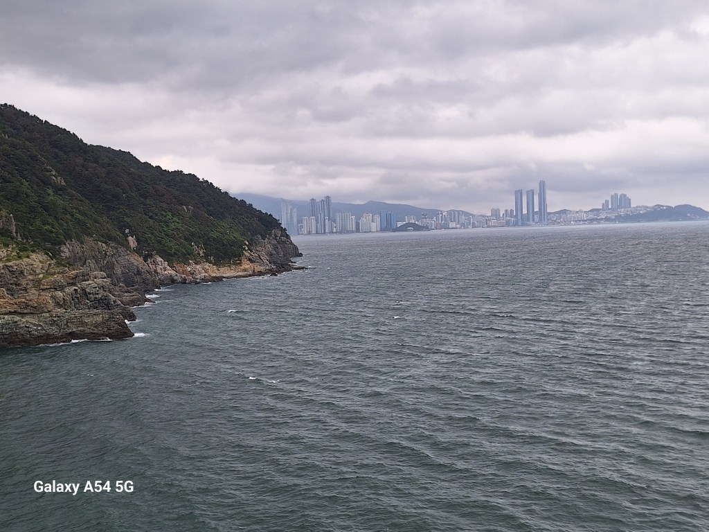 Moules et palourdes sont énormes. Objet Flottant Non identifié . On n’a pas goûté.Une rebelle. Elle a compris.Repas pris au marché. Comme la veille, c’est joli le poisson cru mais c’est fade. Tous les étals sont impeccables.Au sud de la ville, un superbe endroit.Le skywalk pour quelques frissons.Cette côte en plein cœur de Busan dont on retrouve les tours……des deux côtés.
