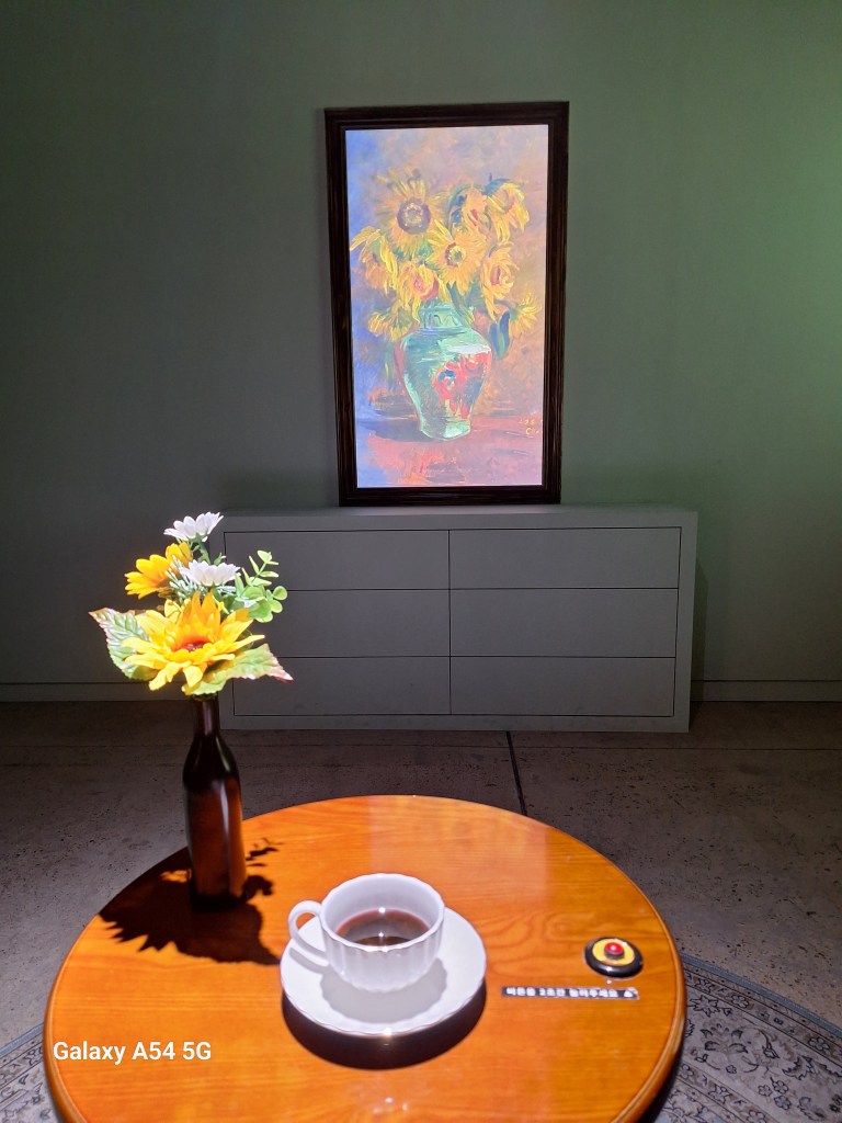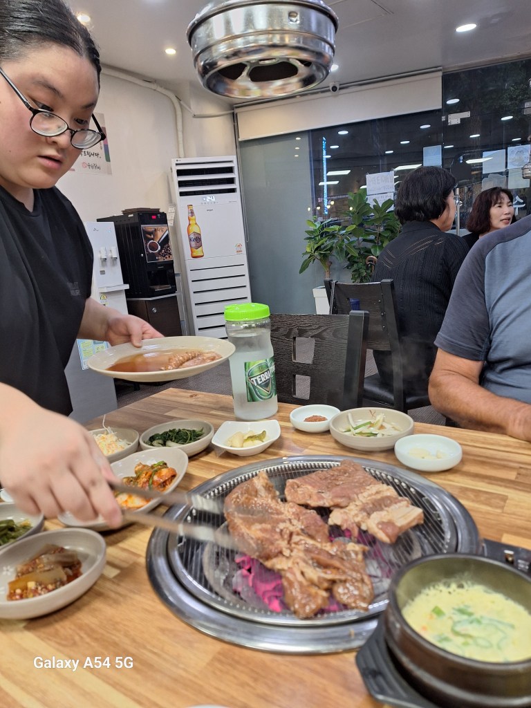 Dans une autre salle, Pierre va peindre le tableau.Trop fort.Très souvent, les restaurants proposent des barbecues au centre des tables.La jeune femme ne nous quitte plus et va nous couper la viande en petits morceaux. Un régal pour 7€ par personne…l’ensemble des plats.Petite hotte individuelle.La première fois, on a cherché longtemps les gobelets..Ça tient , même pour boire plusieurs fois.Et dire que nous on a toujours peur que nos écrans prennent l’eau!