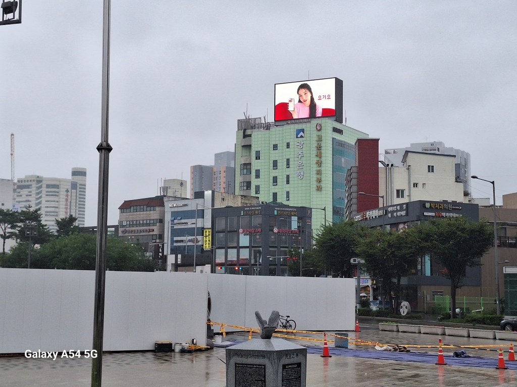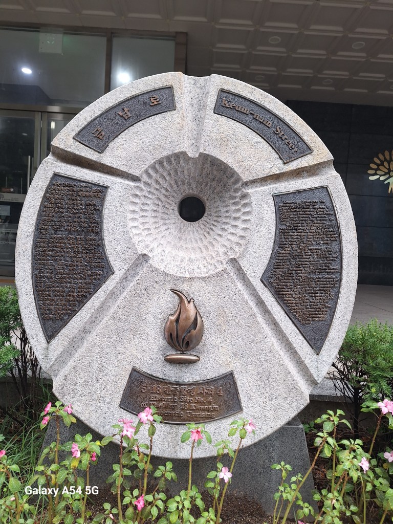 Avant de se précipiter vers Suncheon, nous allons découvrir Gwanju, au nord de Suncheon, très peu fréquenté par les étrangers. La ville est tristement célèbre pour un soulèvement d’étudiants qui demandaient la démocratisation du gouvernement et qui s’est terminé par un massacre perpétré par l’armée. Des morts et des disparitions. C’était le 18 mai 1980. On dit que ce soulèvement est resté un traumatisme pour le pays. C’est le Tien An Men coréen. La Corée du Sud n’avait connu que des régimes autoritaires depuis la fin de la Guerre de Corée. Le pays devint démocratique en 1988.