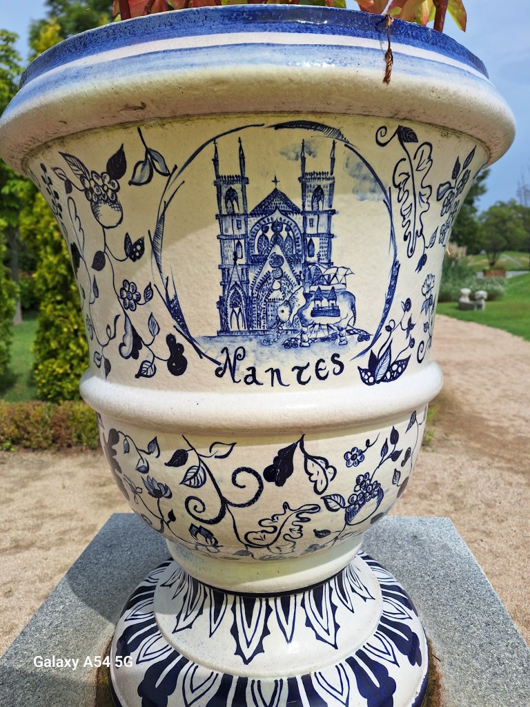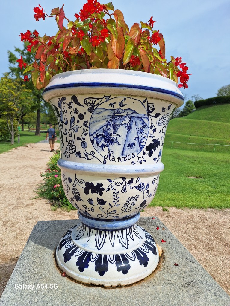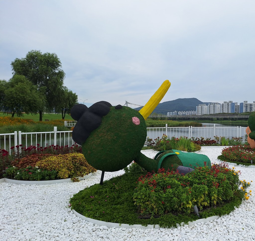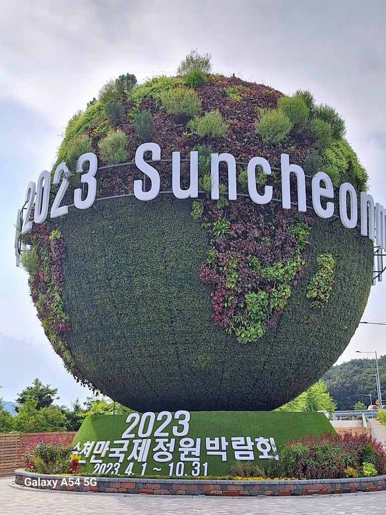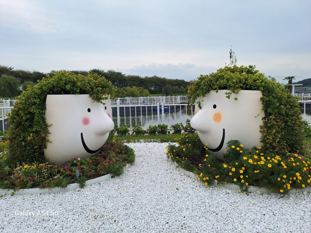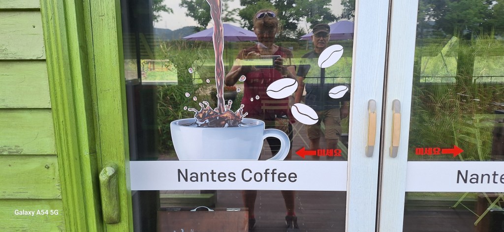On l’a bien mérité.Et sur la route de Suncheon, des jeunes nous font goûter des friandises.Enrobés de pâte de riz, certains bonbons sont fourrés aux graines de sésame, d’autres aux haricots rouges sucrés. C’est leur grand truc. Si on m’avait dit qu’un jour….Et bien c’est très bon.Quand on arrive près de la baie de Suncheon, on découvre d’abord d’immenses jardins qui ont été mis en place en 2013 pour protéger la baie. Cette année, une expo type les Floralies. On laisse nos vélos à l’entrée.C’est le pont du rêve. 140 000 enfants de 16 pays différents ont concouru pour décorer ce pont.Incroyable ! On tombe nez à nez avec des vases représentant Nantes, de la Loire en passant par Jules Verne, les machines de l’île et son éléphant. On apprendra plus tard que des liens existent entre ma ville et Suncheon. Les jardins contiennent plus de 5 000 000 de plantes et plus de 800 000 arbres. On n’a pas tout vu ! Le jardinier se repose.Sous serre.De la tête au pied, il y a de la place pour tout le monde.Le pied. Près des jardins à la Française, un café dans lequel on mangera un pain au chocolat, avec comme musique de fond « je t’aime moi non plus » version Jane Birkin. Quand on repassera dans l’allée, on s’envolera avec Goldman. Mais la serveuse est Ouzbek et n’en revient pas que je lui dise merci en russe. On retrouve la ville de Nantes près de la baie. On comprend que c’est un bateau-lavoir nantais qui a fait partie d’une exposition et qui a été transformé en café par la suite.