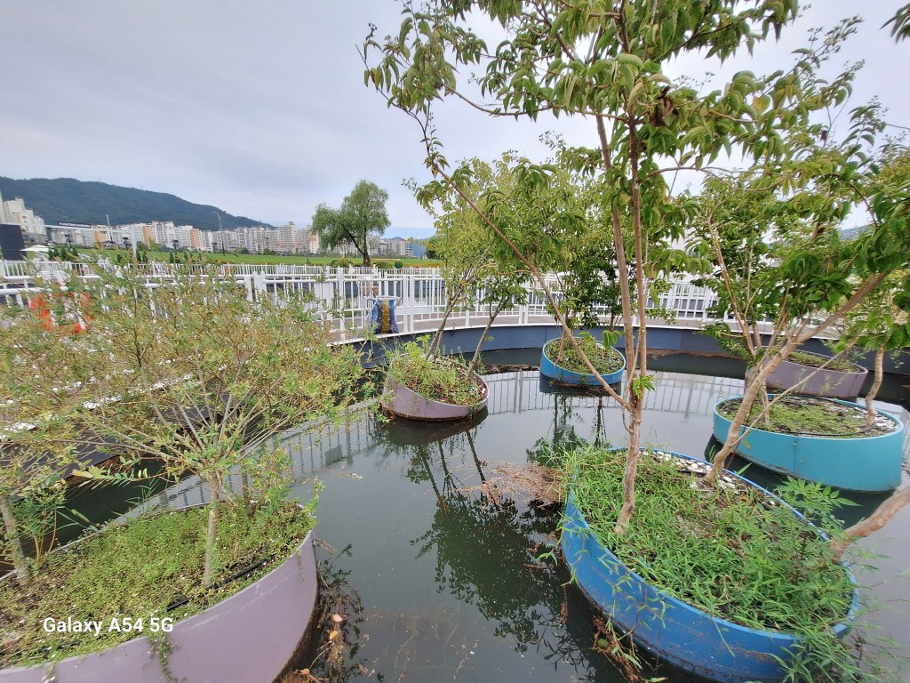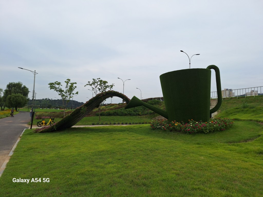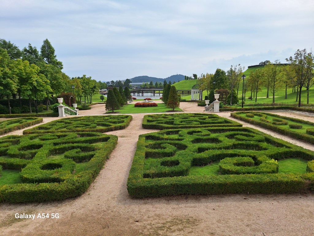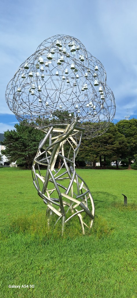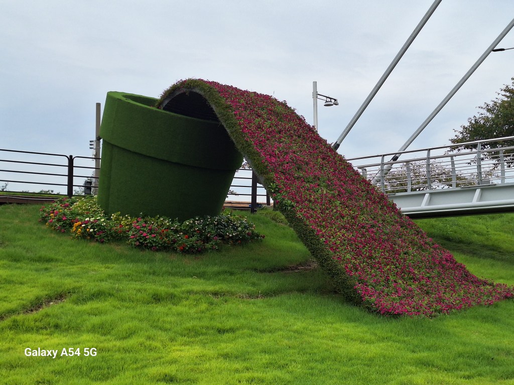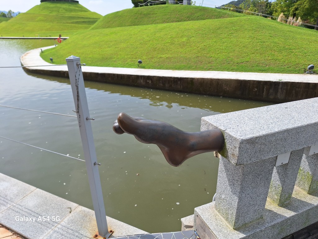 On l’a bien mérité.Et sur la route de Suncheon, des jeunes nous font goûter des friandises.Enrobés de pâte de riz, certains bonbons sont fourrés aux graines de sésame, d’autres aux haricots rouges sucrés. C’est leur grand truc. Si on m’avait dit qu’un jour….Et bien c’est très bon.Quand on arrive près de la baie de Suncheon, on découvre d’abord d’immenses jardins qui ont été mis en place en 2013 pour protéger la baie. Cette année, une expo type les Floralies. On laisse nos vélos à l’entrée.C’est le pont du rêve. 140 000 enfants de 16 pays différents ont concouru pour décorer ce pont.Incroyable ! On tombe nez à nez avec des vases représentant Nantes, de la Loire en passant par Jules Verne, les machines de l’île et son éléphant. On apprendra plus tard que des liens existent entre ma ville et Suncheon. Les jardins contiennent plus de 5 000 000 de plantes et plus de 800 000 arbres. On n’a pas tout vu ! Le jardinier se repose.Sous serre.De la tête au pied, il y a de la place pour tout le monde.Le pied. Près des jardins à la Française, un café dans lequel on mangera un pain au chocolat, avec comme musique de fond « je t’aime moi non plus » version Jane Birkin. Quand on repassera dans l’allée, on s’envolera avec Goldman. Mais la serveuse est Ouzbek et n’en revient pas que je lui dise merci en russe. On retrouve la ville de Nantes près de la baie. On comprend que c’est un bateau-lavoir nantais qui a fait partie d’une exposition et qui a été transformé en café par la suite.