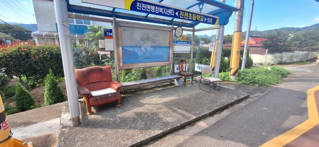 L’idée était de prendre le bus pour aller vers le nord de Busan à Gyeongju (sur la carte on avait écrit Train de nuit) et de redescendre le long du littoral à vélo jusqu’à notre départ le 8 septembre pour le Japon. A la durée du voyage dans le bus, 3 h au lieu de 1 h, on a vite compris que quelque chose clochait. En fait on se dirigeait vers l’est, ce qui, finalement, allait nous permettre de rejoindre à vélo la superbe baie de Suncheon, programmée au départ. Tache violette. Savoir s’adapter. Sinon pleurer.