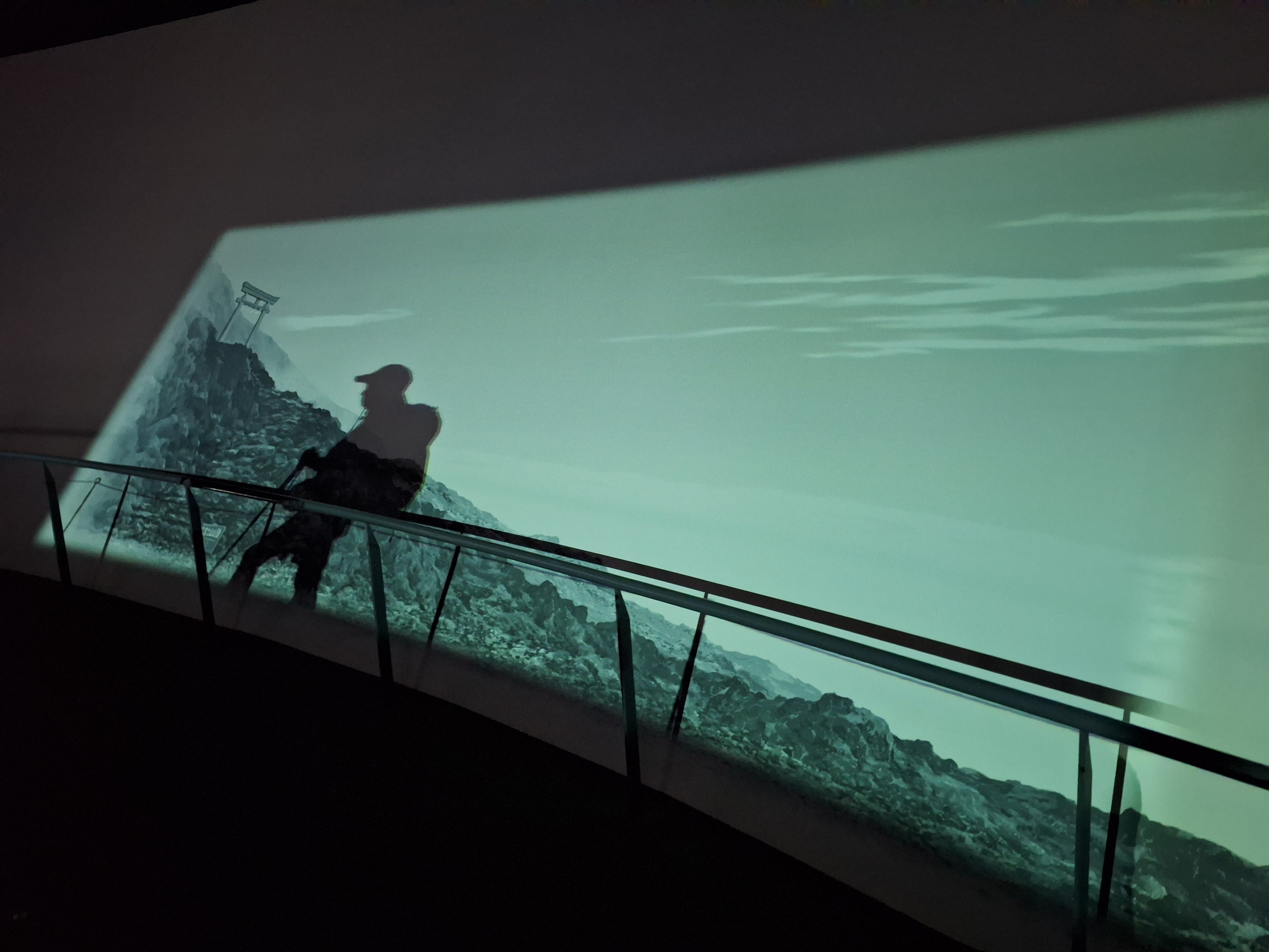 Un randonneur virtuel grimpe à nos côtés.Et voilà la vue panoramique sur le Mont Fuji. Génial. Rien à voir. Il est là mais il se cache.