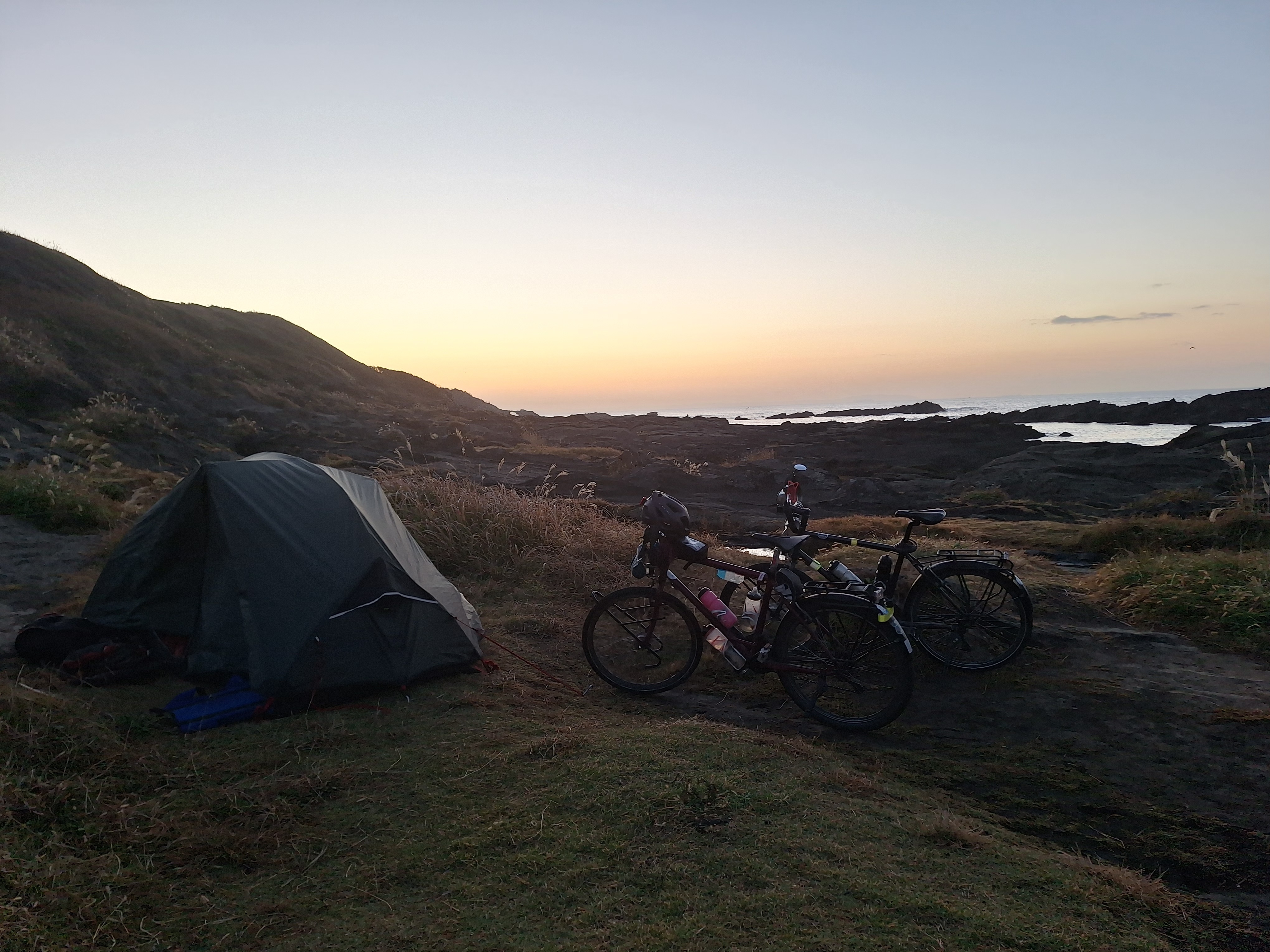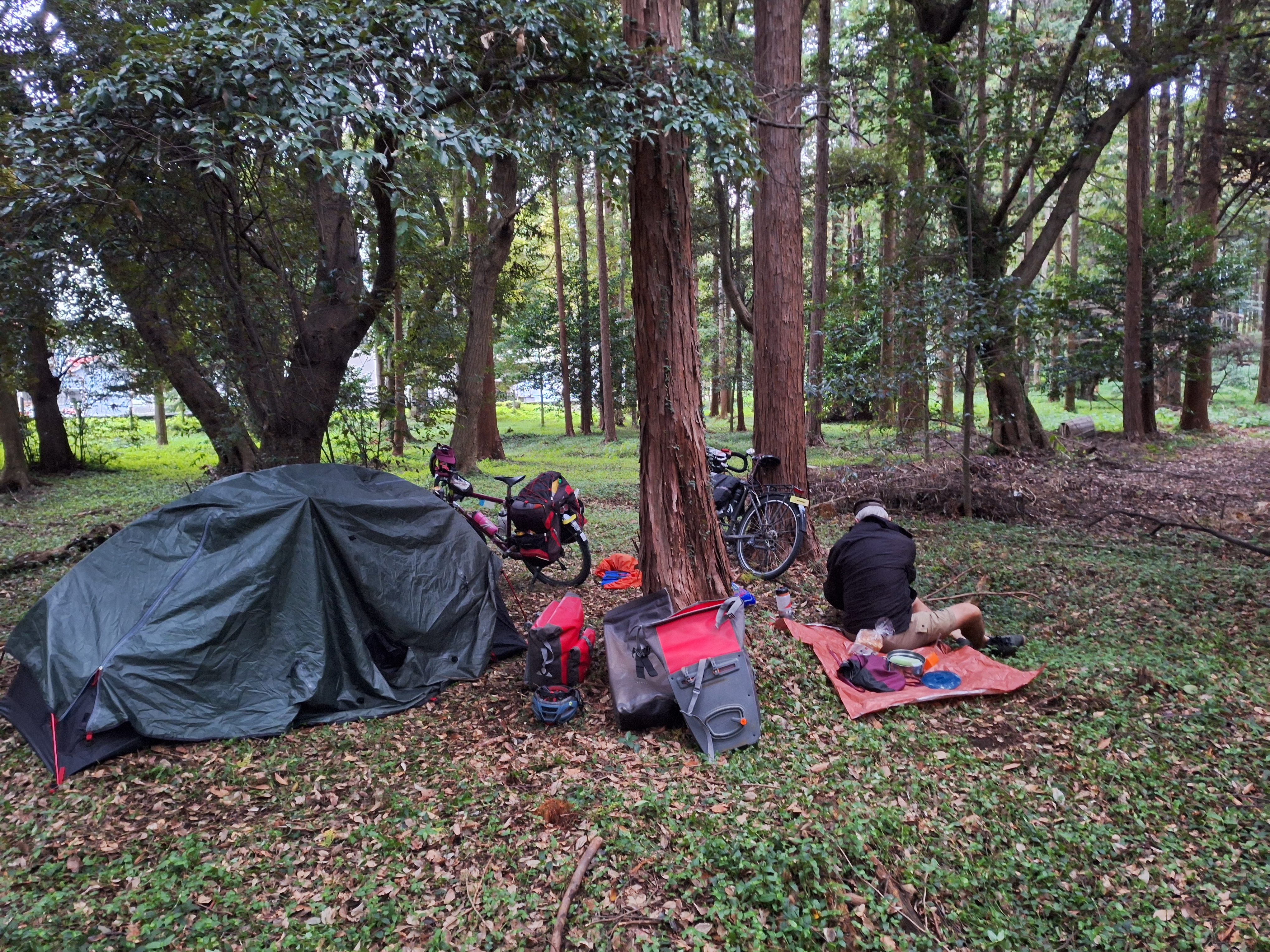De Kamakura à la péninsule de Miura, il faut compter pas plus de 35 kms avec moins de 500 m de dénivelé. Les dénivelés importants sont derrière nous et ça nous va bien. On sait qu’avec la fatigue, un accident peut survenir plus facilement alors on ne cherche pas à faire de grands exploits. L’intérieur de la péninsule n’a rien d’extraordinaire mais à la pointe, l’île de Jogashima est très belle. On pensait le bivouac terminé mais on a quitté les hauteurs du Fuji et les températures sont à nouveau clémentes.