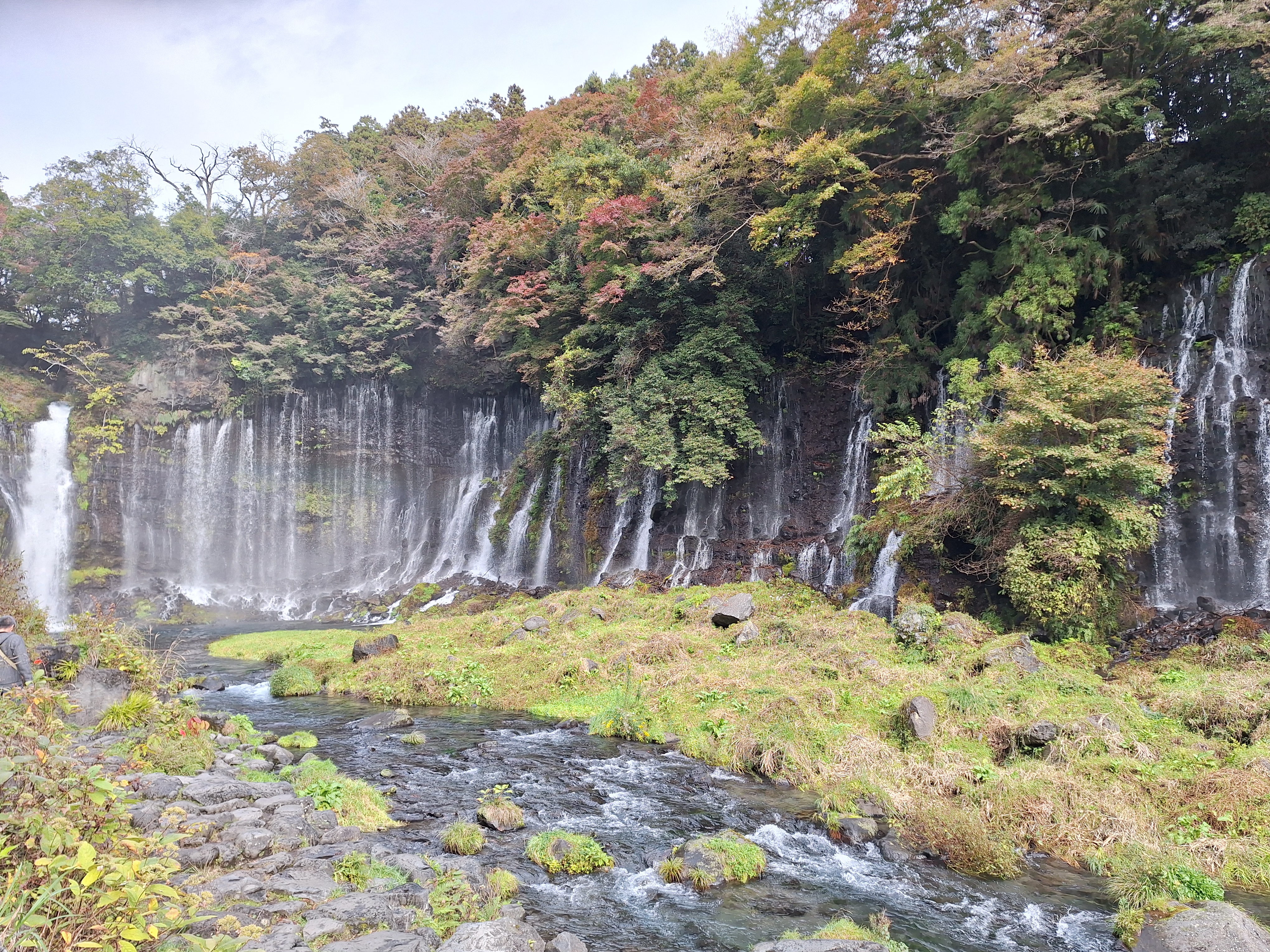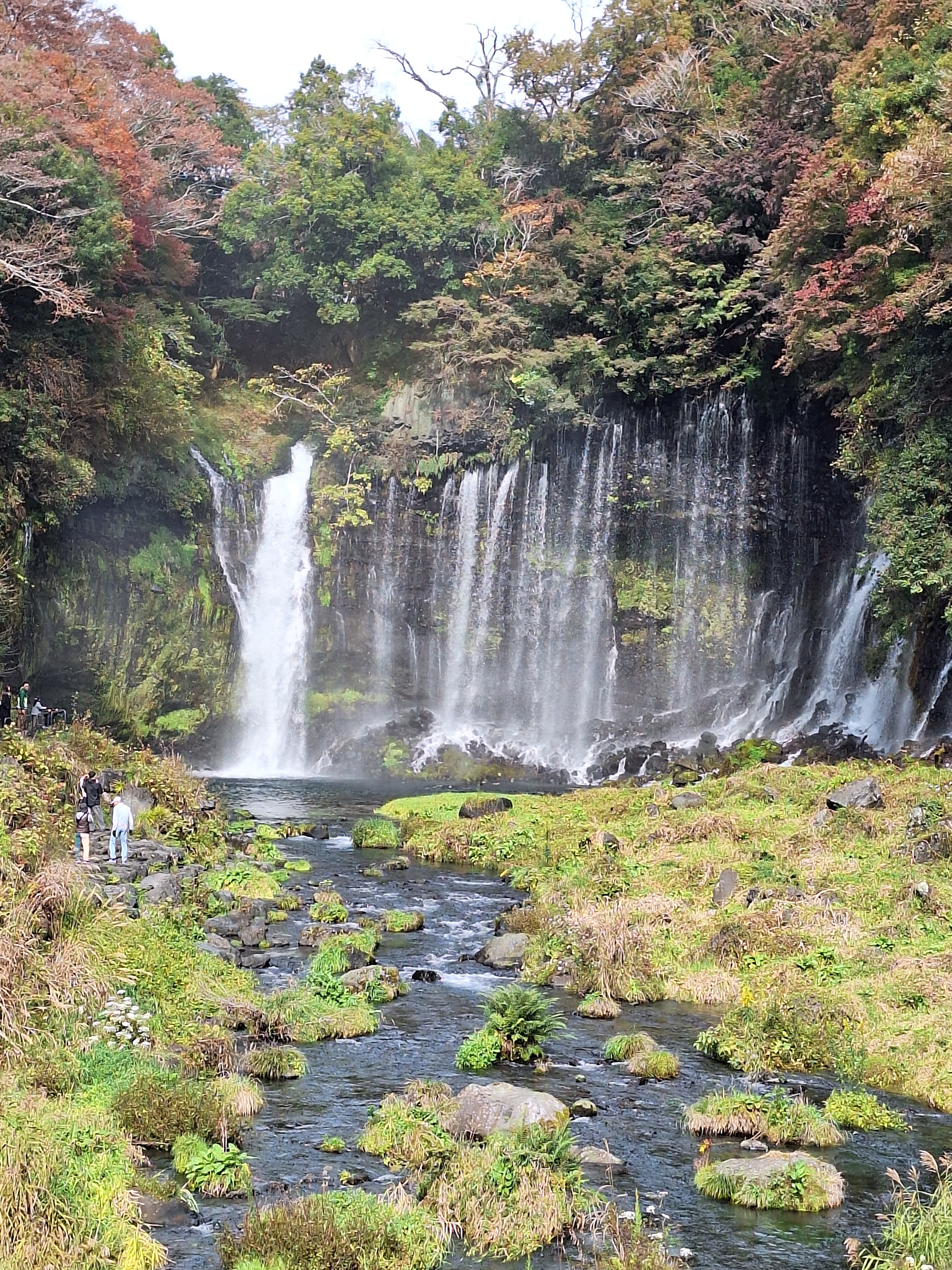 Il ne pleut pas. On trouve que le temps s’éclaircit. Espoir.La route est parfois partagée avec les voitures, parfois sur des sentiers qui sentent bon l’automne.On dévie légèrement de notre parcours pour suivre les nombreux Japonais venus admirer de superbes chutes d’eau.Avec le Fuji en arrière plan.