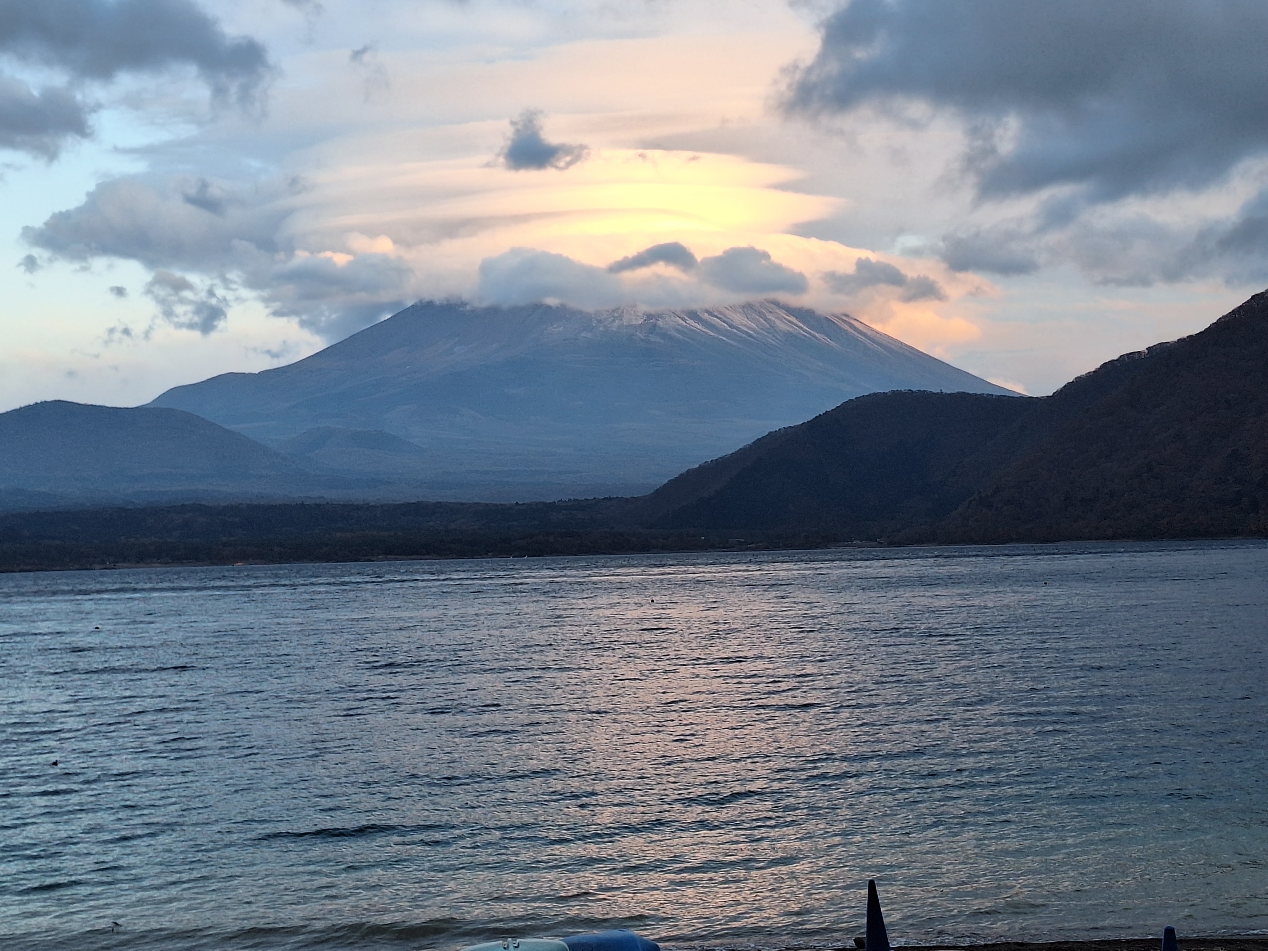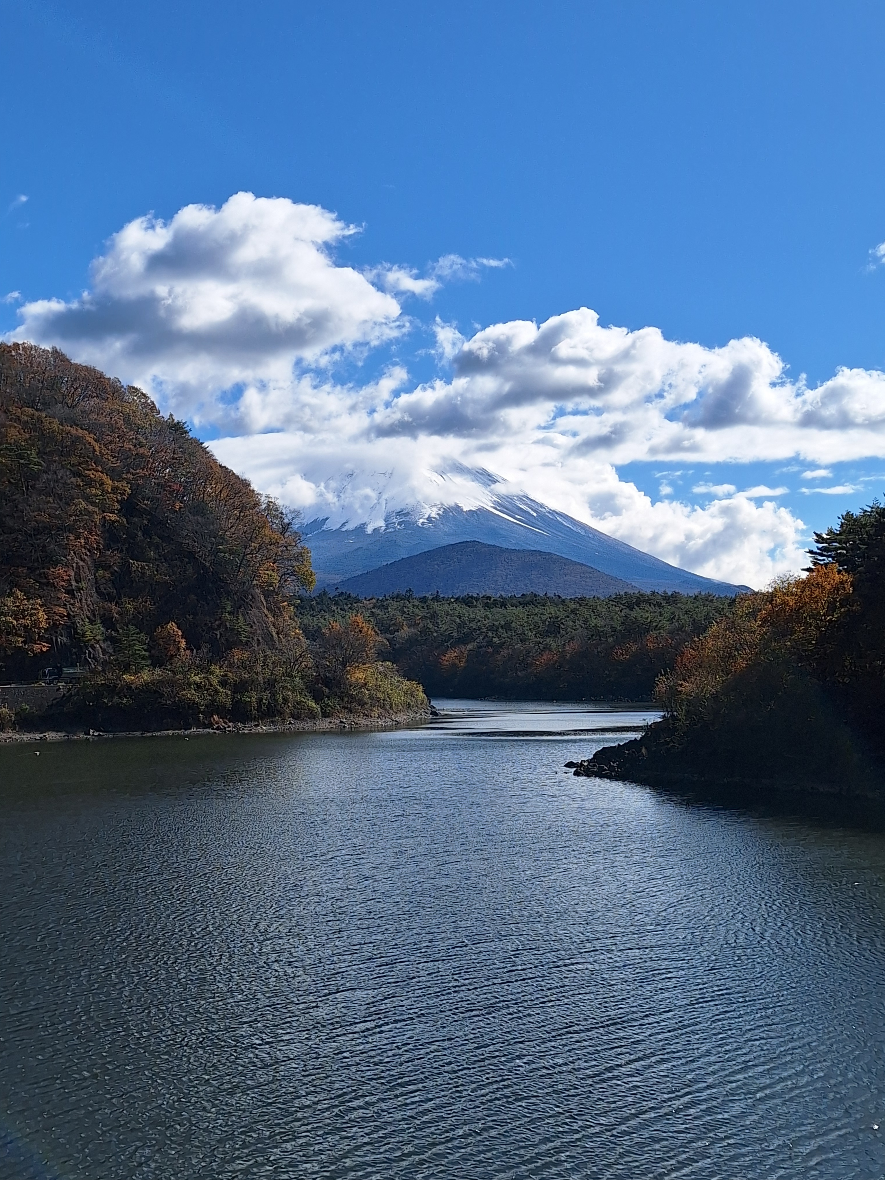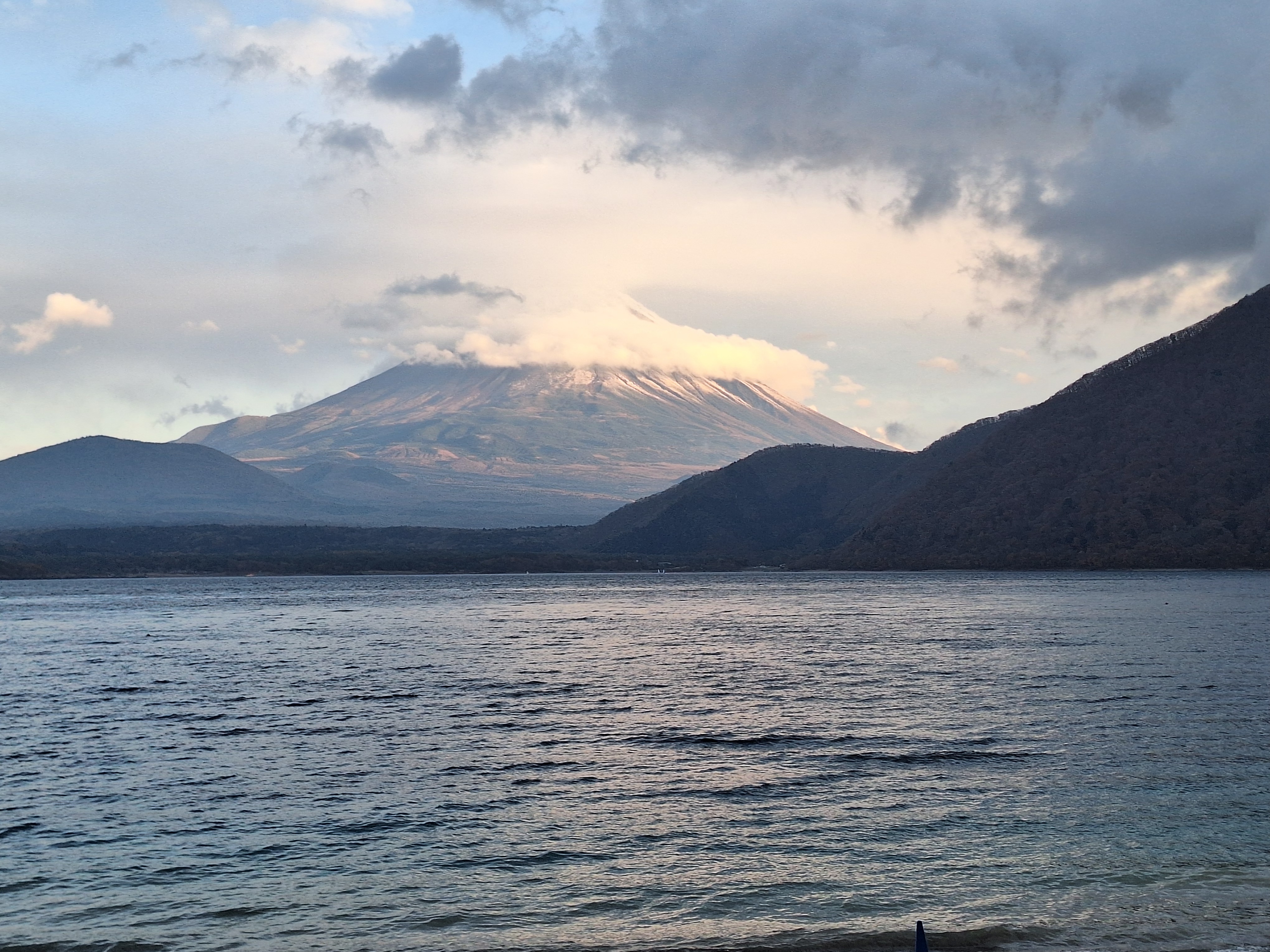 Le Motosu est le seul lac qui ne gèle pas l’hiver car sa profondeur atteint 138m. Dimanche 12 novembre. Vue de notre camping. Il est 16h. On n’a pas eu la pluie annoncée mais il fait très froid et on a un vent terrible.La vue de cet endroit est celle représentée sur les billets de 1000 yens . On est très heureux de ce que veut bien nous dévoiler la montagne sacrée.