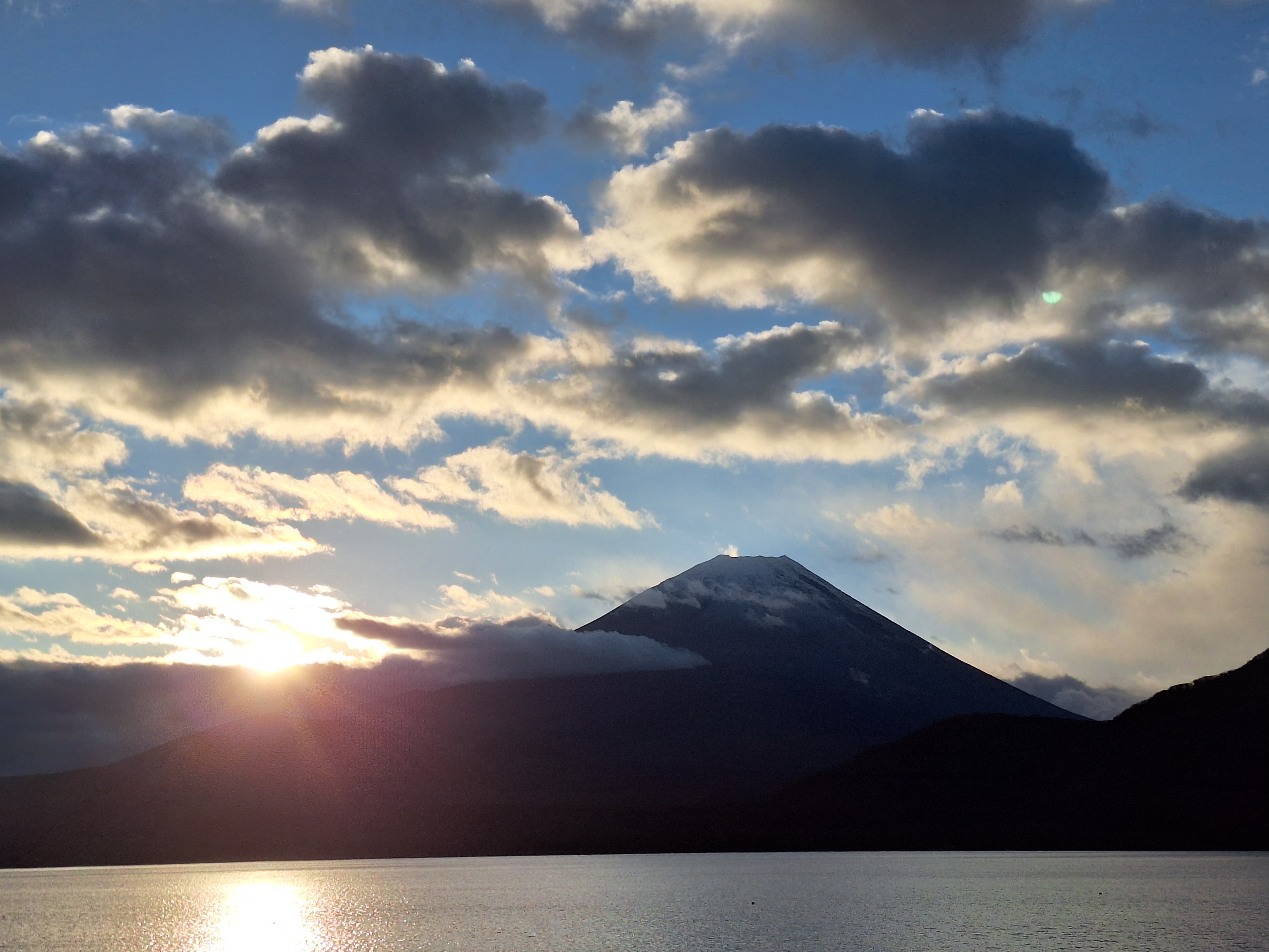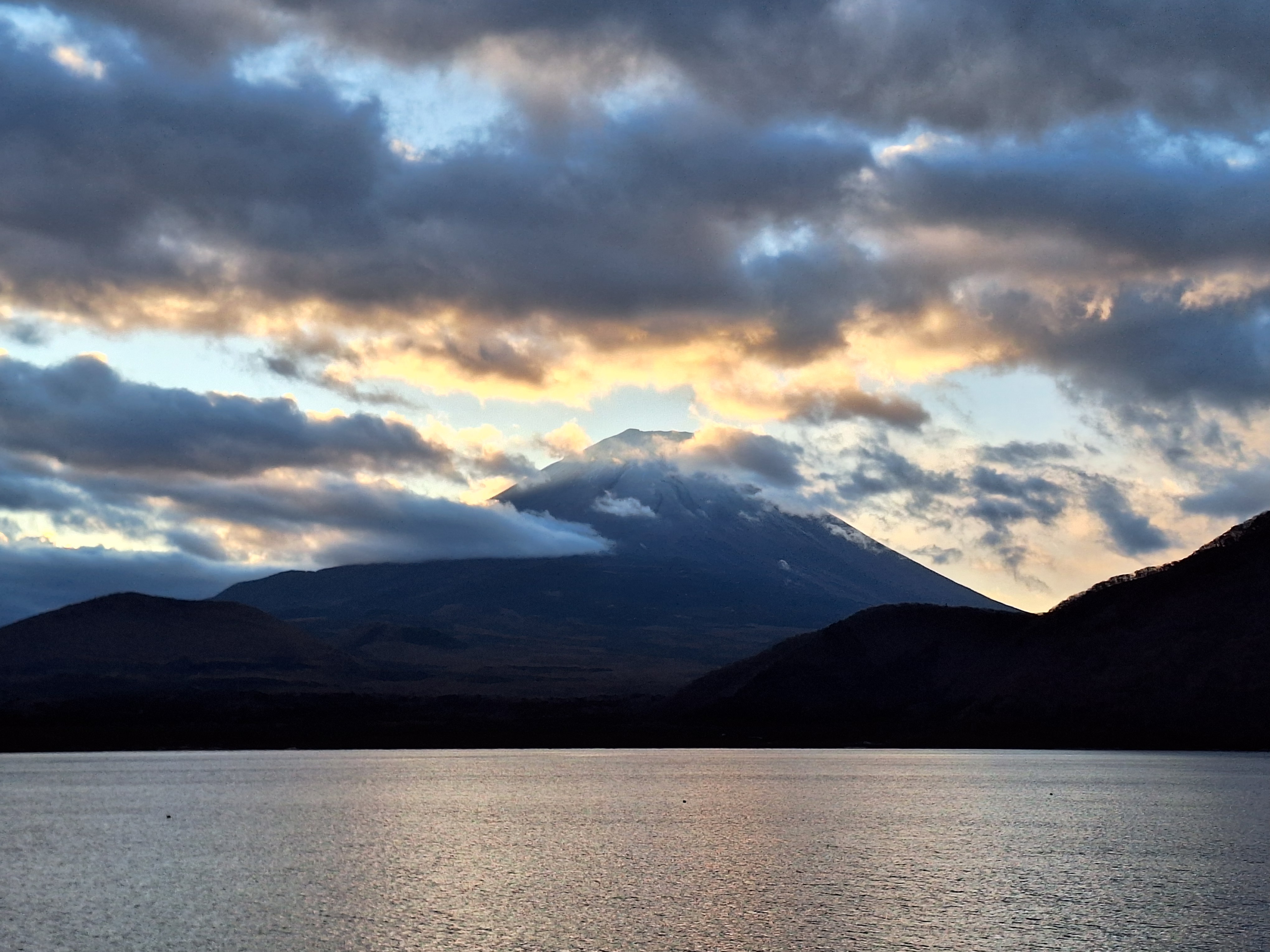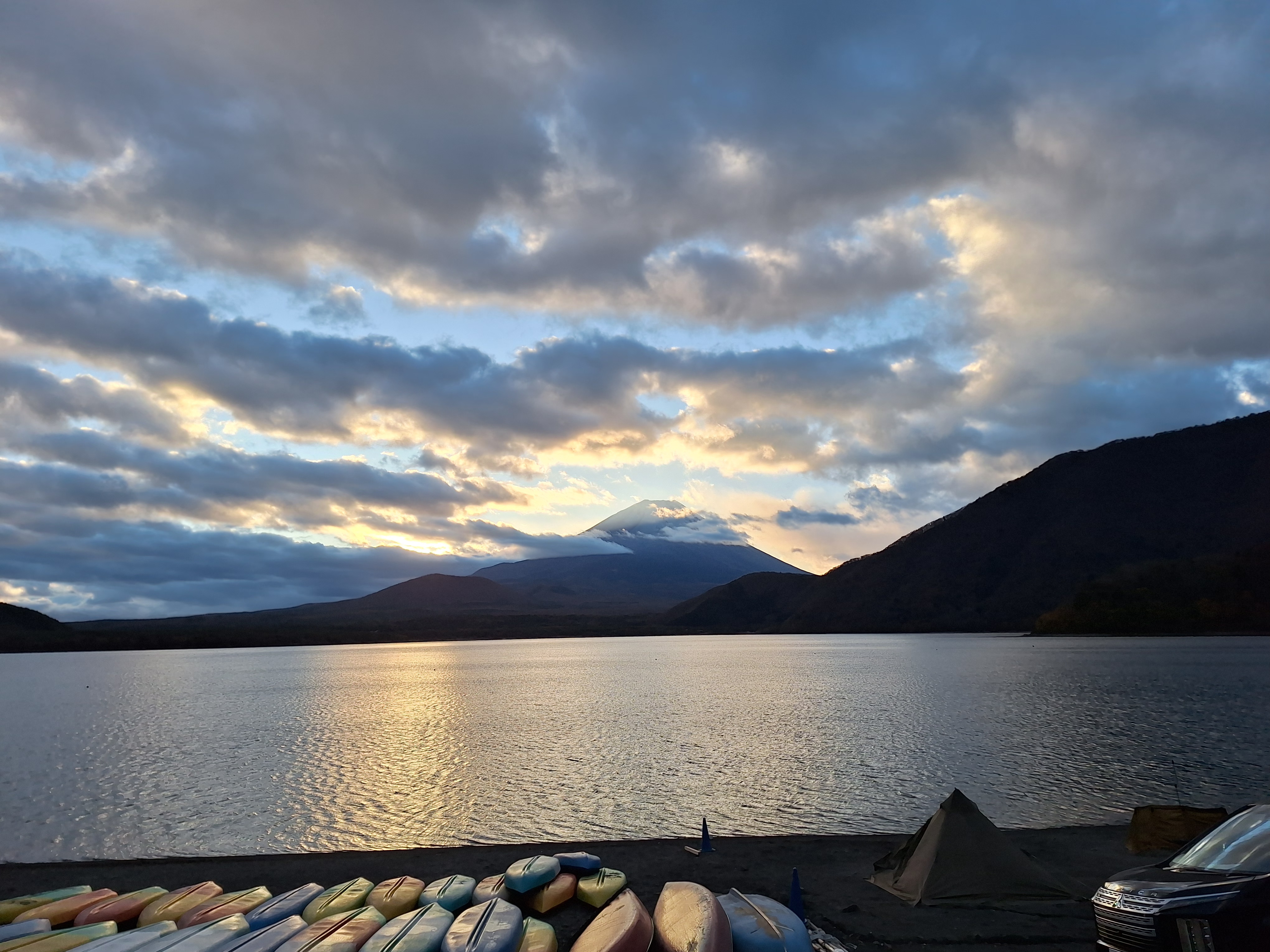 Le Motosu est le seul lac qui ne gèle pas l’hiver car sa profondeur atteint 138m. Dimanche 12 novembre. Vue de notre camping. Il est 16h. On n’a pas eu la pluie annoncée mais il fait très froid et on a un vent terrible.La vue de cet endroit est celle représentée sur les billets de 1000 yens . On est très heureux de ce que veut bien nous dévoiler la montagne sacrée.