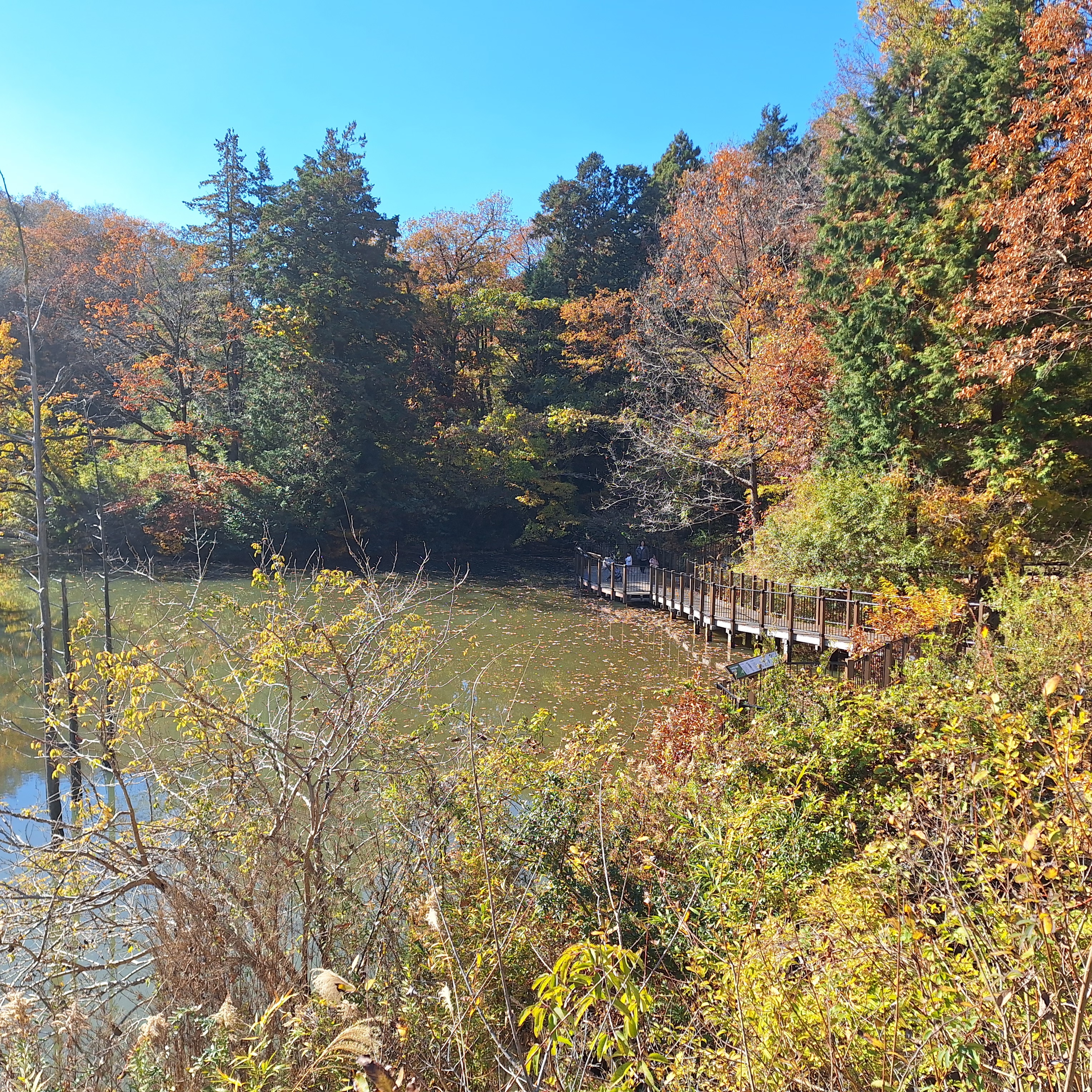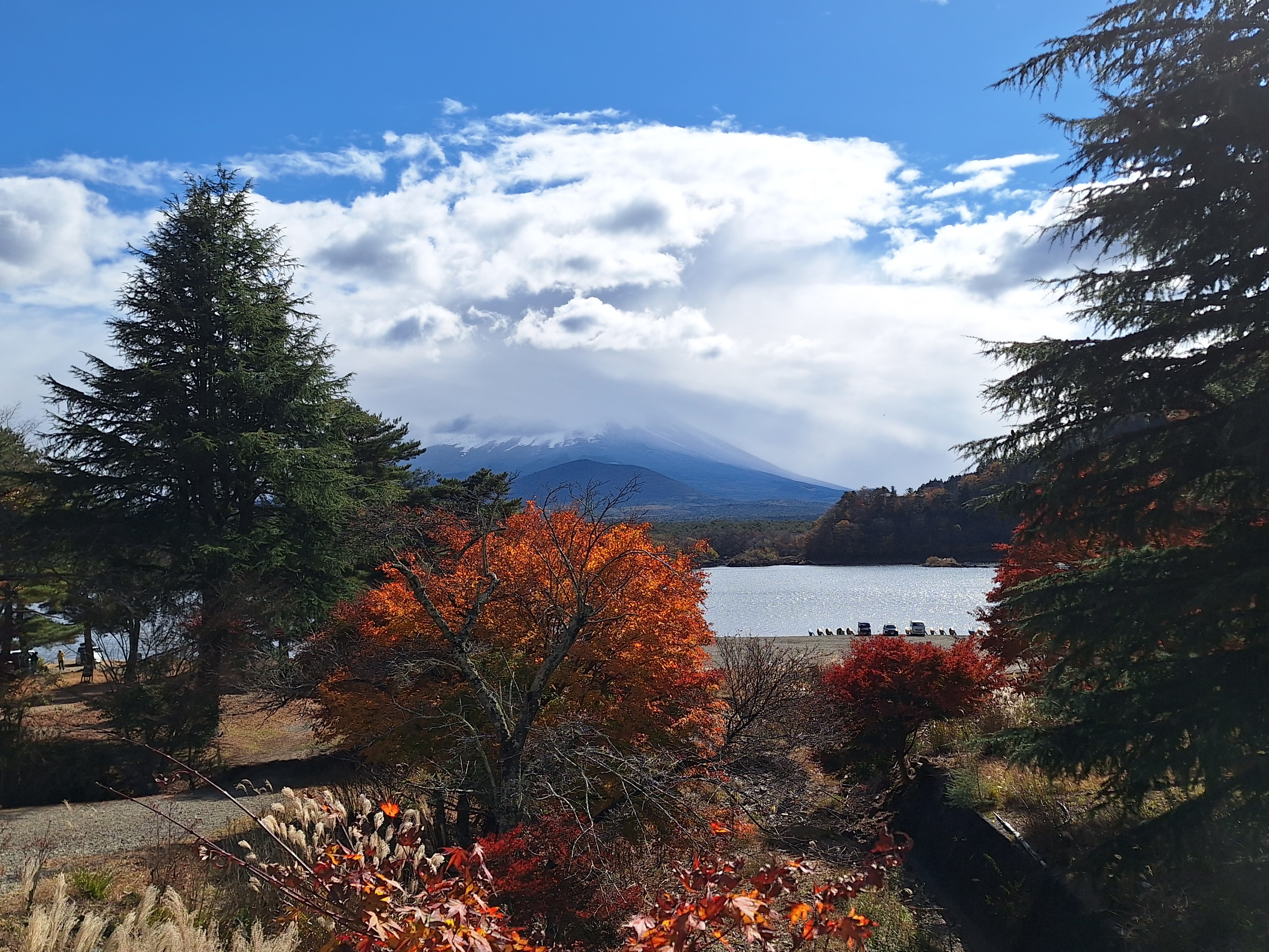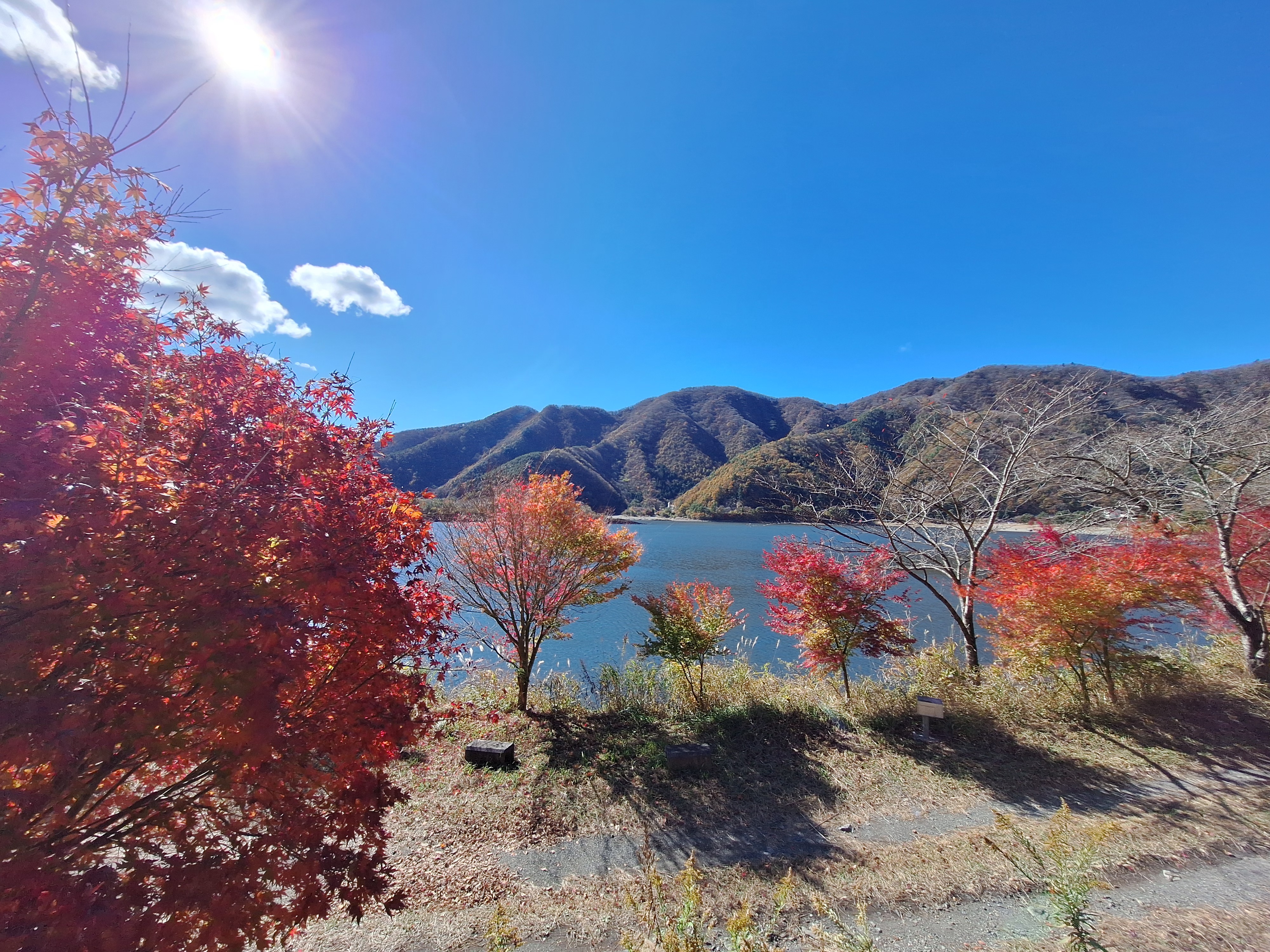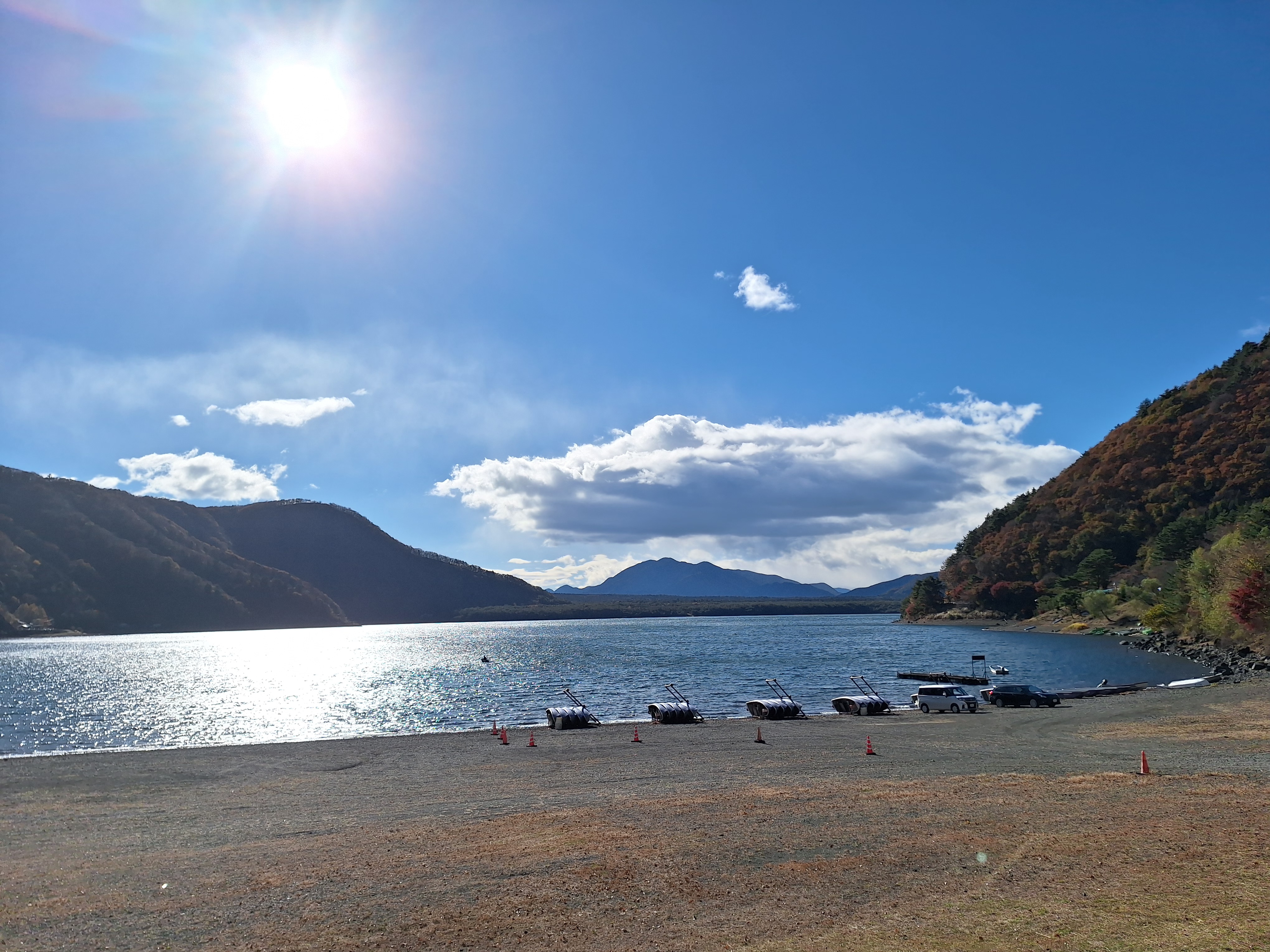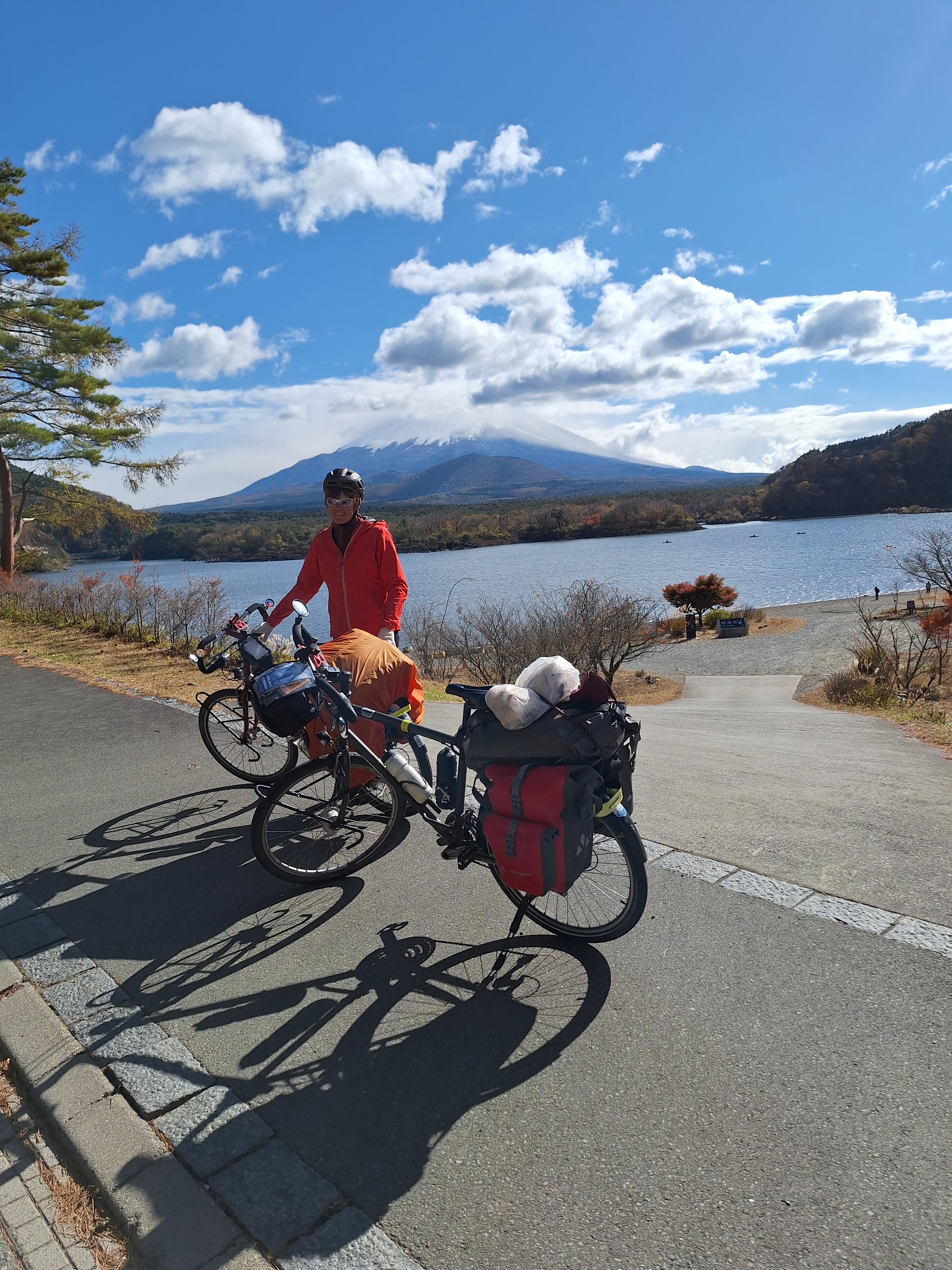 Lac Shoji.Voilà ce que les Japonais appellent Momiji. Les feuilles rouges. Depuis des siècles, c’est une pratique très courante au Japon de chercher les plus belles nuances des feuilles d’automne. Et le ciel est de plus en plus bleu. On a toujours un sac de déchets sur nos sacoches. On aime beaucoup. Le Japon est sûrement l’un des pays les plus propres au monde et on ne voit jamais de poubelles ! Alors tout le monde garde précieusement ses détritus jusqu’au prochain Konbini (supérette) qui, lui, a des poubelles de tri. Heureusement qu’on nous avait annoncé de la pluie ! Ici le Lac SAI qui semble être relié au lac Kawaguchi tant il est proche.Pause déjeuner sur la plage du lac Sai. De l’autre rive.