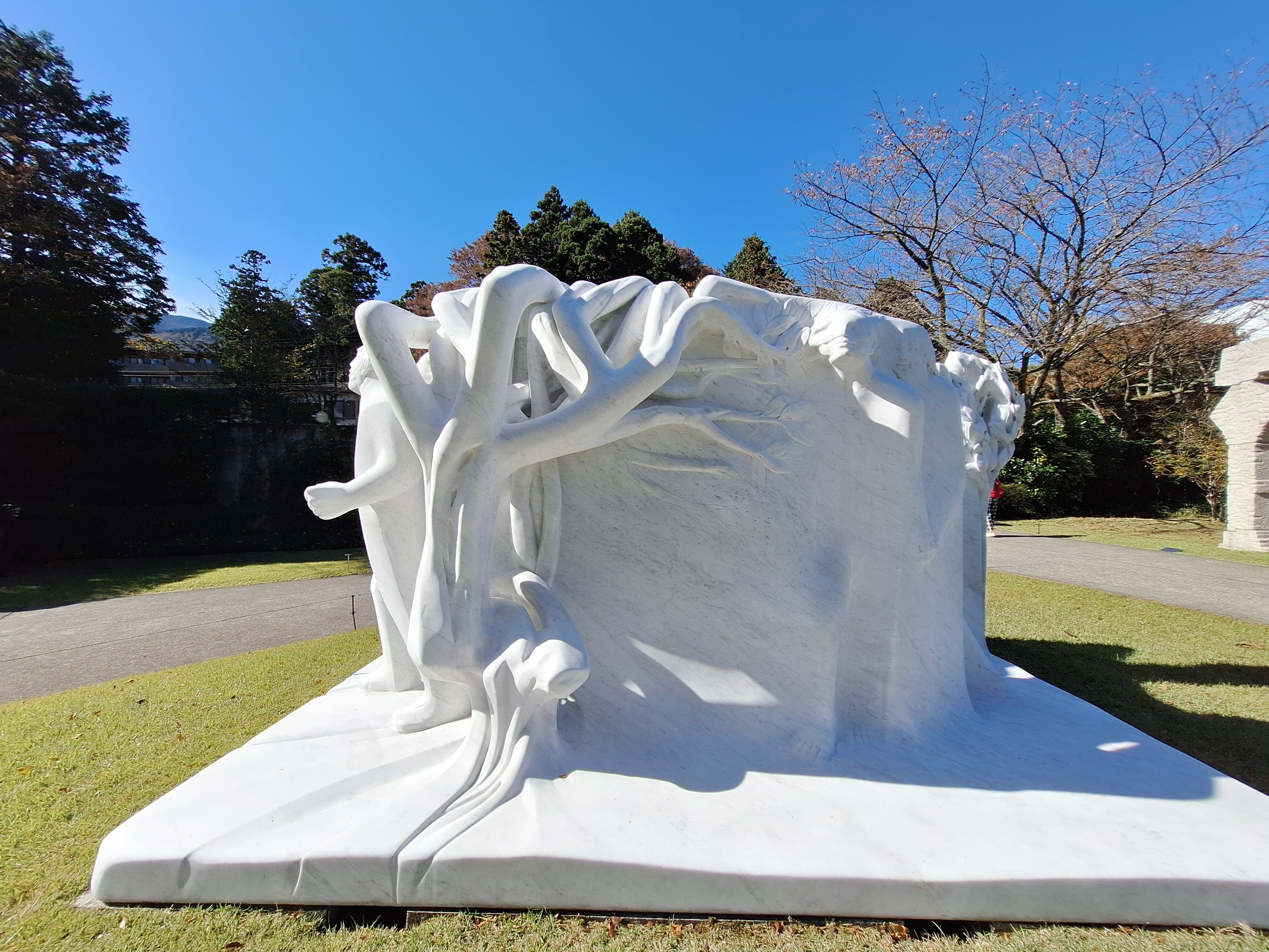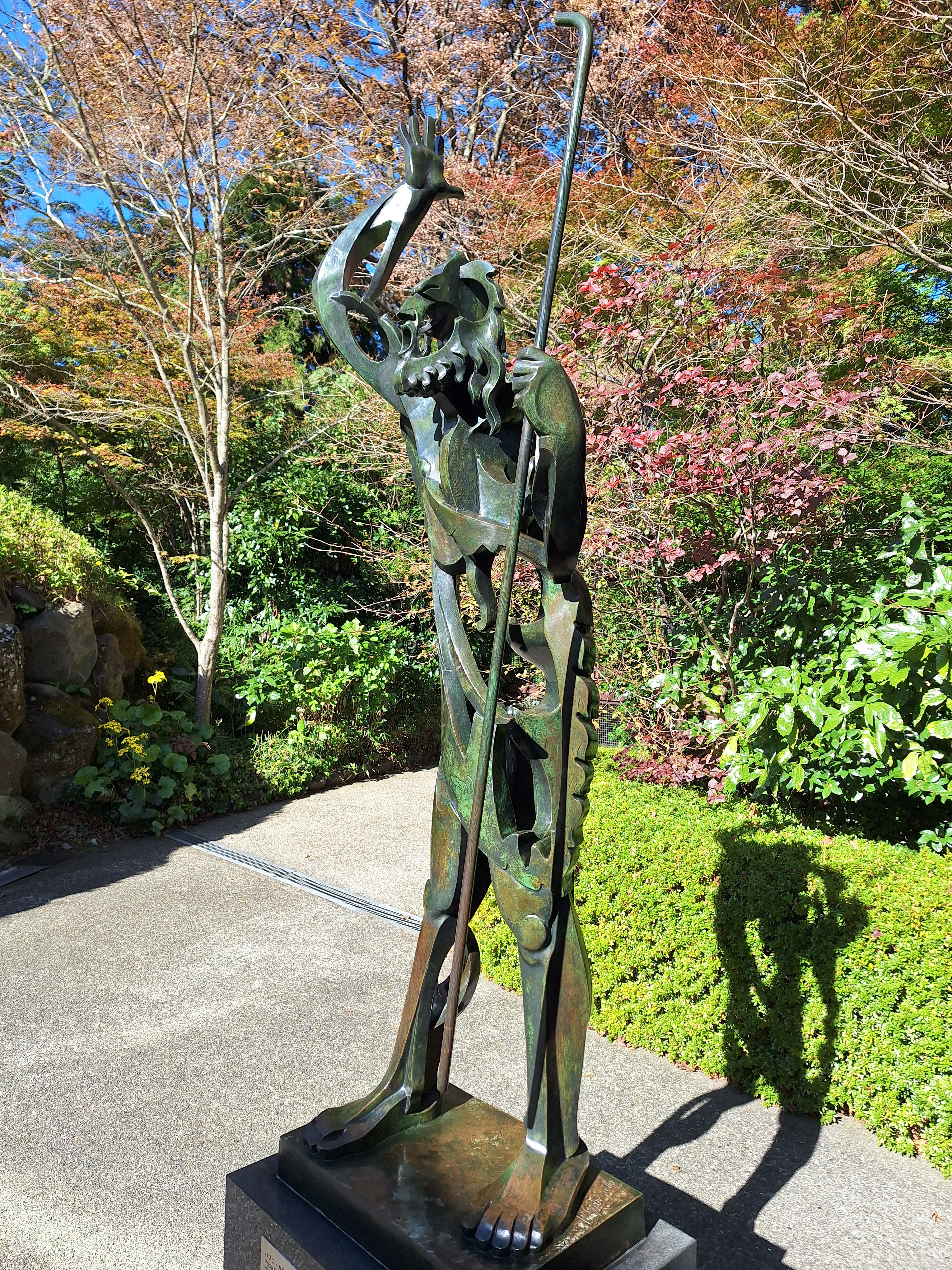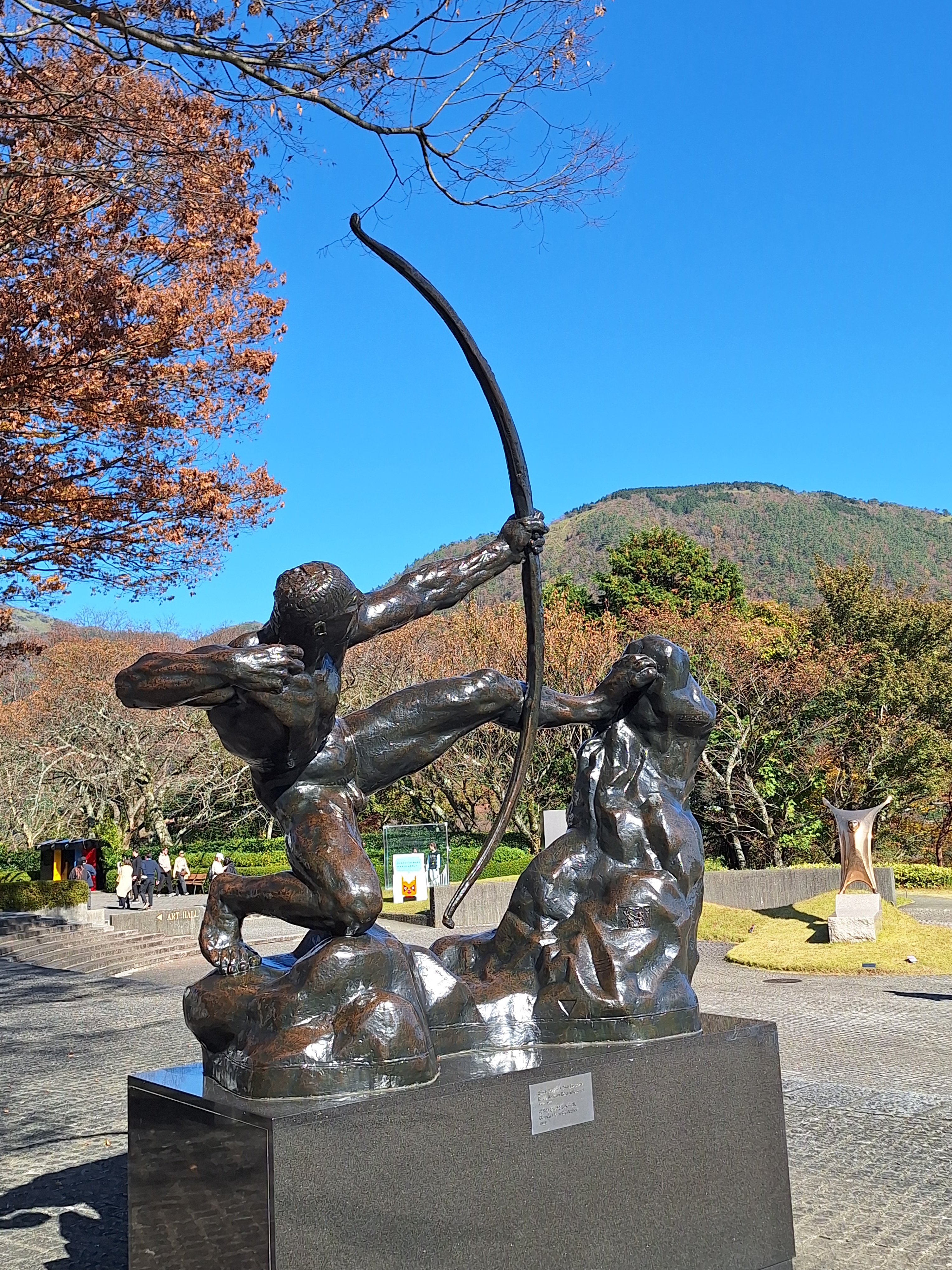 Narcisse tombe amoureux de son propre reflet. Fait par un couple de sculpteurs français M et Mme Lalanne. Il finit par par mourir et renaît sous la forme d’un…narcisse. Pas très drôle. C’est allemand.Des Maillol. Statue en jean de Sato. À partir des années 70, on revêt partiellement des statues de jeans ou de chapeaux. On aime bien le Prophète. Tout y est : La bouche grande ouverte qui harangue les foules, la toge, la barbe, le bras levé vers le divin, l’œil courroucé, le bâton de pèlerin, la silhouette ascétique. Fernand Léger. La fleur qui marche. Derrière une grande part dédiée à des œuvres de Picasso moins connues. Sculptures vivantes. Des bains de pied publics. Tube de lumière.Niki de Saint Phalle et ses œuvres volumineuses. On a failli la manquer.La main de Dieu.On a mis le soleil juste au-dessus pour la touche divine. On bosse.Le jaune est aussi dur que le blanc.Cela ressemble à un grillage composé de 72 hommes en noir et 72 femmes en rouge. Chacun a les pieds et mains liés ensemble. Interdépendance. Solidarité entre les humains ? Dansent-ils? Vangi. Italien. Fait en 2004. L’existence humaine et son sens. Un vieil homme assis devant une grotte. Un visage de femme émerge de sa mémoire. En sortant du passage des tourments, l’homme lève les yeux et avance avec espoir en restant digne.À droite, l’entrée de la vie qui devient de plus en plus étroite à mesure qu’on avance. Symbole des tourments de la vie. Un olivier et son feuillage luxuriant. Cohabitation entre les humains et la nature. Heraclès, un monsieur tout en muscles. Sculptures françaises d’Antoine Bourdelle. Les quatre vertus. La volonté, la victoire, la liberté et l’éloquence. On a photographié seulement la liberté et l’éloquence. Un Pégase aérien.PanoramaDans la rue principale, une enseigne attire notre attention. Que fait Utrillo à Hakone? C’est la mère du propriétaire, avec qui on a échangé, qui collectionnait des œuvres de Utrillo et de Suzanne Valadon, la mère du peintre, dont on a vu les tableaux à Metz lors de notre périple sur la Voie Bleue . (article 10 fin de la voie bleue).