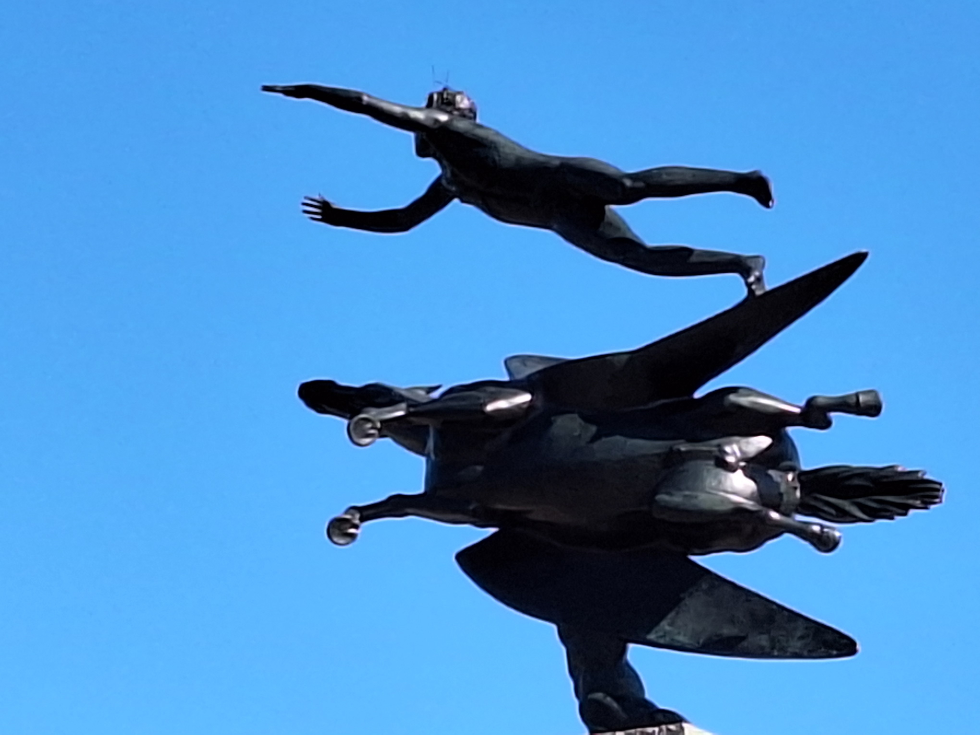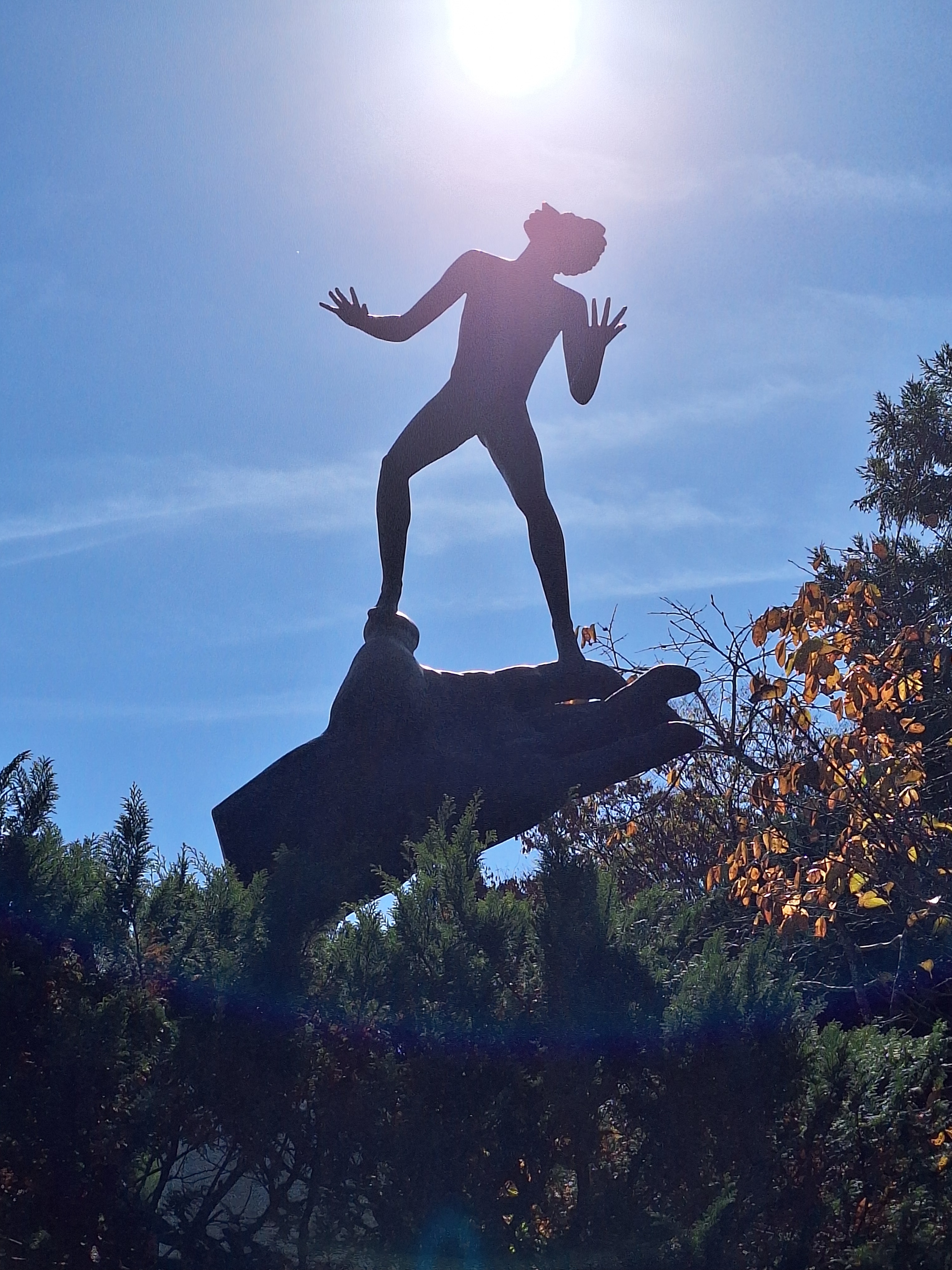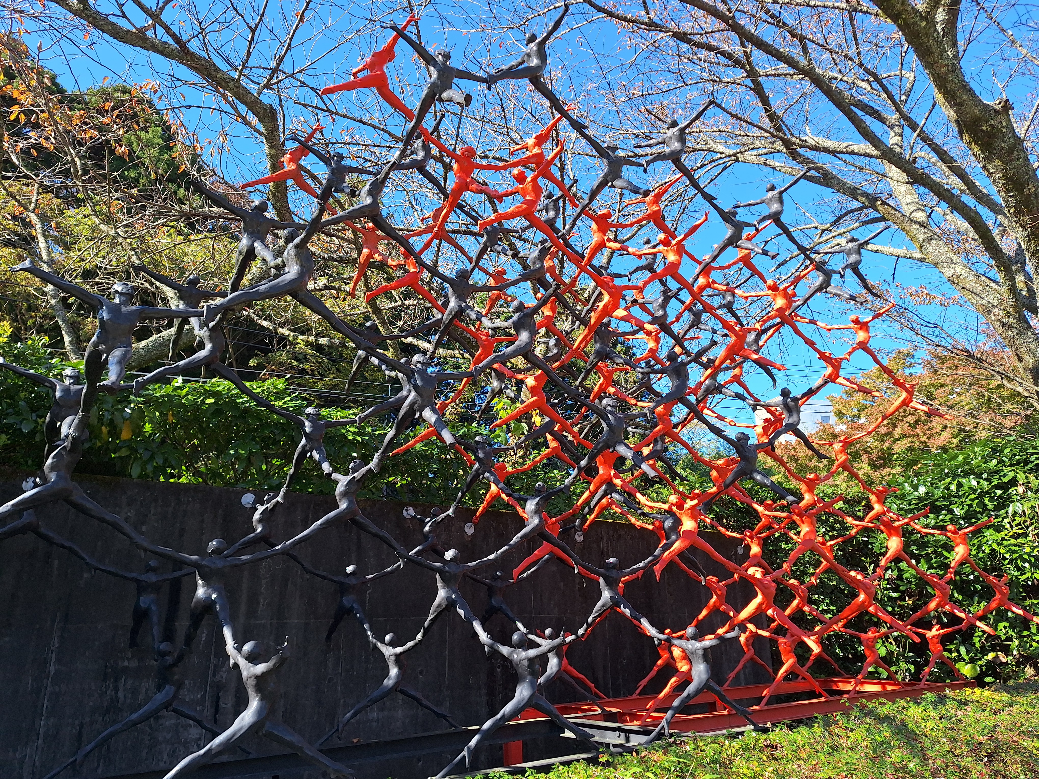 Narcisse tombe amoureux de son propre reflet. Fait par un couple de sculpteurs français M et Mme Lalanne. Il finit par par mourir et renaît sous la forme d’un…narcisse. Pas très drôle. C’est allemand.Des Maillol. Statue en jean de Sato. À partir des années 70, on revêt partiellement des statues de jeans ou de chapeaux. On aime bien le Prophète. Tout y est : La bouche grande ouverte qui harangue les foules, la toge, la barbe, le bras levé vers le divin, l’œil courroucé, le bâton de pèlerin, la silhouette ascétique. Fernand Léger. La fleur qui marche. Derrière une grande part dédiée à des œuvres de Picasso moins connues. Sculptures vivantes. Des bains de pied publics. Tube de lumière.Niki de Saint Phalle et ses œuvres volumineuses. On a failli la manquer.La main de Dieu.On a mis le soleil juste au-dessus pour la touche divine. On bosse.Le jaune est aussi dur que le blanc.Cela ressemble à un grillage composé de 72 hommes en noir et 72 femmes en rouge. Chacun a les pieds et mains liés ensemble. Interdépendance. Solidarité entre les humains ? Dansent-ils? Vangi. Italien. Fait en 2004. L’existence humaine et son sens. Un vieil homme assis devant une grotte. Un visage de femme émerge de sa mémoire. En sortant du passage des tourments, l’homme lève les yeux et avance avec espoir en restant digne.À droite, l’entrée de la vie qui devient de plus en plus étroite à mesure qu’on avance. Symbole des tourments de la vie. Un olivier et son feuillage luxuriant. Cohabitation entre les humains et la nature. Heraclès, un monsieur tout en muscles. Sculptures françaises d’Antoine Bourdelle. Les quatre vertus. La volonté, la victoire, la liberté et l’éloquence. On a photographié seulement la liberté et l’éloquence. Un Pégase aérien.PanoramaDans la rue principale, une enseigne attire notre attention. Que fait Utrillo à Hakone? C’est la mère du propriétaire, avec qui on a échangé, qui collectionnait des œuvres de Utrillo et de Suzanne Valadon, la mère du peintre, dont on a vu les tableaux à Metz lors de notre périple sur la Voie Bleue . (article 10 fin de la voie bleue).