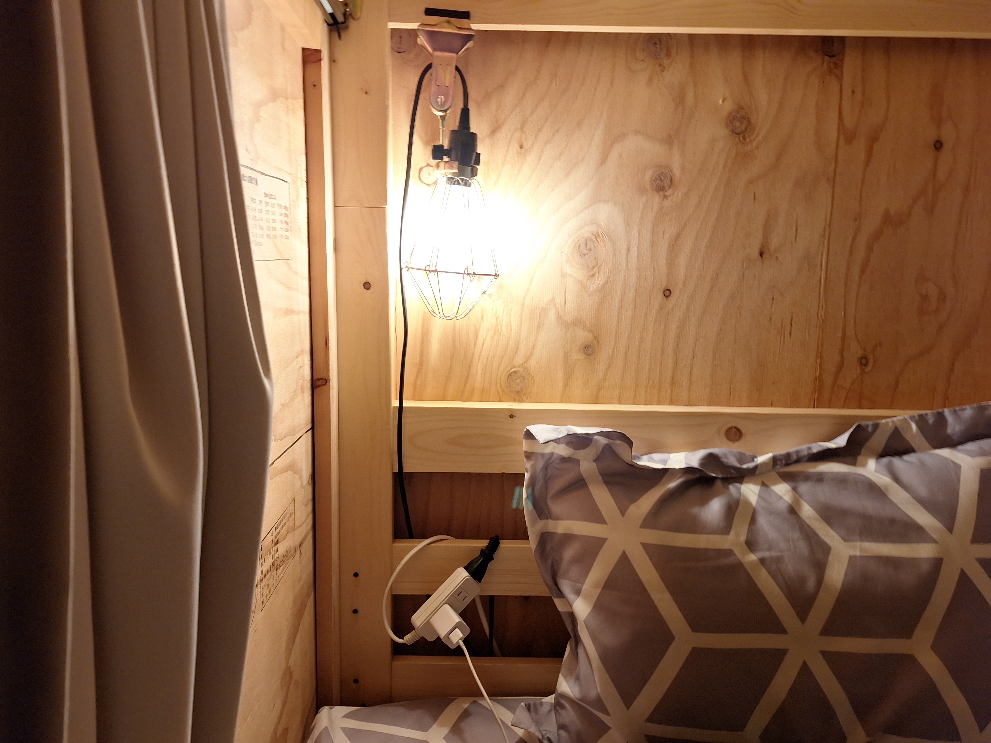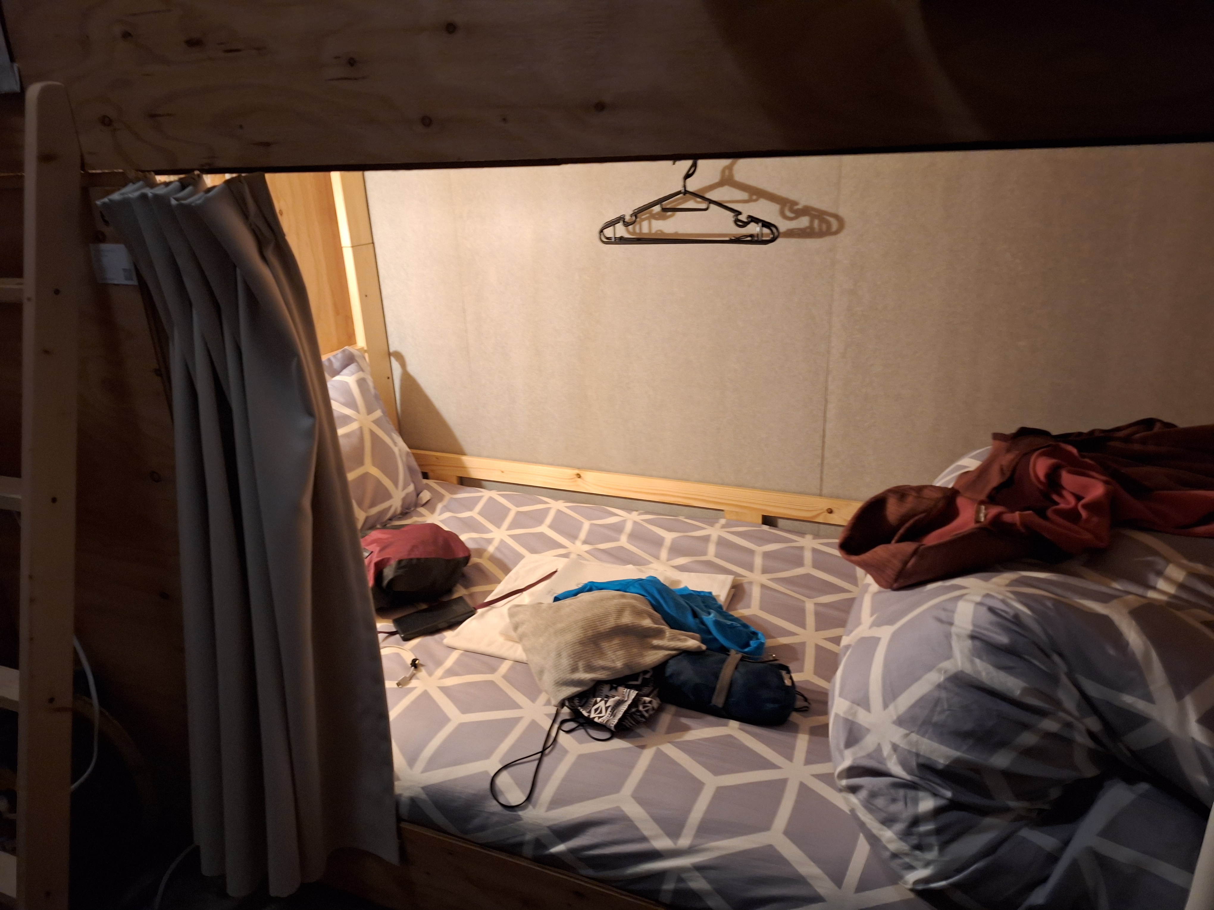À chaque lit, une lumière et des prises électriques. Un rideau et toujours une bonne literie.La penderie…un peu rustique mais nous on laisse tout dans les sacoches. Il y a les douches avec toujours savon et shampooing à volonté. Un coin cuisine et une salle commune. Chacun est respectueux de l’autre et on n’a jamais eu de nuisance sonore.