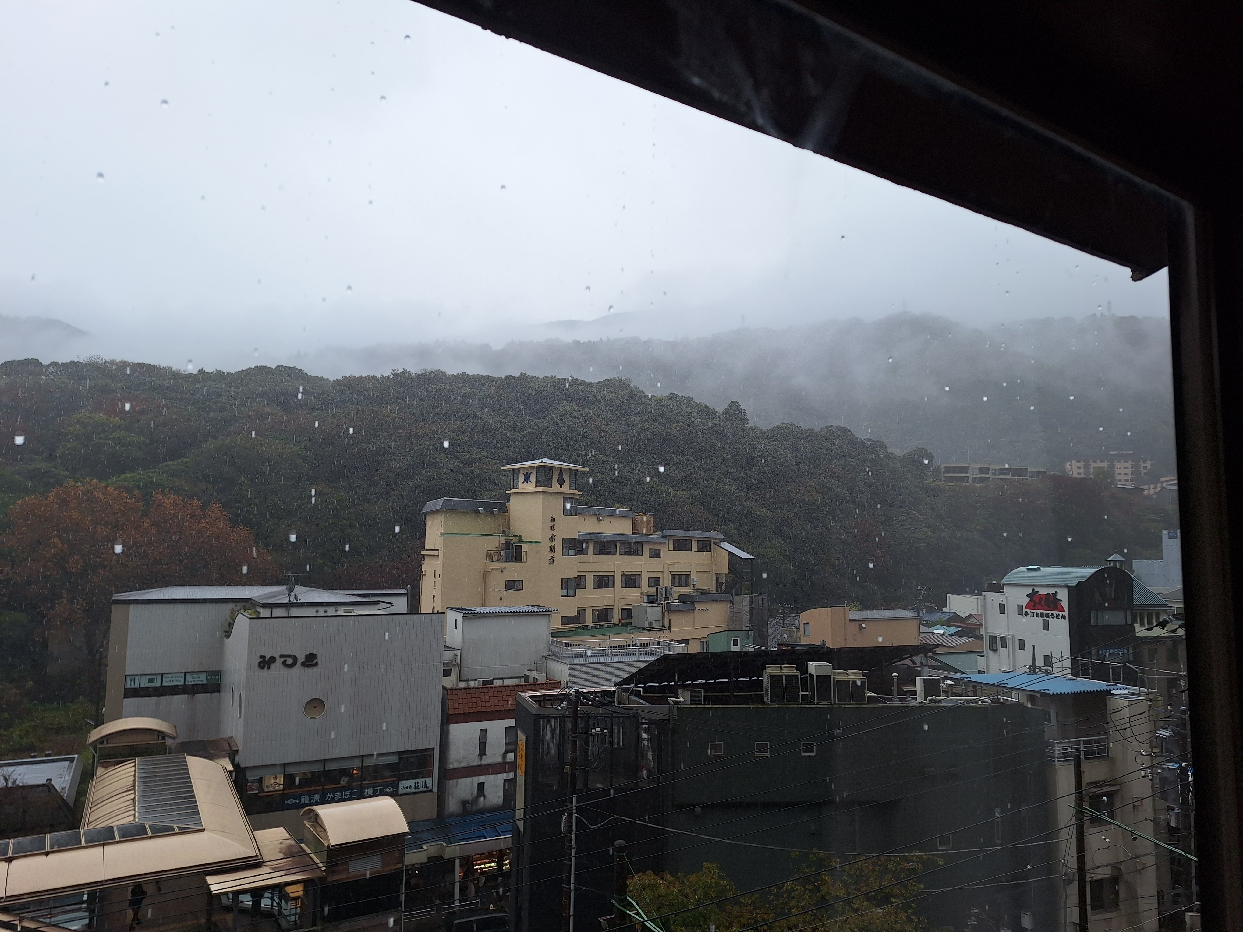 On pourrait vous dire que le lac d’Ashi près de Hakone fréquenté par 19 millions de touristes japonais chaque année est une pure merveille parce que sombres forêts, parce que Fuji en arrière plan, parce que majesté des volcans qui le bordent. On pourrait. Mais c’est seulement de la littérature. On n’a rien vu de tout ça . C’était notre journée déluge. Alors, pour la première fois depuis le 3 août, on n’a rien fait ! Seulement profiter de l’hôtel, après les trois nuits de bivouac, qui possédait un onsen extérieur et ça, être dans l’eau à 45 degrés avec Debussy en fonds musical quand tout autour sévissent la tempête et les températures très basses, c’est super. On aime bien le déluge…quand on n’est pas sur les vélos.
