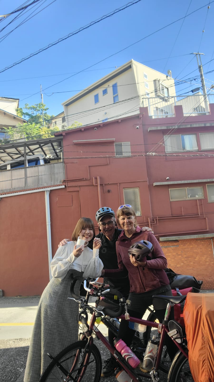 Et puis on a eu la chance d’être hébergés deux nuits chez Katashi et Yochiko via le site Warmshowers. Un couple dans nos âges qui a fait, entre autres voyages, près de deux ans de périple à vélo autour du monde en 2011. On s’est sentis accueillis comme si on se connaissait depuis longtemps. Leur maison étant dans le grand Tokyo, on a laissé nos bagages dans la guest house de la nuit précédente, ne prenant qu’une sacoche avec nous, et les vélos sur un parking …à vélos. On retrouvera le tout sans problème. On a pris un train pour les rejoindre.
