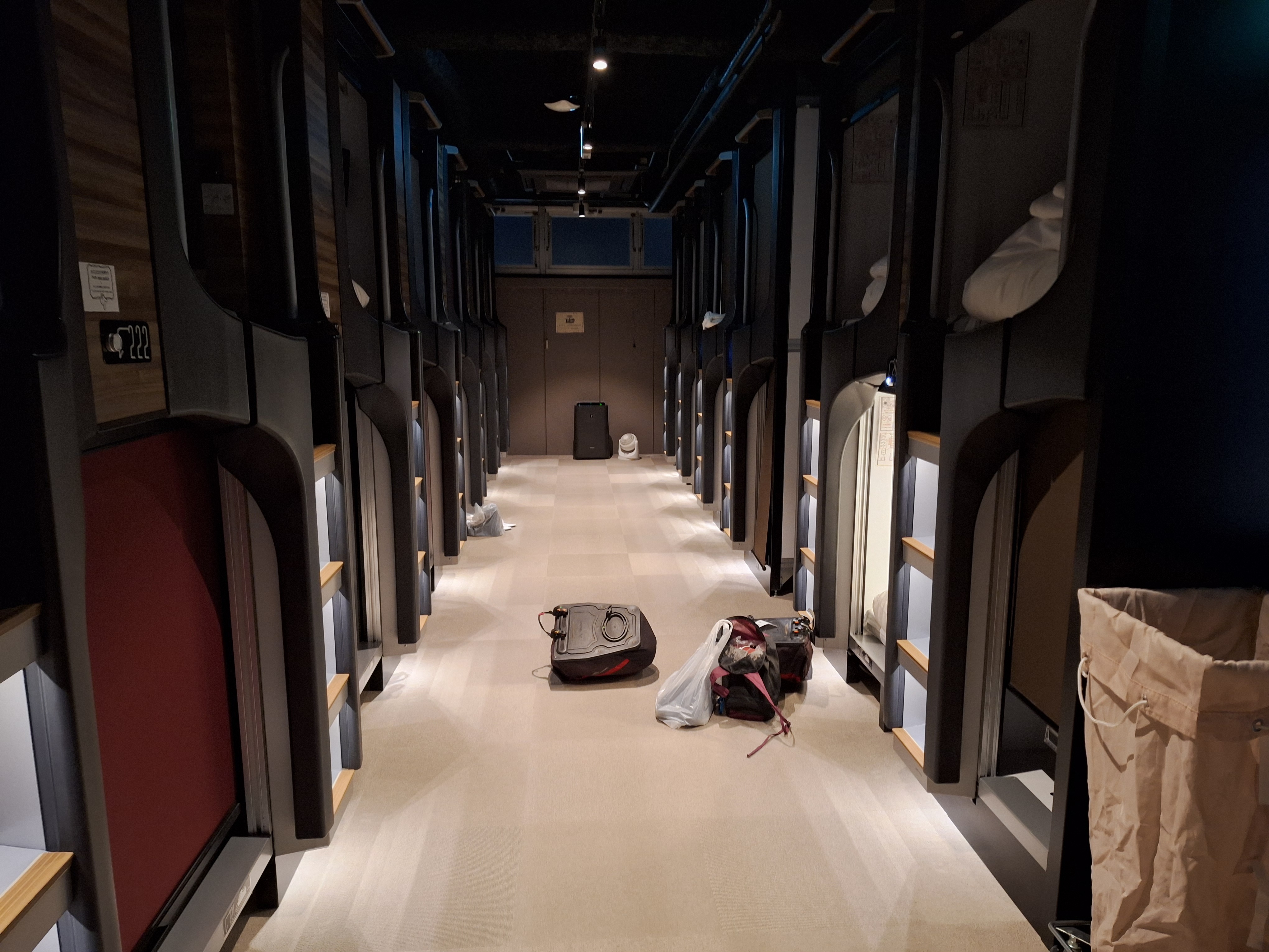 Les sacoches devant mon antre. Tout est très propre. Les pantoufles, fournies, me permettent de localiser mes voisines d’un soir. Que des Japonaises. Echelles éclairées. Capsules sur deux niveaux.