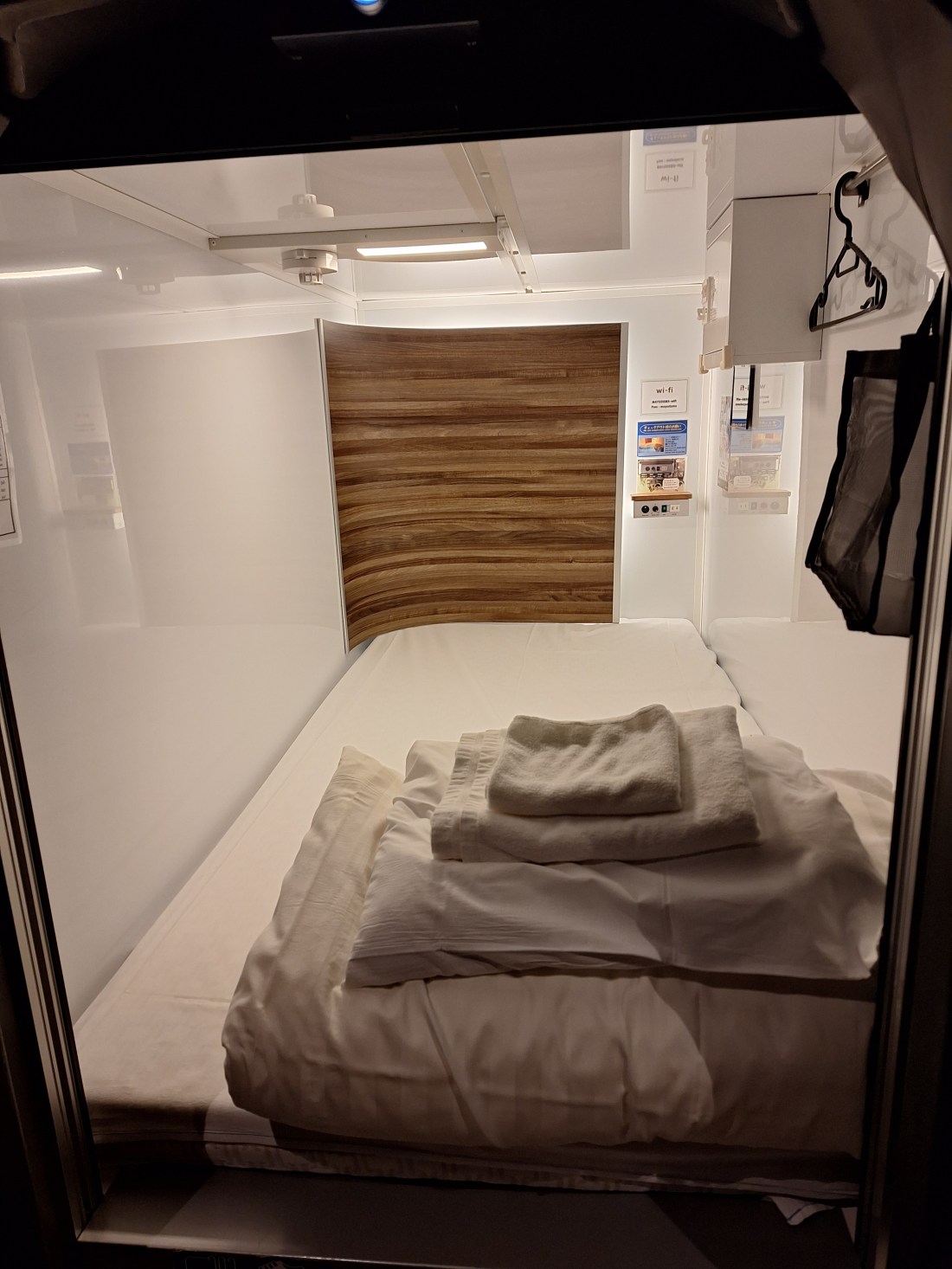 On s’était dit qu’on testerait au moins une fois un hôtel capsule, logement typique du Japon. Ils ne sont peut-être pas tous faits exactement de la même manière alors précisons que celui dont on va parler est à Yokohama. La nuit pour deux personnes a coûté 47 €. Chacun dans sa capsule et dans son couloir. Ici pas de mélange des genres.