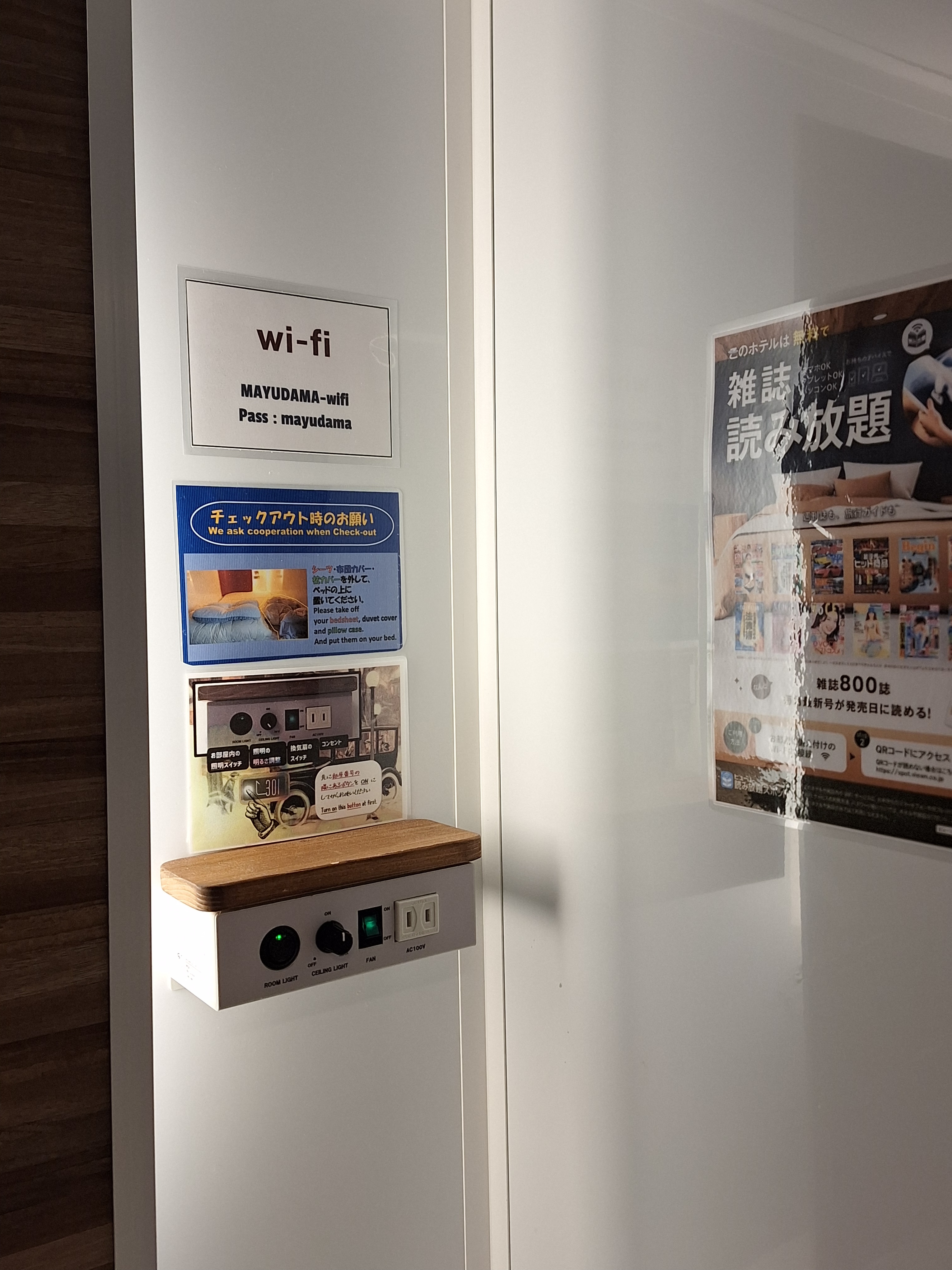 Contrairement à certains hébergements où on entre sans voir personne, ici il y a quelqu’un à l’accueil, serviable et sympathique, pléonasme au Japon, qui nous donne un numéro pour la consigne et un numéro à taper sur un clavier électronique pour accéder au couloir des lits et aux sanitaires.