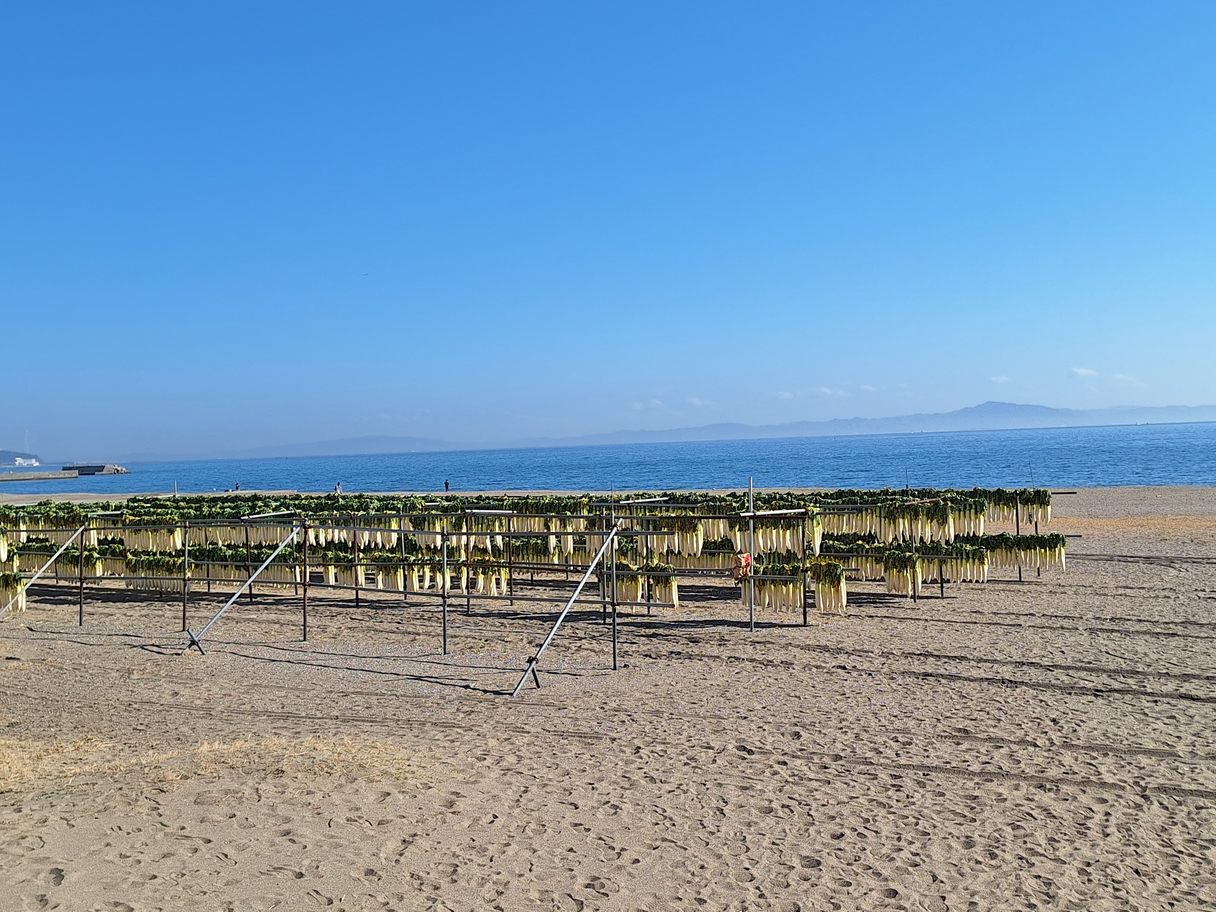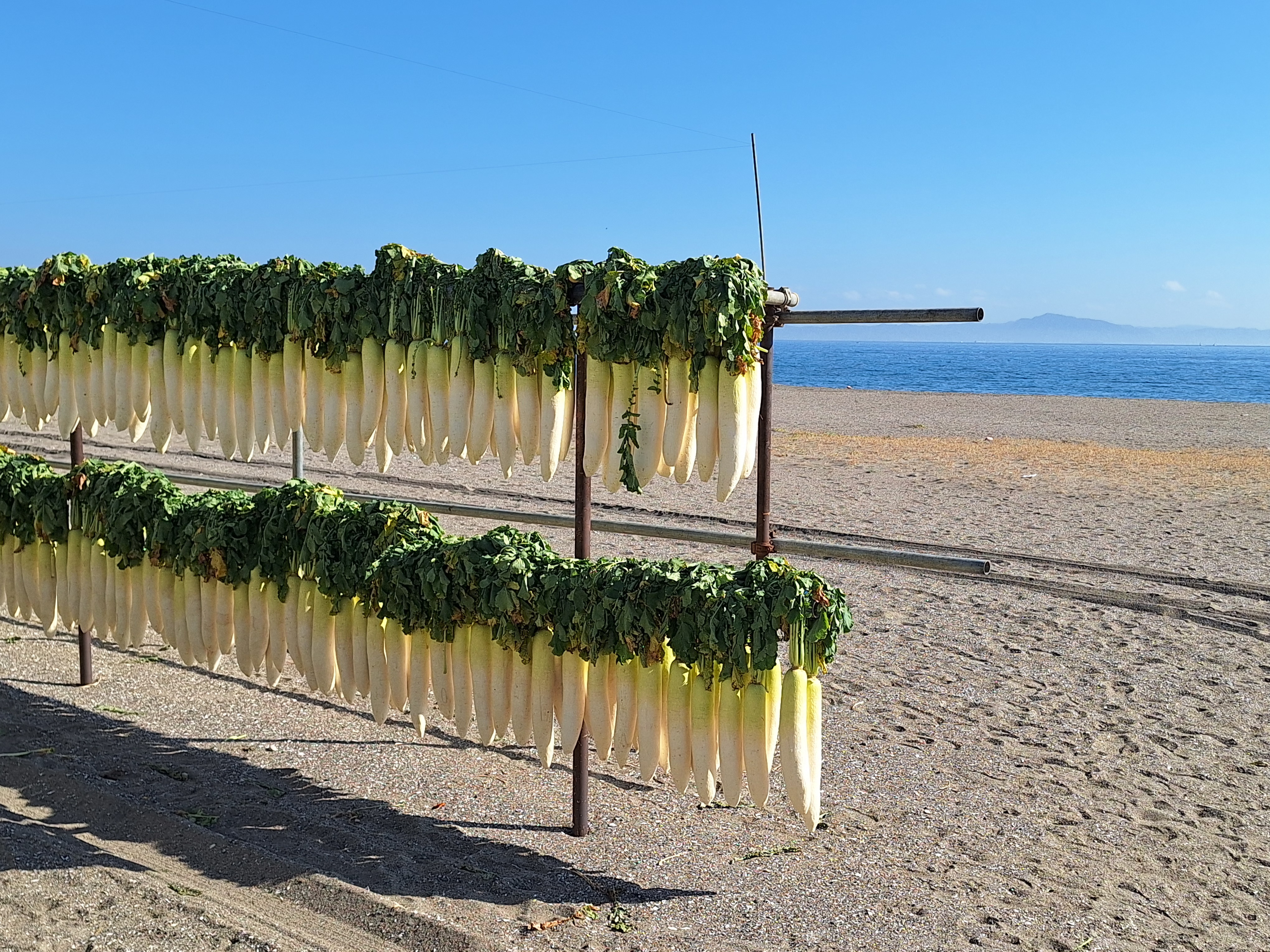 Voilà l’intérieur. Ventilation. Deux serviettes fournies, à l’accueil on pouvait se servir en brosse à dents, dentifrice et brosse à cheveux. Toujours savon et shampooing à volonté. Toujours des sèche cheveux. Les Japonais se lavent les cheveux tous les jours. A la tête du lit, deux types de lumière modulable, prises électriques, wifi et petite étagère. Côté penderie, on fait dans le dépouillé : un cintre et un sac. Ça suffit. Les bagages sont déposés à l’entrée du couloir. J’ai fermé la porte. Le bouton lumineux permet d’éteindre les lumières intérieures sans avoir à replonger dedans. Mais il y a aussi des lieux collectifs. Tout en haut la terrasse avec salon, et au même niveau, une salle très sympa avec bouilloire, micro-ondes, réfrigérateur et tables. Oui, on en aura GOOD memories….on ne fera qu’une nuit parce qu’on a trouvé moins cher ailleurs en dortoir, ce qui ne fait pas une grande différence d’hébergement. Radis blanc on the beach.