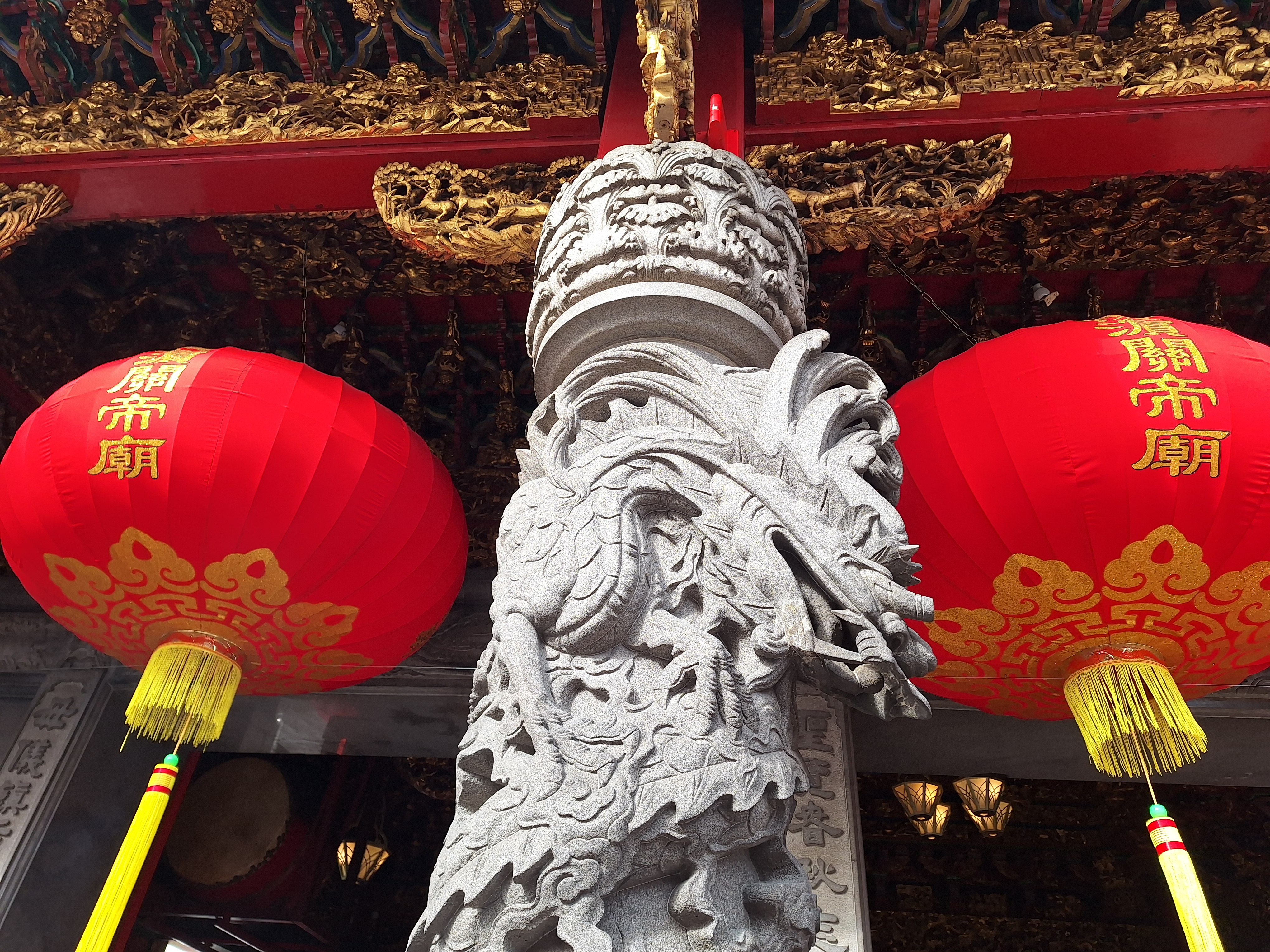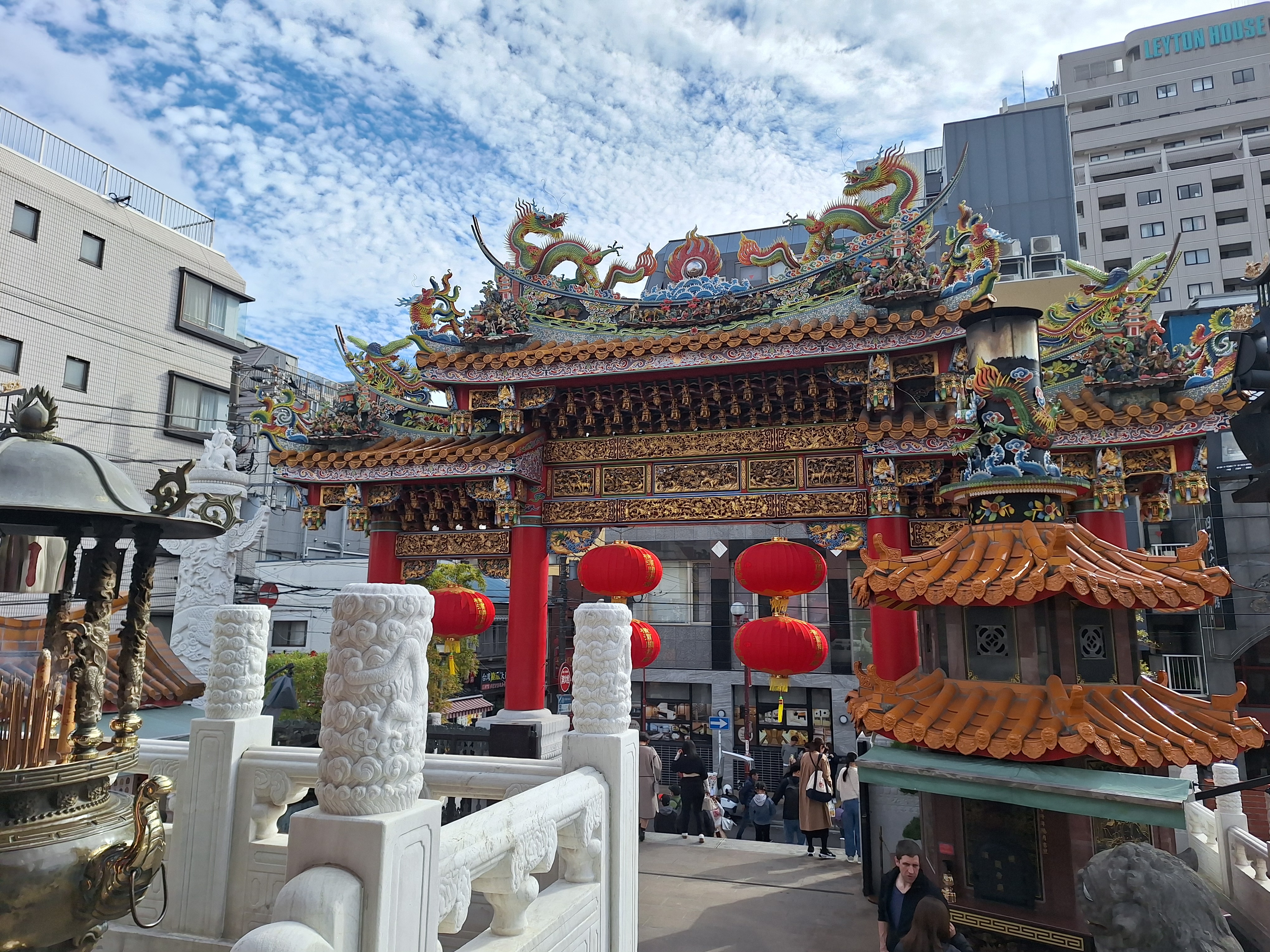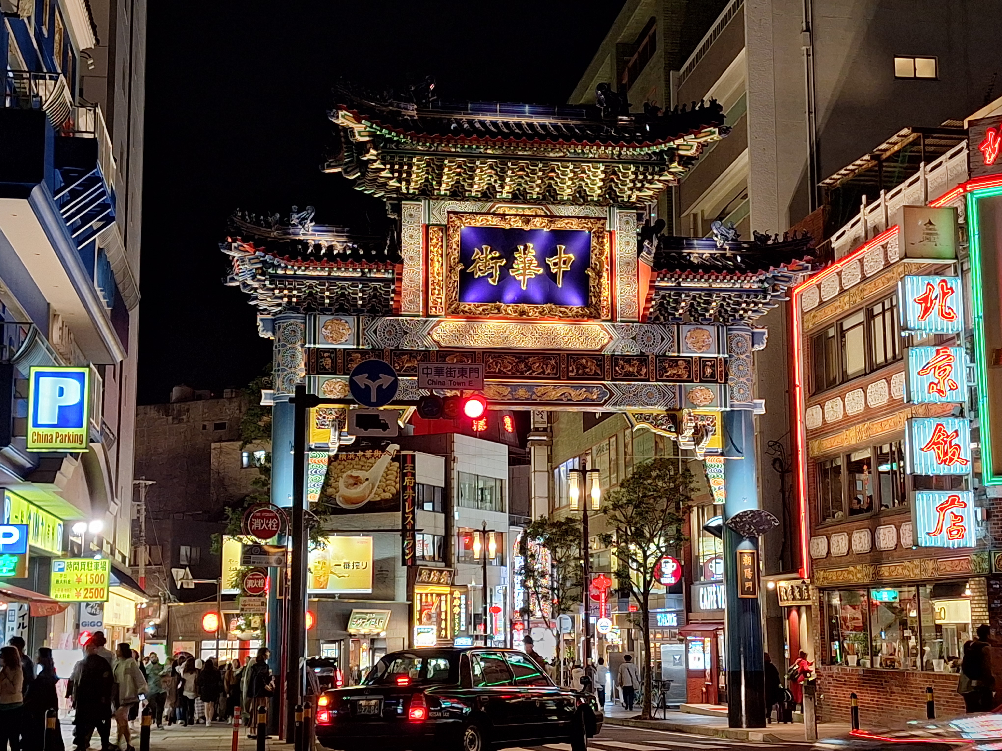 Des centaines de restaurants et de boutiques.Détail d’un pilier du sanctuaire Kanteybyo où le dragon, grâce au travail ciselé de la serpentine et de ses parties ajourées, semble vouloir s’en échapper.Vue du port la nuit. On y a même croisé Batman à l’entraînement.Navire école.
