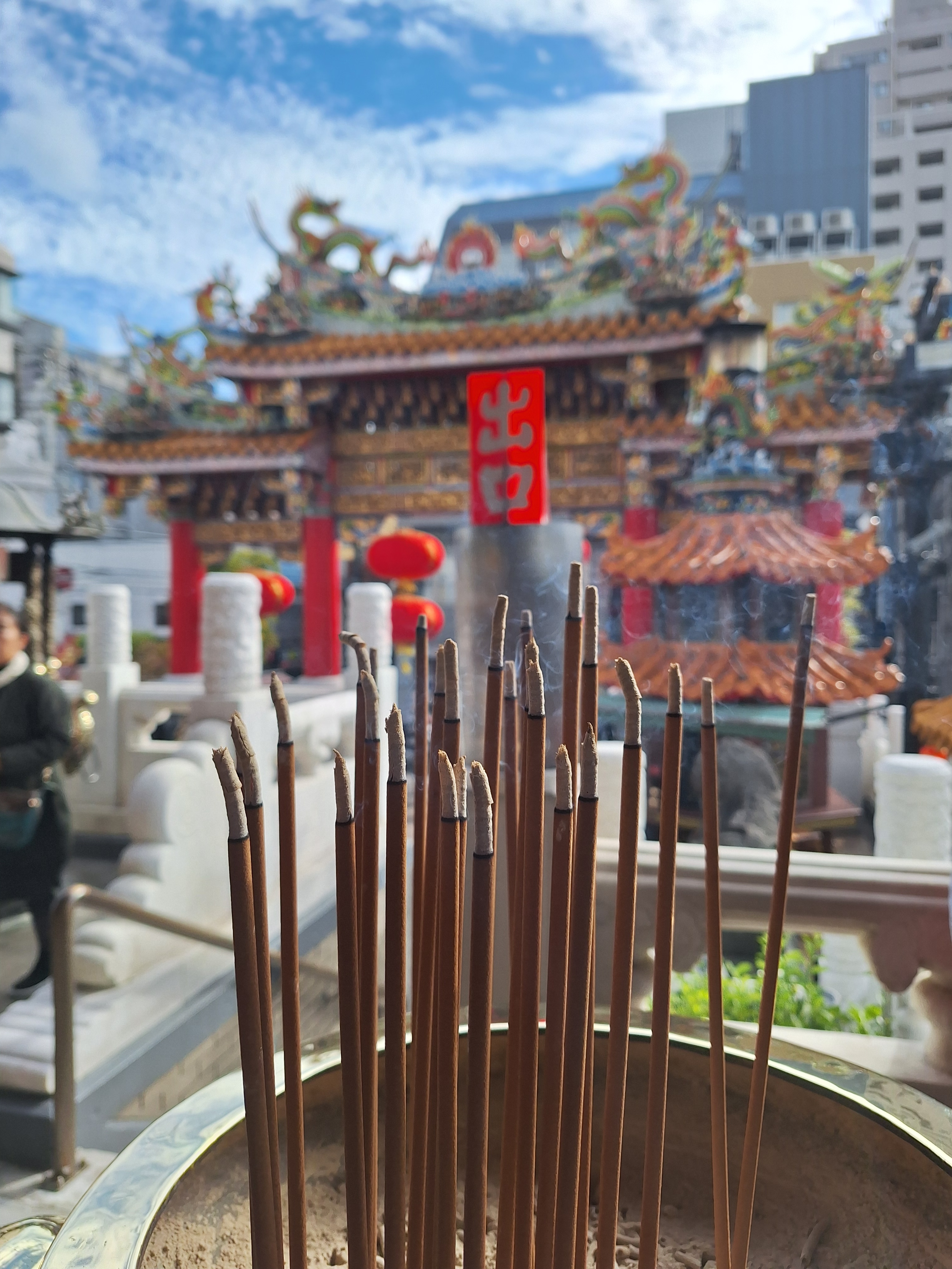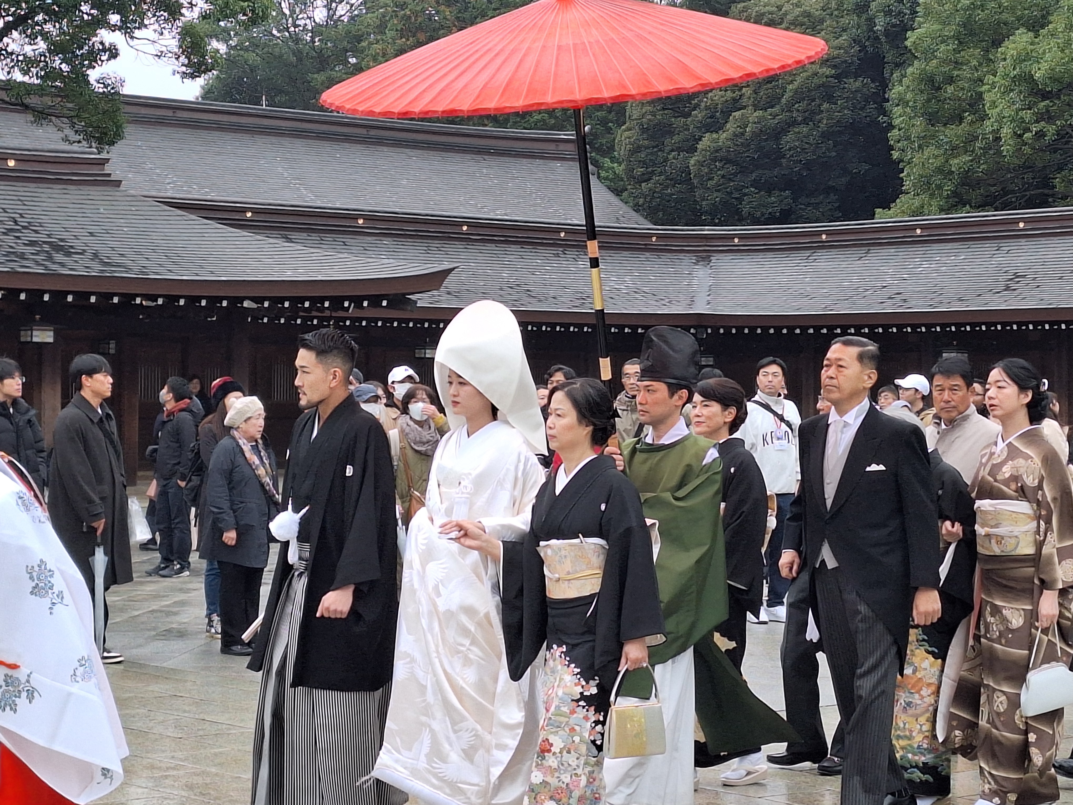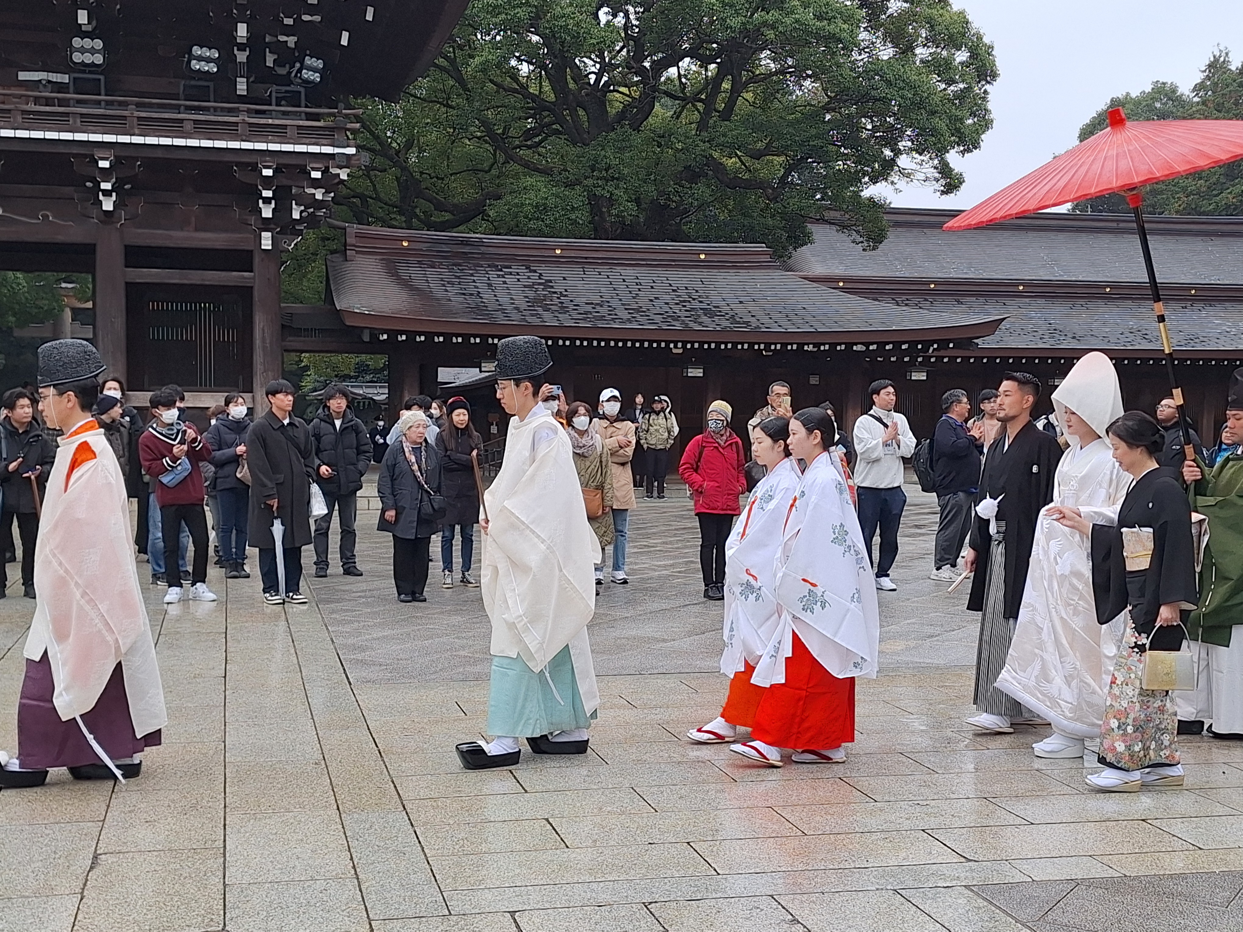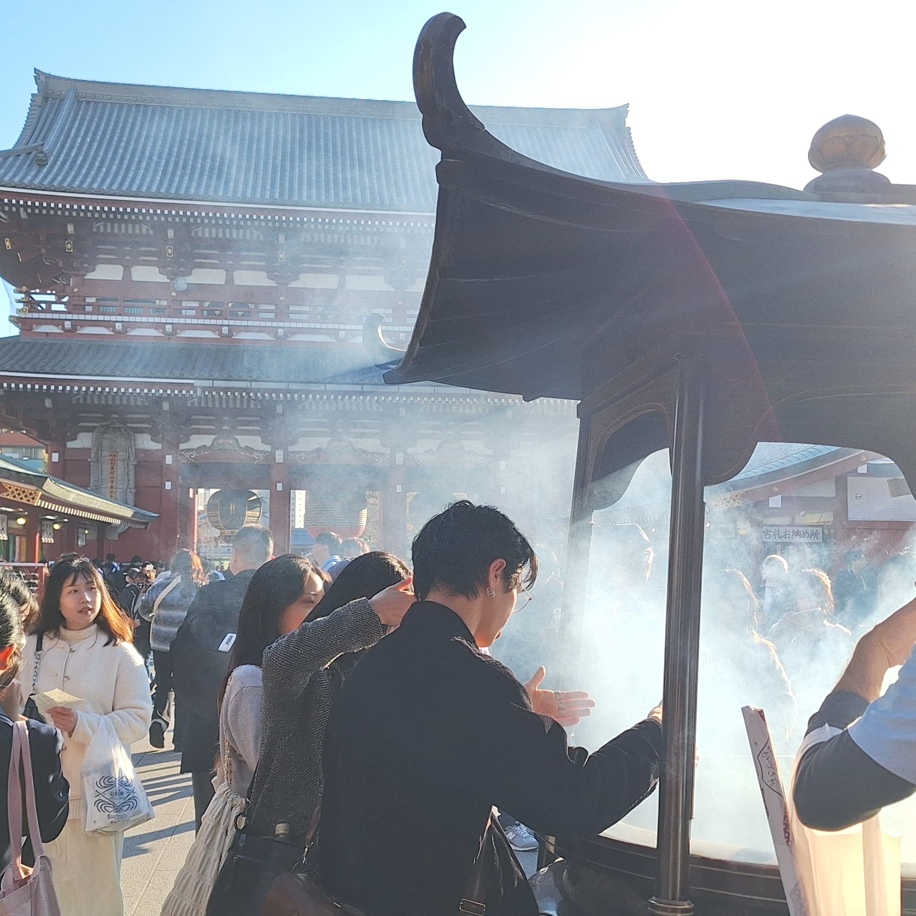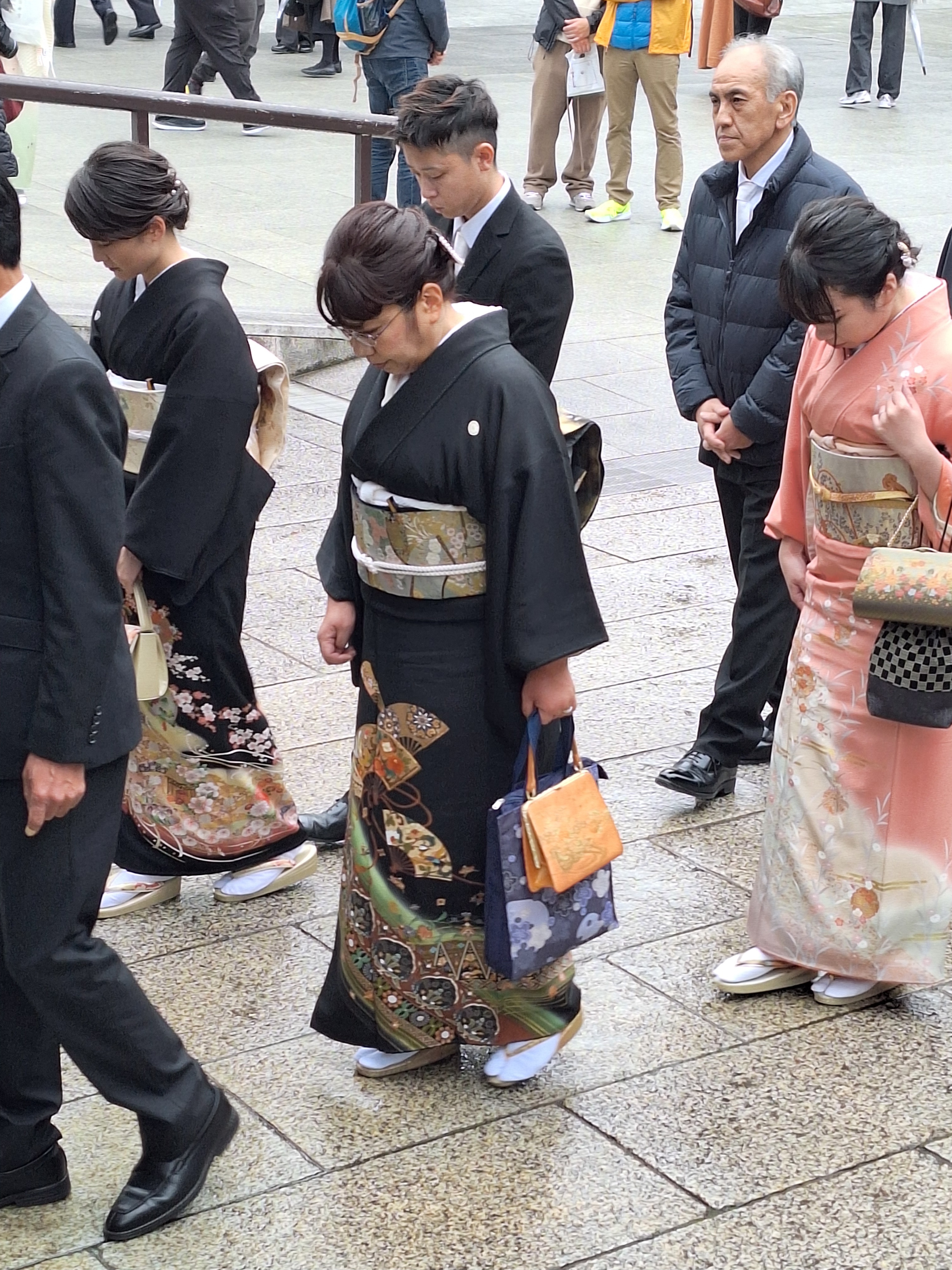 En plein cœur de Tokyo, une forêt mène au temple Sensoji, le plus vieux temple de Tokyo.On plonge les mains dans les fumées d’encens qu’on ramène vers soi ou sur une partie précise de son corps afin d’être protégé.Mariage. On les trouve tous bien sérieux.Superbes kimonos des invitées.Trop craquant.